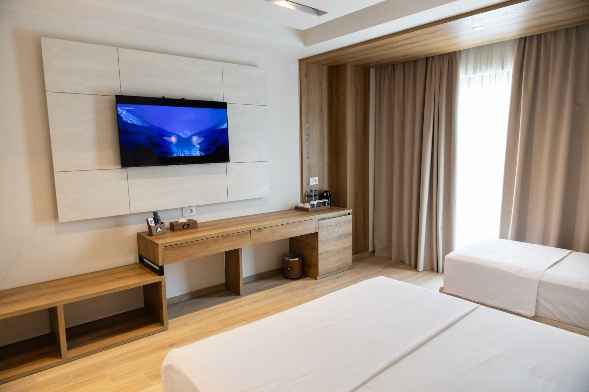 Kahden hengen huone parvekkeella tai terassilla. Yksi parivuode tai kaksi parivuodetta. Lisävuodemahdollisuus yhden hengen vuoteesta. Maksuton wifi, ilmastointi ja tallelokero. Minibaari. Tv kansainvälisillä kanavilla. Hiustenkuivain. Amme tai suihku ja wc. Siivous 7 krt/viikko.