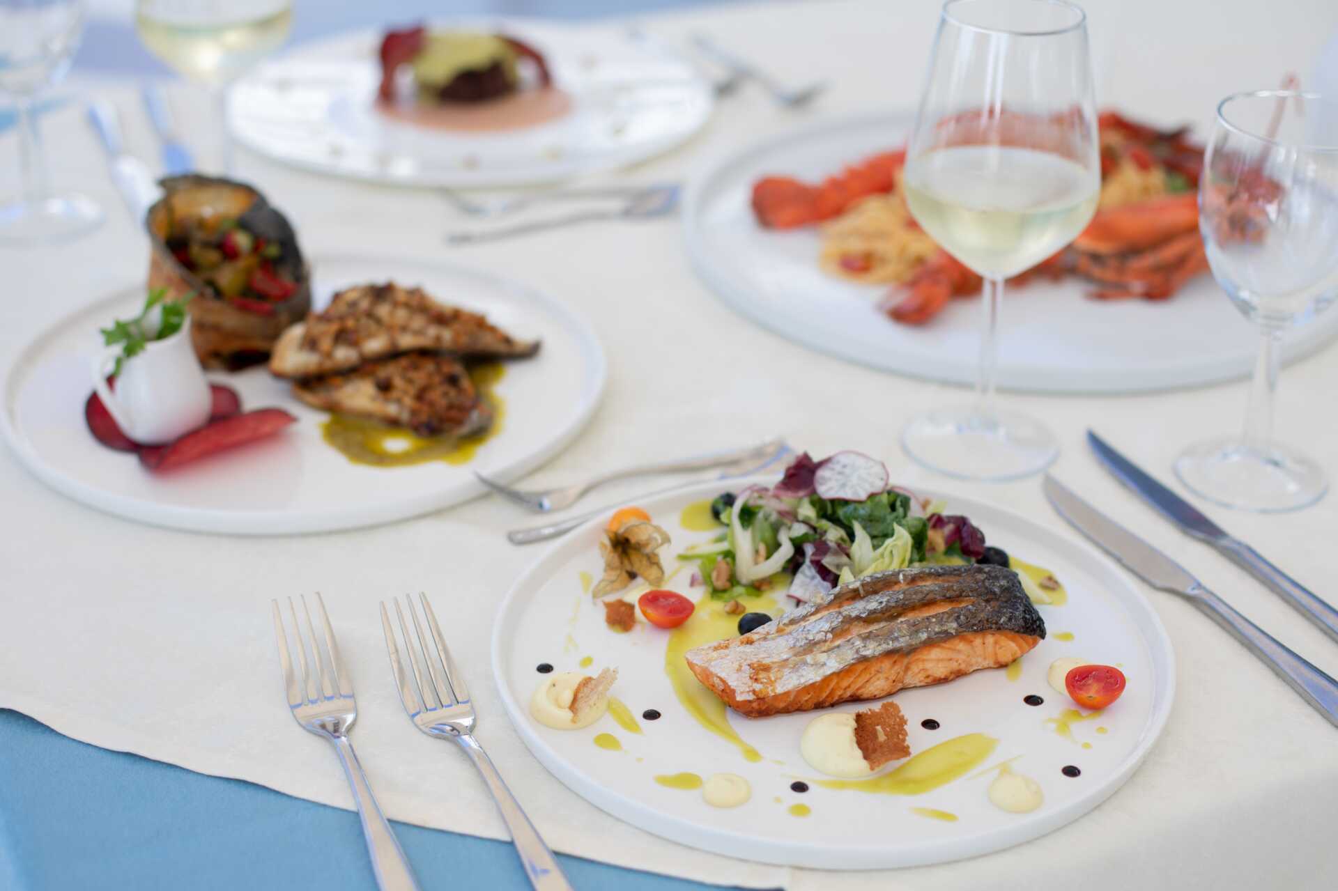 Grand Blue Fafa Resort & Spassa on kaksi ravintolaa. Buffetravintola Le Capissa voit syödä aamupalan, lounaan ja illallisen. Parina iltana viikossa on kevyttä viihdettä illallisen jälkeen. Hotellissa on myös à la carte -ravintola, joka on erikoistunut mereneläviin ja italialaisiin erikoisuuksiin. Ravintolasta on kaunis merinäköala, ja siellä tarjoillaan sekä paikallisia viinejä että viinejä naapurimaista, kuten Kosovosta ja Pohjois-Makedoniasta. Hotellin aulabaarissa voit nauttia herkullisia juomia tai suunnata rantabaariin nauttimaan drinkin kauniin näköalan äärellä.