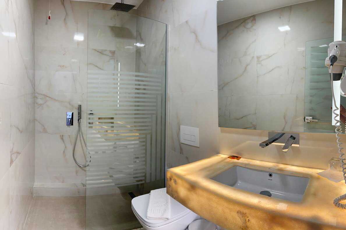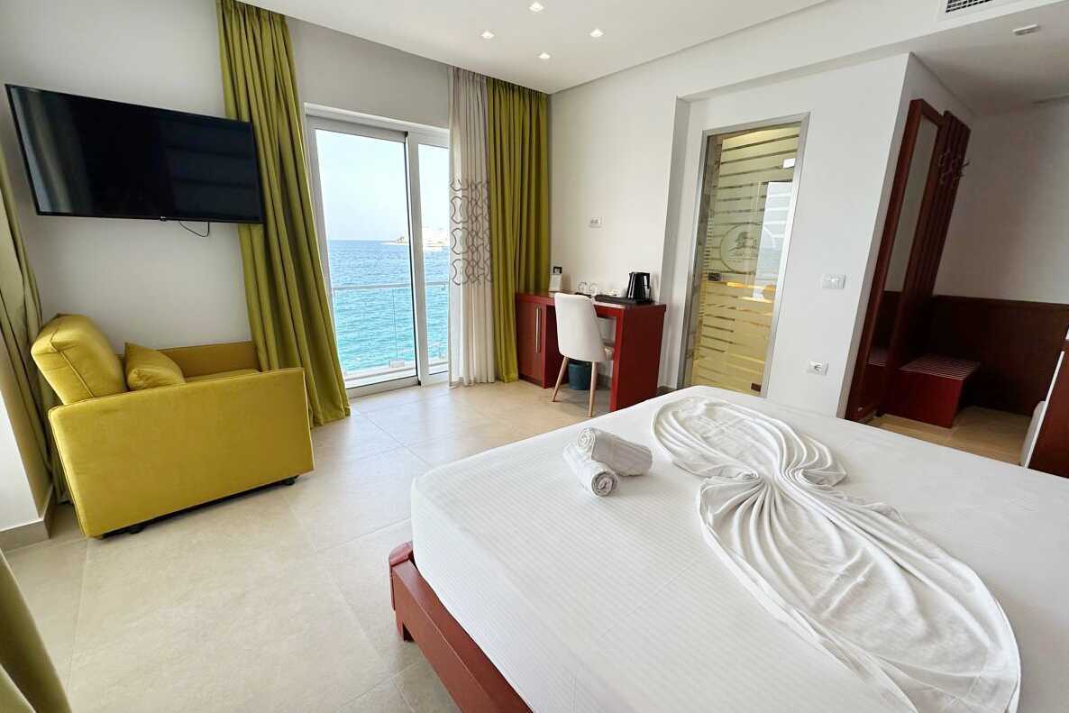 Deluxe-huone, jossa on parveke merinäköalalla. Parivuode. Lisävuodemahdollisuus yhden hengen vuoteesta. Maksuton wifi, ilmastointi ja tallelokero. Jääkaappi. Tv kansainvälisillä kanavilla. Hiustenkuivain. Lasiovi kylpyhuoneeseen, jossa on kylpyamme tai suihku ja wc. Siivous 7 krt/viikko.