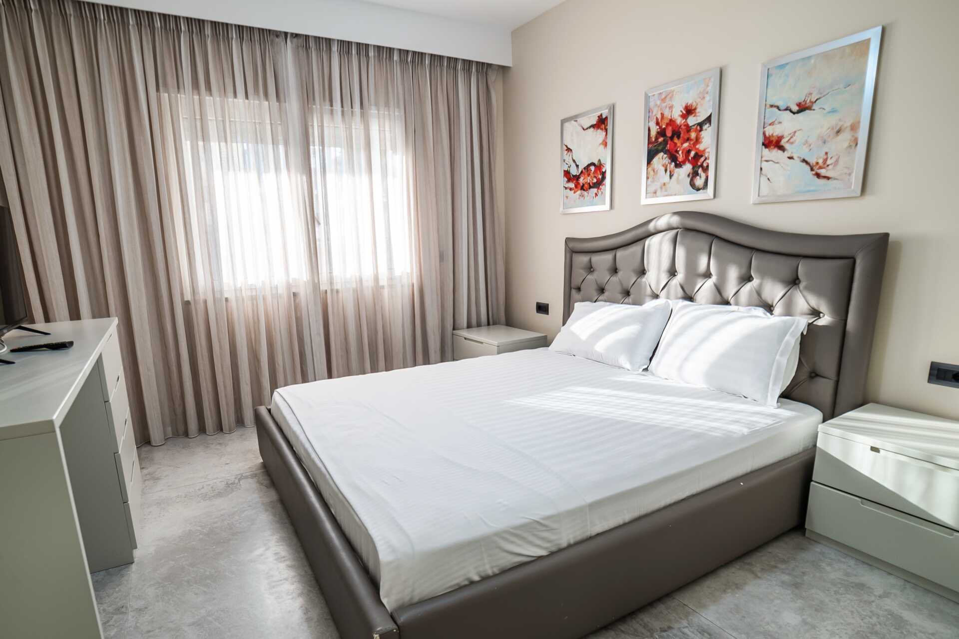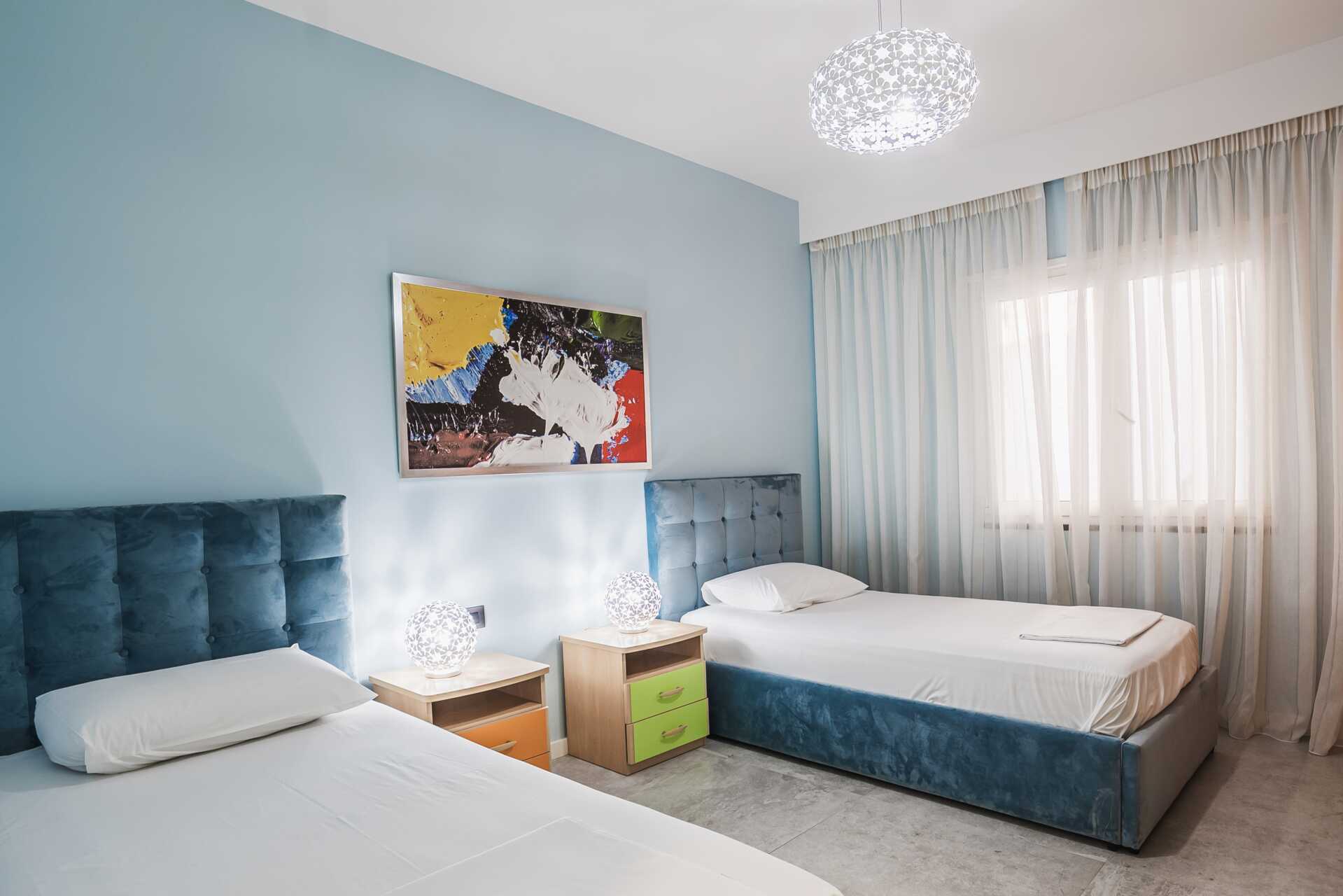 Neljän huoneen huoneisto parvekkeella ja merinäköalalla. Neljän huoneen huoneistot sijaitsevat erillisessä rakennuksessa. Kolme makuuhuonetta ja yhdistetty olohuone ja keittiö. Kaksi parivuodetta ja kaksi erillistä vuodetta. Hyvin varusteltu keittiö, jossa jääkaappi, pieni pakastin, keittolevyt, mikro, kahvinkeitin ja yksinkertainen keittiövarustus. Maksuton wifi, ilmastointi ja tallelokero. Tv kansainvälisillä kanavilla. Kaksi kylpyhuonetta, joissa suihku ja wc. Siivous 7 krt/viikko.