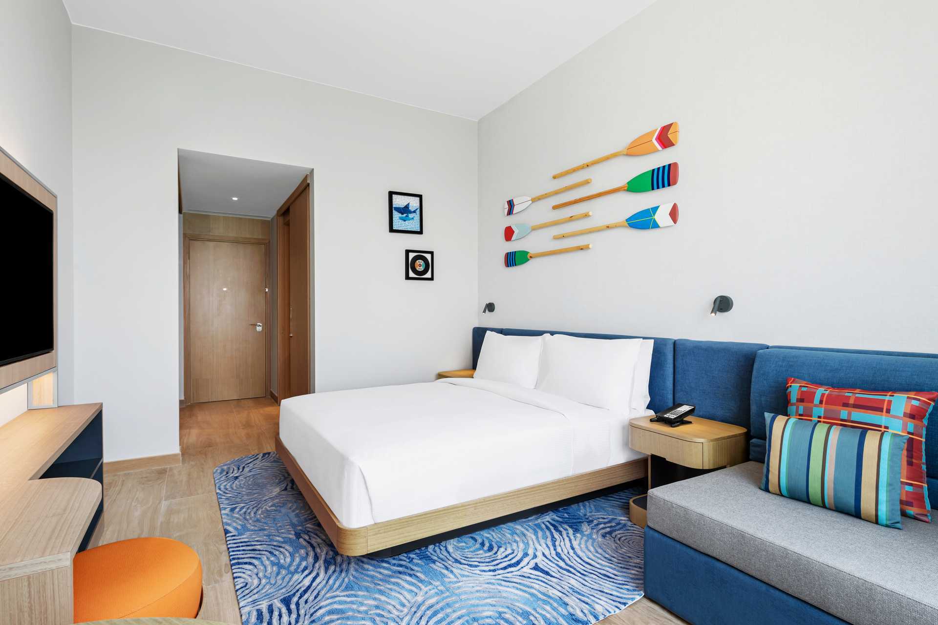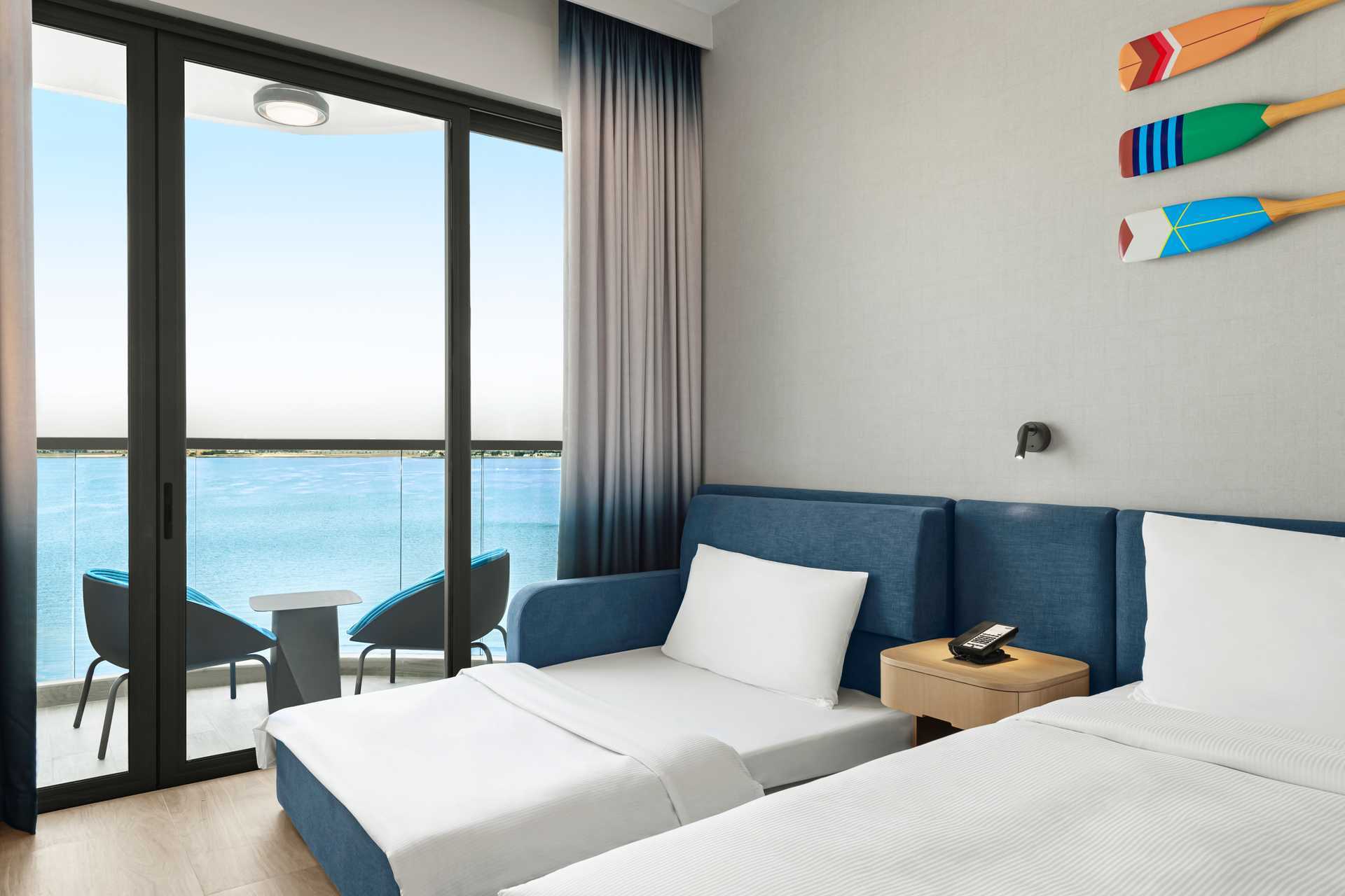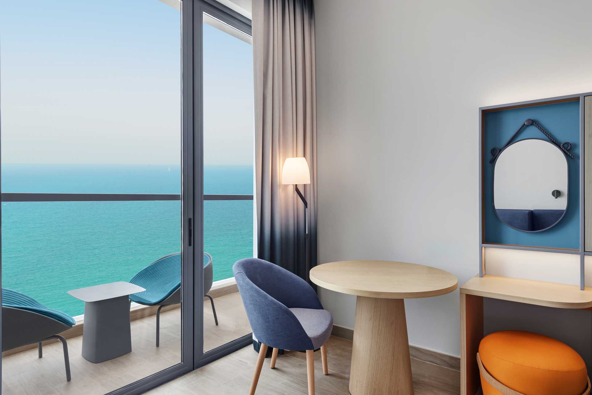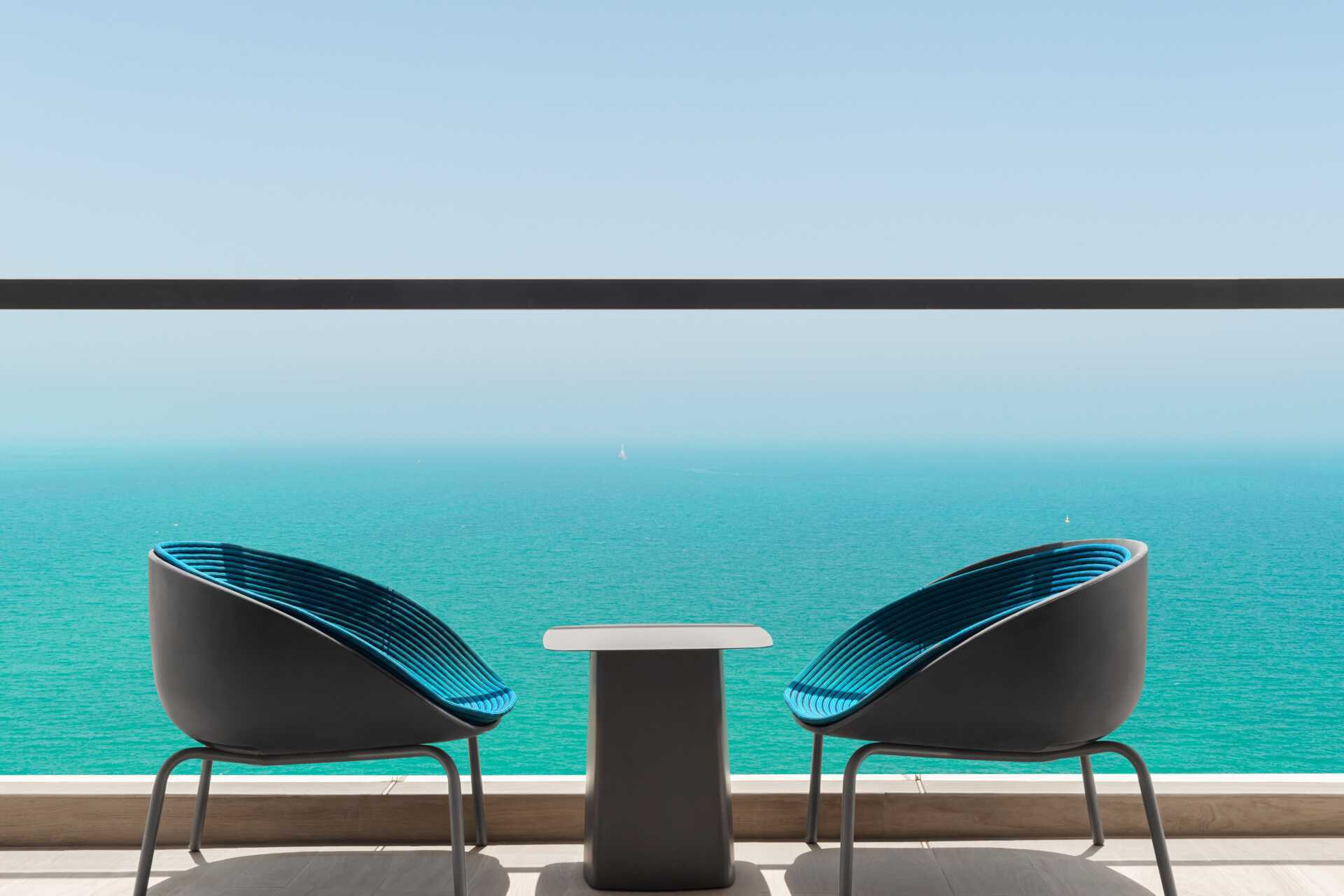 Deluxe-huone parvekkeella ja merinäköalalla. Huoneet sijaitsevat rakennuksen korkealla puolella. Parivuode tai kaksi yhden hengen sänkyä. Lisävuodemahdollisuus vuodesohvassa tai osassa olemassa olevia vuoteita. Maksuton wifi, ilmastointi ja tallelokero. Jääkaappi. Tv kansainvälisillä kanavilla. Silitysrauta ja -lauta. Hiustenkuivain. Kylpyhuoneessa suihku ja wc. Siivous 7 krt/viikko.
