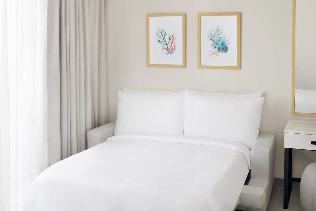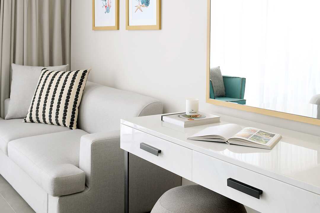 Perhehuone parvekkeella. Perhehuone koostuu makuuhuoneesta ja olohuoneesta. Parivuode. Lisävuodemahdollisuus vuodesohvasta. Maksuton wifi, ilmastointi ja tallelokero. Minibaari lisämaksulla. Vedenkeitin, kahvia ja teetä. Tv kansainvälisillä kanavilla. Kylpytakit ja tossut. Hiustenkuivain. Kylpyhuoneessa suihku ja wc. Siivous 7 krt/viikko.