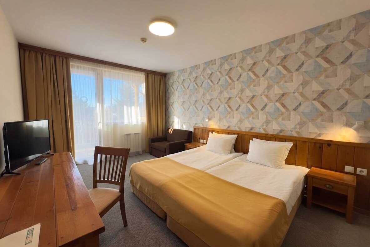 You get what you pay for. Rooms had stained carpets and sofas/stools, however the cleaners did a great job at making up the beds and changing sheets/ towels/ replenishing toiletries daily upon request. No air con, so gets very hot unless you sleep with a balcony door open. Beds are fairly uncomfortable, but what can you expect for such cheap accommodation. The bar is very expensive, would recommend going into town for drinks as town has a nicer environment too. Free continental breakfast- very basic stuff, but can’t complain too much as it is included in the price of your stay. The shuttle bus to the gondola is a great service provided, and the driver is very polite and friendly. It’s a shame I can’t say that for all of the staff. The receptionist with brown hair is lovely, she makes a real effort to speak English and her customer service is excellent! The blonde receptionist, on the other hand, is extremely rude. She makes you feel unwelcome, she definitely does not like English people. She shouted at me in Bulgarian for refilling my water bottle at breakfast (I paid for this!) How absurd! When I appeared confused, she proceeded to physically smack my bottle and shout ‘no no no’ very aggressively- as a young female - it was quite scary actually.