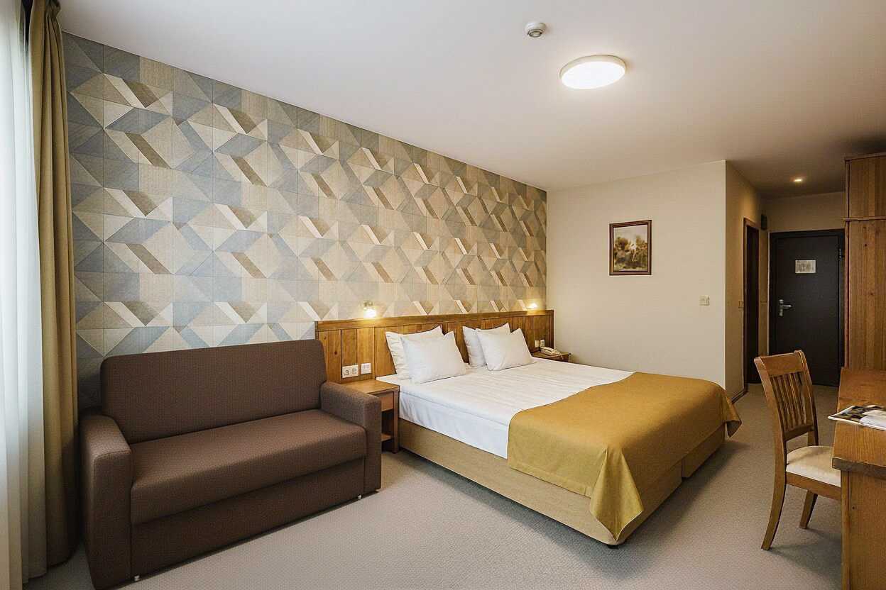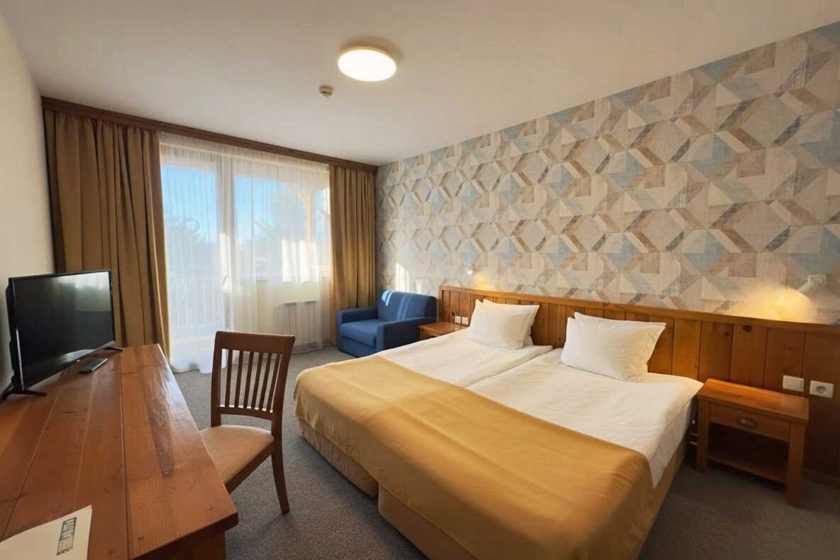 Kahden hengen huone, jonka parvekkeelta on näköala kaupunkiin tai vuorille. Kaksi erillistä vuodetta. Mahdollisuus lisävuoteeseen nojatuolivuoteessa. Wifi, ilmastointi ja tallelokero sisältyvät hintaan. Jääkaappi. TV kansainvälisillä kanavilla. Kokolattiamatto. Silitysrauta ja silityslauta. Hiustenkuivaaja. Kylpyhuone, jossa suihku ja wc. Siivous 7 krt/viikko.