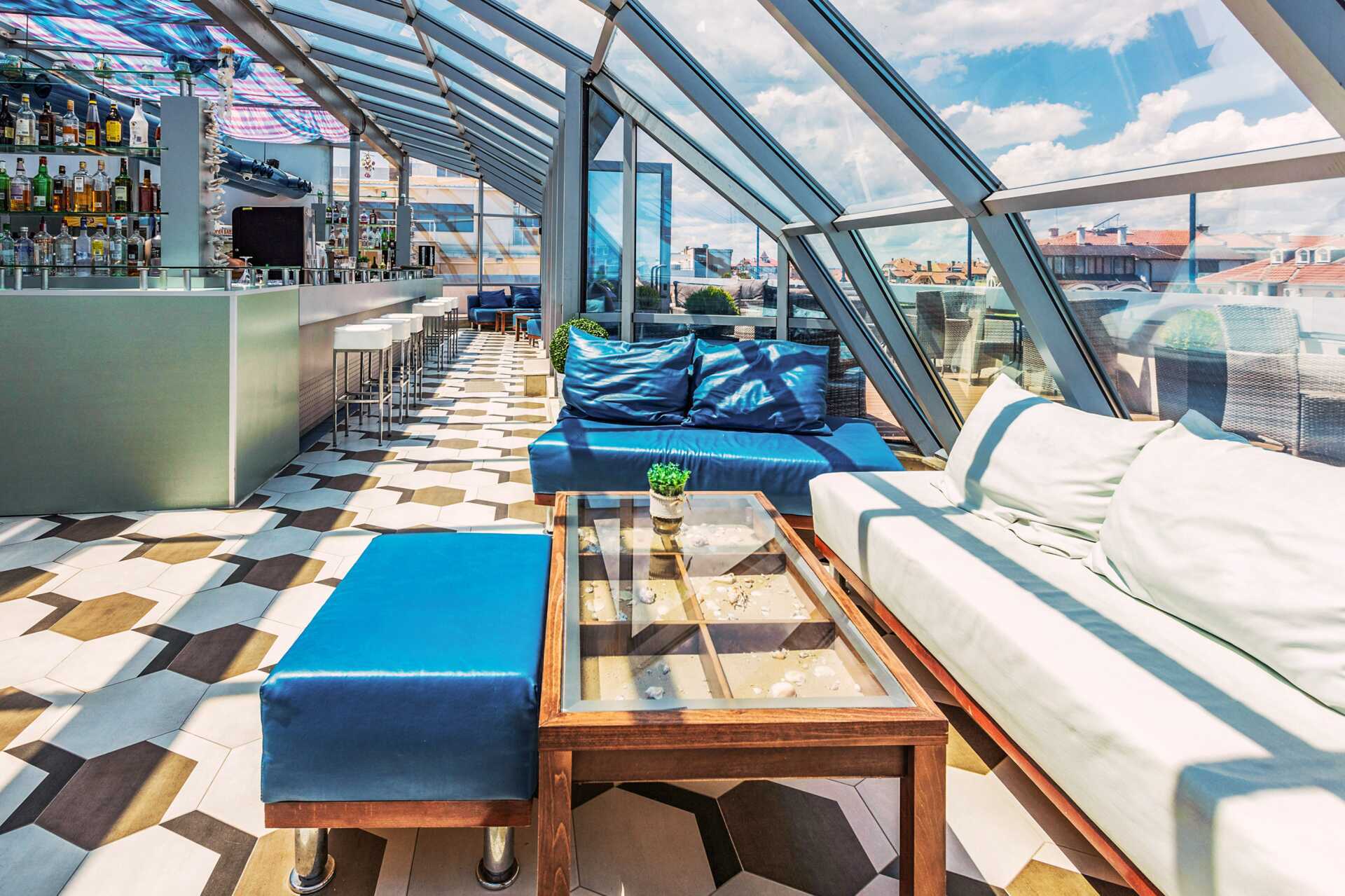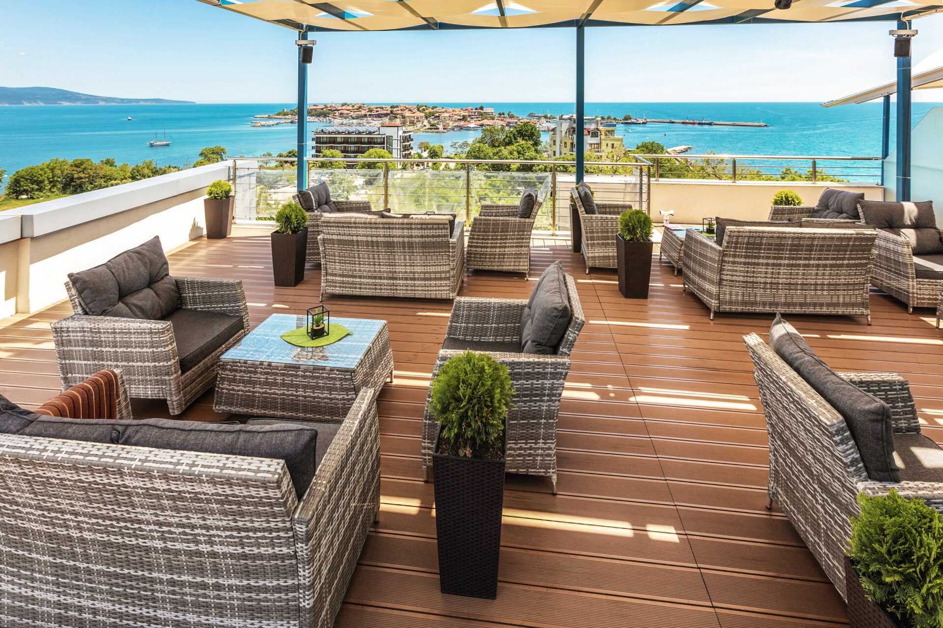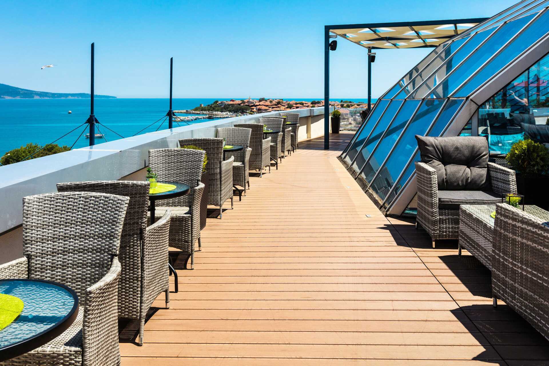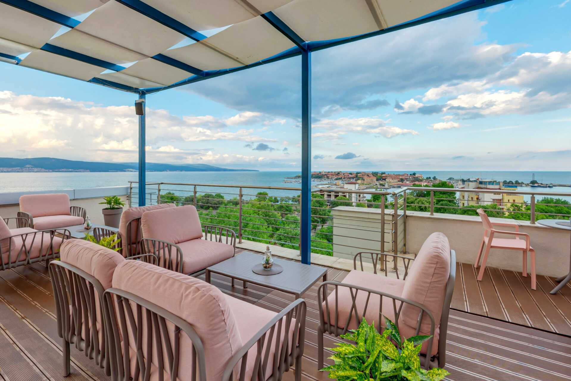 Deluxe-huone parvekkeella, osassa rajoitettu merinäköala. Jotkut parvekkeet on lasitettu liikenteen melun vähentämiseksi. Parivuode tai kaksi yhden hengen vuodetta. Maksuton wifi, ilmastointi ja tallelokero. Jääkaappi/minibaari. Kahvikone - kapselit mukana. Silitysrauta ja -lauta. Hiustenkuivain. Suihku ja wc. Siivous 7 krt/viikko.