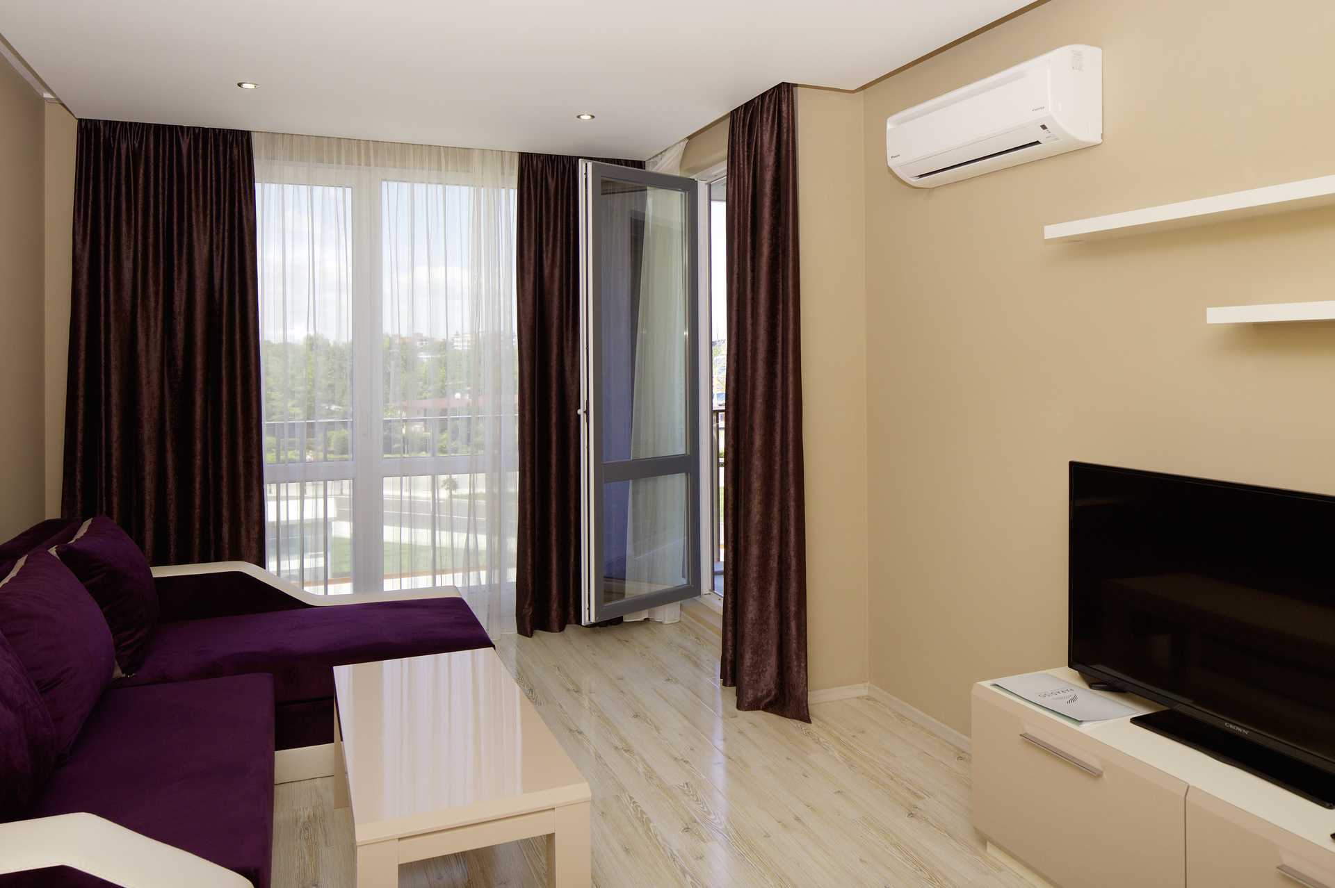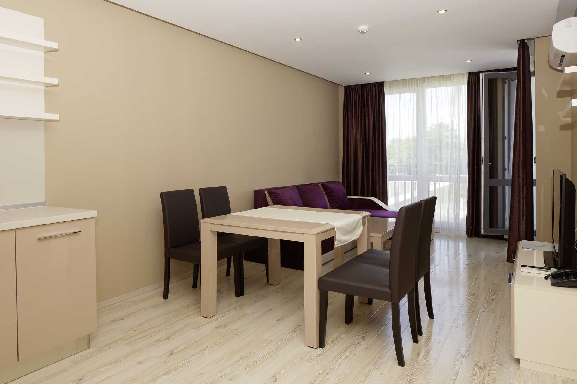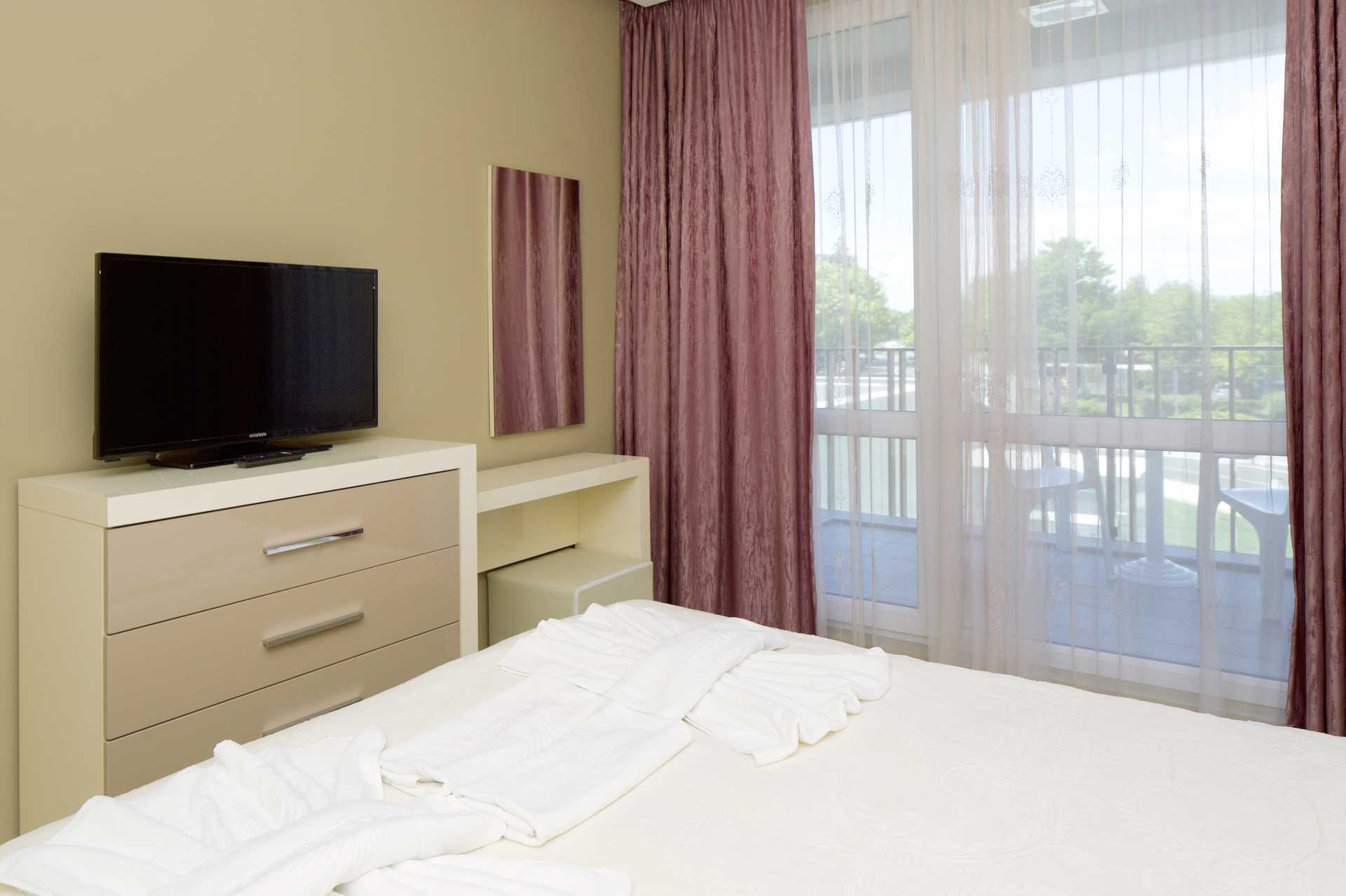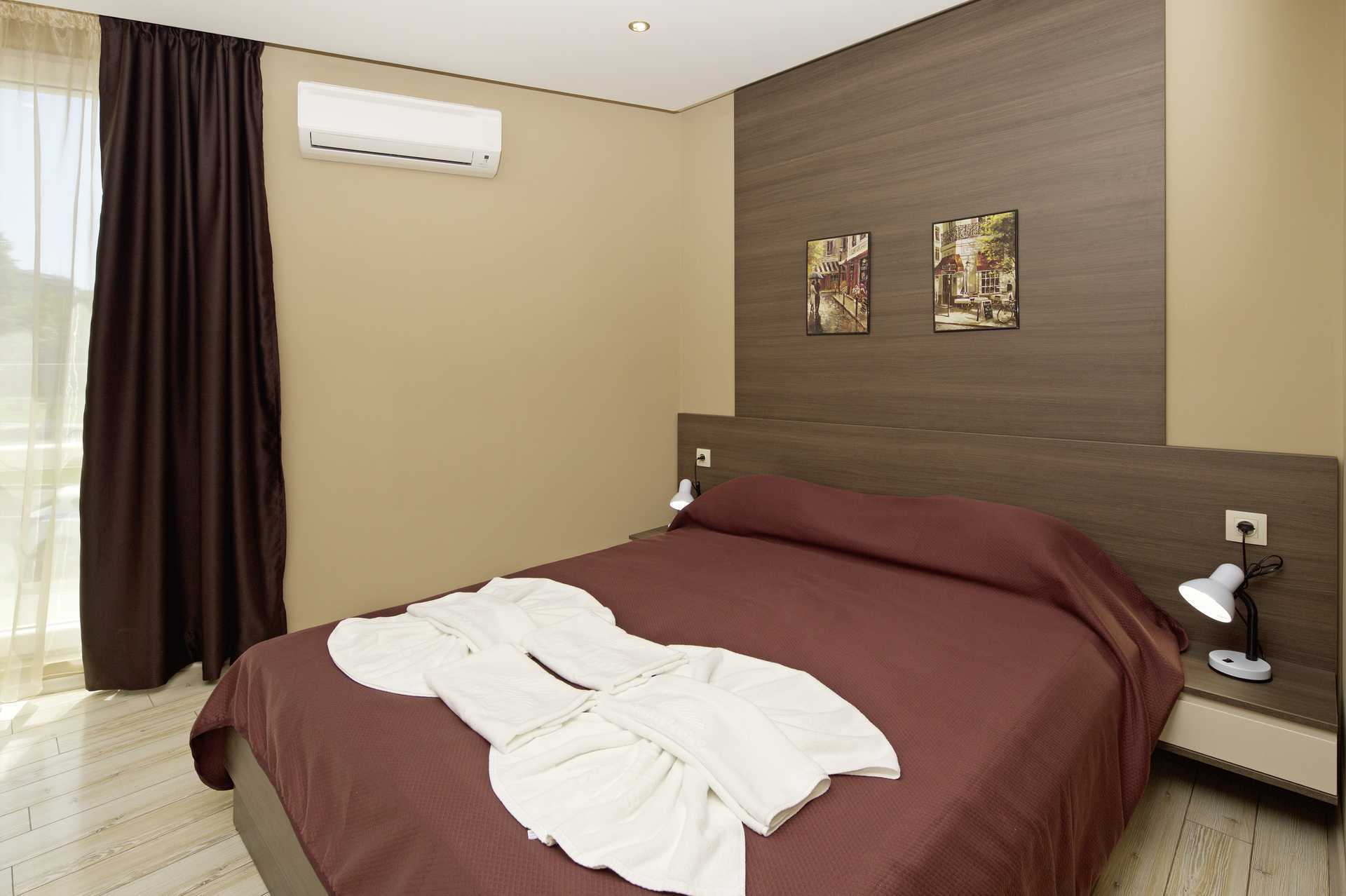 Kaksio parvekkeella. Yksi makuuhuone ja yhdistetty olohuone ja minikeittiö. Parivuode. Lisävuodemahdollisuus vuodesohvasta. Minikeittiössä keittolevyt, jääkaappi, vedenkeitin ja yksinkertainen keittiövarustus. Maksuton wifi, ilmastointi ja tallelokero. Tv kansainvälisillä kanavilla. Hiustenkuivain. Suihku ja wc. Siivous 7 krt/viikko.
