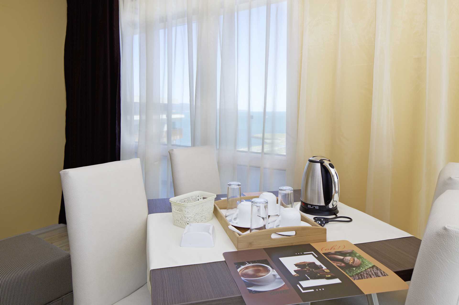 Perhehuone parvekkeella, osa rajoitetulla merinäköalalla. Makuuhuone ja olohuone. Parivuode. Lisävuodemahdollisuus vuodesohvasta. Vedenkeitin, kahvia ja teetä. Maksuton wifi, ilmastointi ja tallelokero. Televisio kansainvälisillä kanavilla molemmissa huoneissa. Hiustenkuivain. Suihku ja wc. Siivous 7 krt/viikko.
