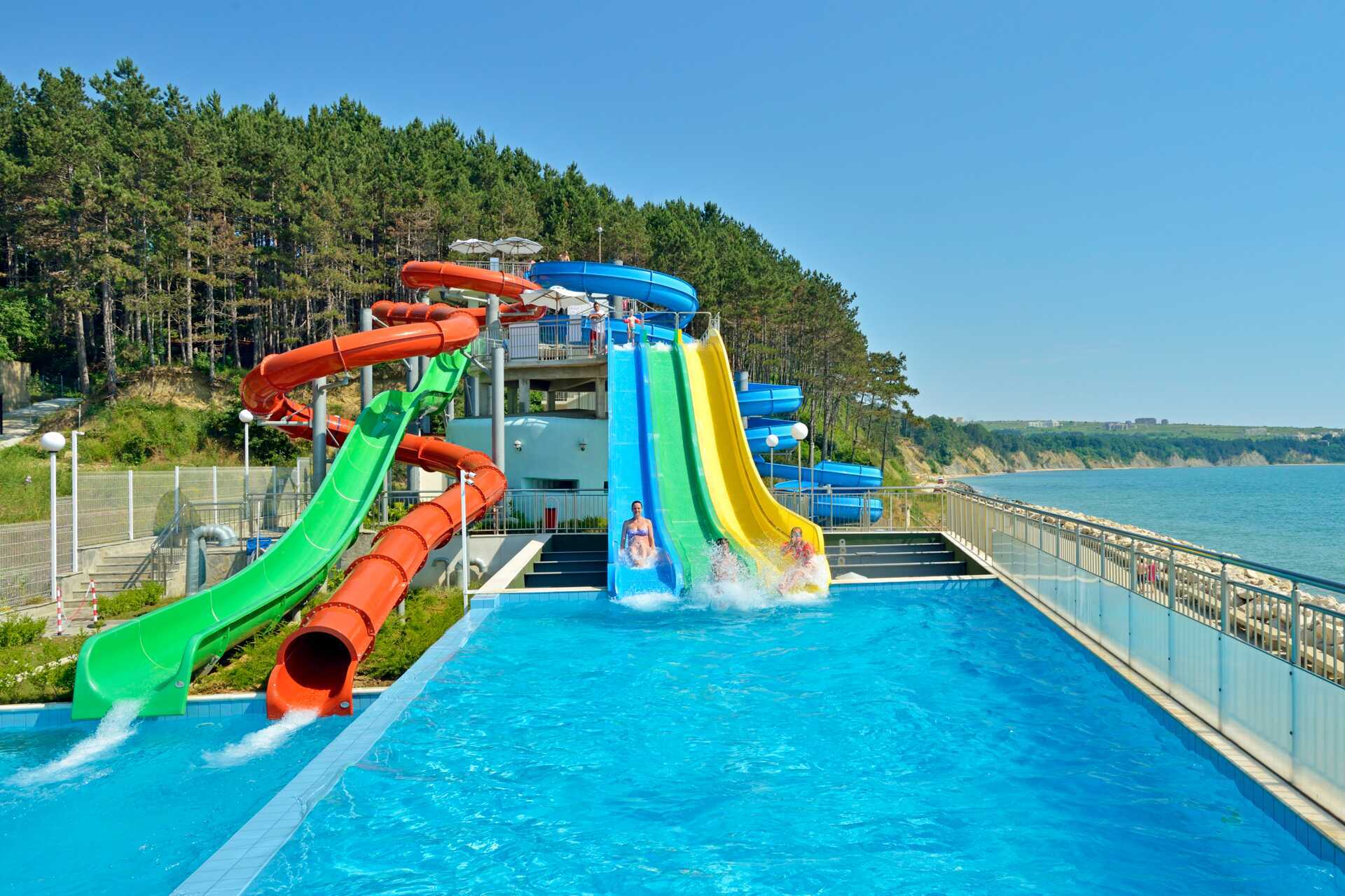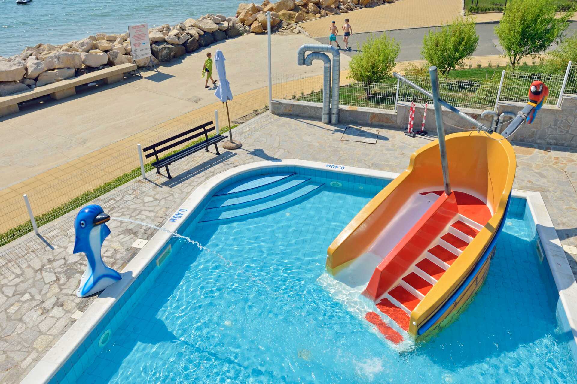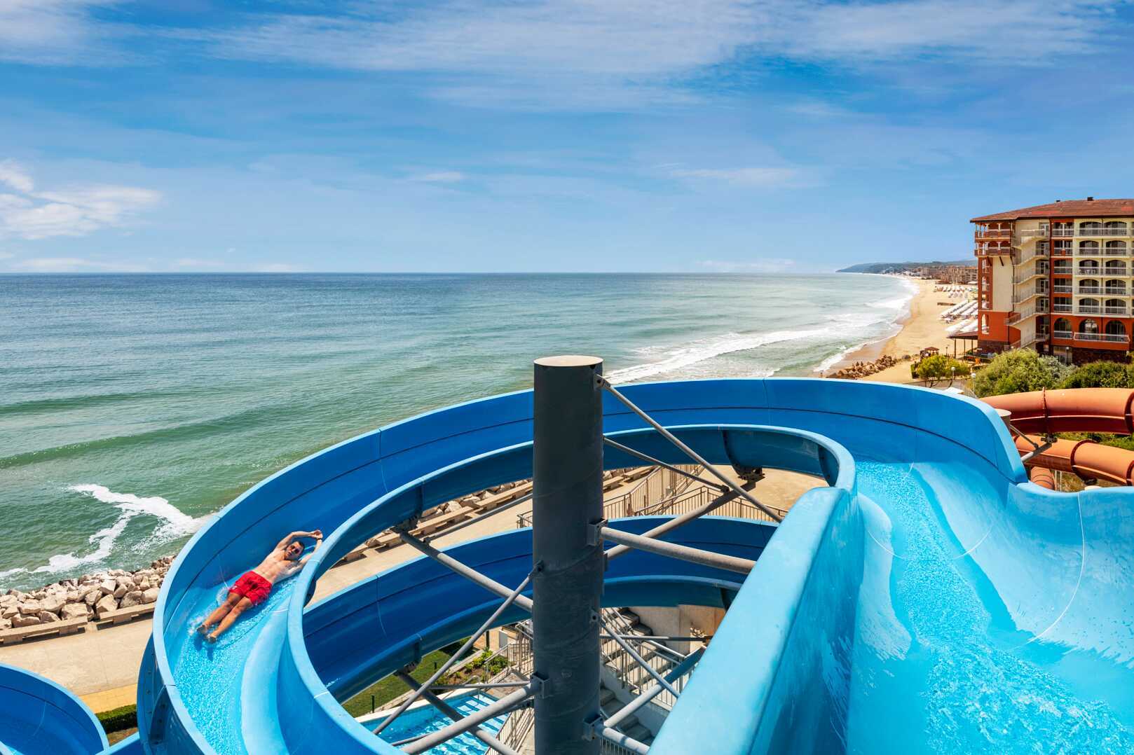 Allasalue, jossa on uima-allas ja erillinen lastenallas. Uima-allas, jossa on neljä vesiliukumäkeä (pituusraja 120 cm) ja uima-allas, jossa on kaksi vesiliukumäkeä pienemmille lapsille. Vesiliukumäet ovat avoinna hotellin aikataulun mukaisesti 1.6.–15.9., ja aukiolo riippuu sääolosuhteista. Hotelli sijaitsee aivan rannalla. Aurinkotuolit, aurinkovarjot ja pyyhkeet maksutta sekä uima-altaalla että rannalla. Rannalla voi harrastaa vesiurheilua (ulkopuolinen toimija).