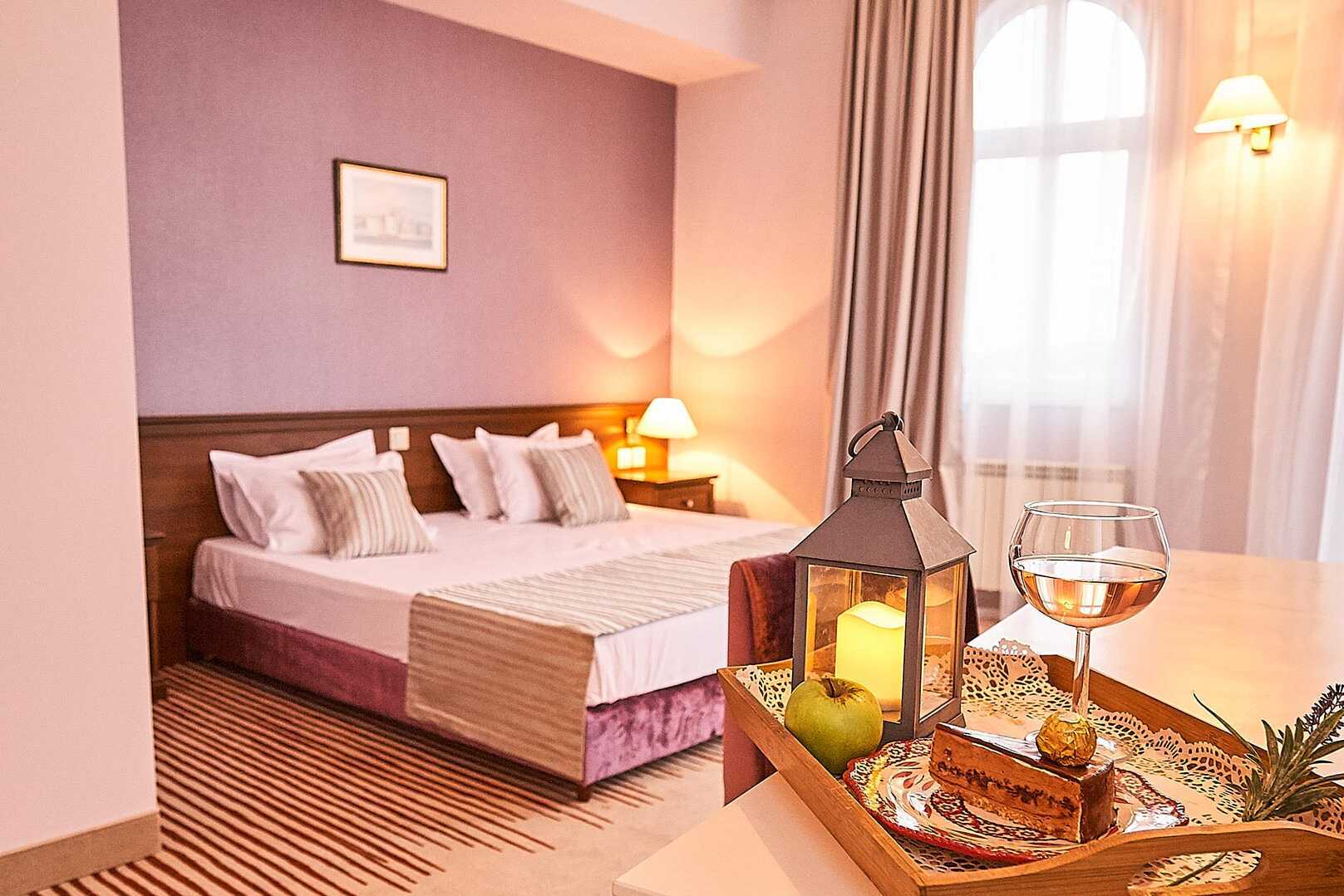 Deluxe-huone ilman ulkotilaa. Parivuode. Lisävuodemahdollisuus vuodesohvasta. Wifi ja ilmastointi sekä lämmitys sisältyvät hintaan. Jääkaappi. Tv kansainvälisillä kanavilla. Kokolattiamatto. Hiustenkuivain. Kylpyamme tai suihku ja wc. Siivous 6 krt/viikko.