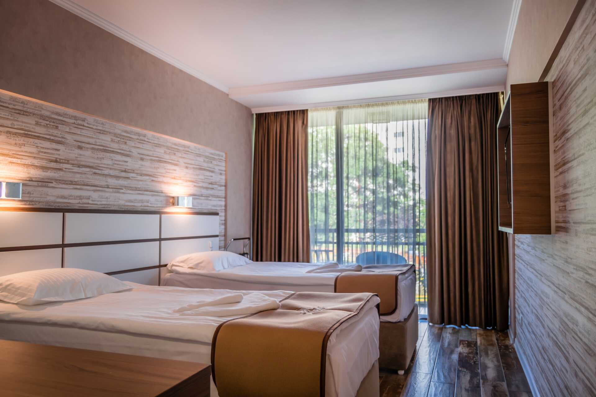 Kahden hengen huone parvekkeella. Kaksi yhden hengen sänkyä. Mahdollisuus saada lisävuode yhden hengen vuoteeseen, käännettävä nojatuoli ja/tai vuodesohva. Maksuton wifi ja ilmastointi. Jääkaappi. Tv kansainvälisillä kanavilla. Hiustenkuivain. Kylpyhuoneessa suihku ja wc. Siivous 7 krt/viikko.