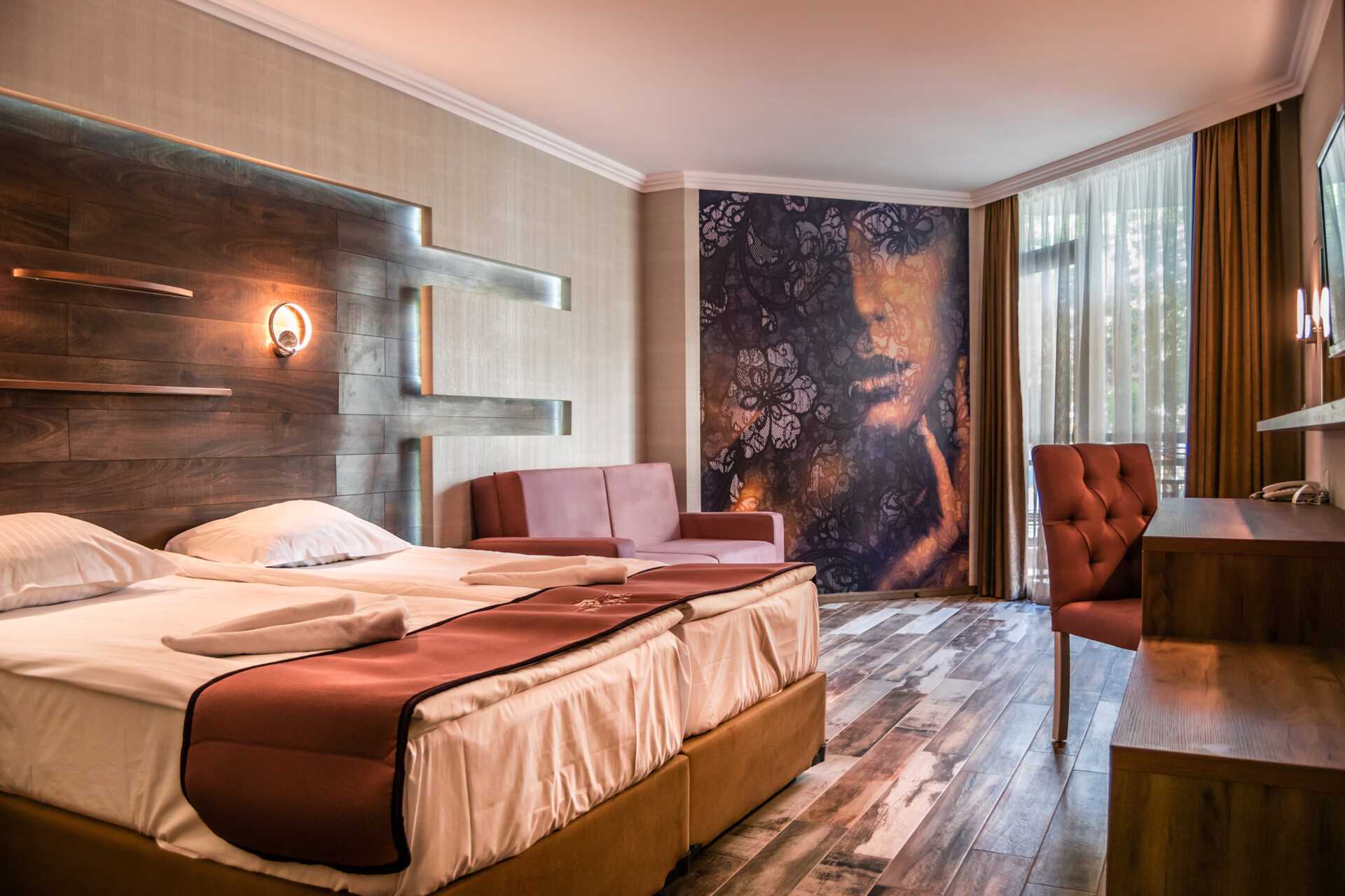 Superior-huone parvekkeella. Kaksi yhden hengen sänkyä. Mahdollisuus saada lisävuode yhden hengen vuoteeseen, käännettävä nojatuoli ja/tai vuodesohva. Maksuton wifi ja ilmastointi. Jääkaappi. Tv kansainvälisillä kanavilla. Hiustenkuivain. Suihku ja wc. Siivous 7 krt/viikko.