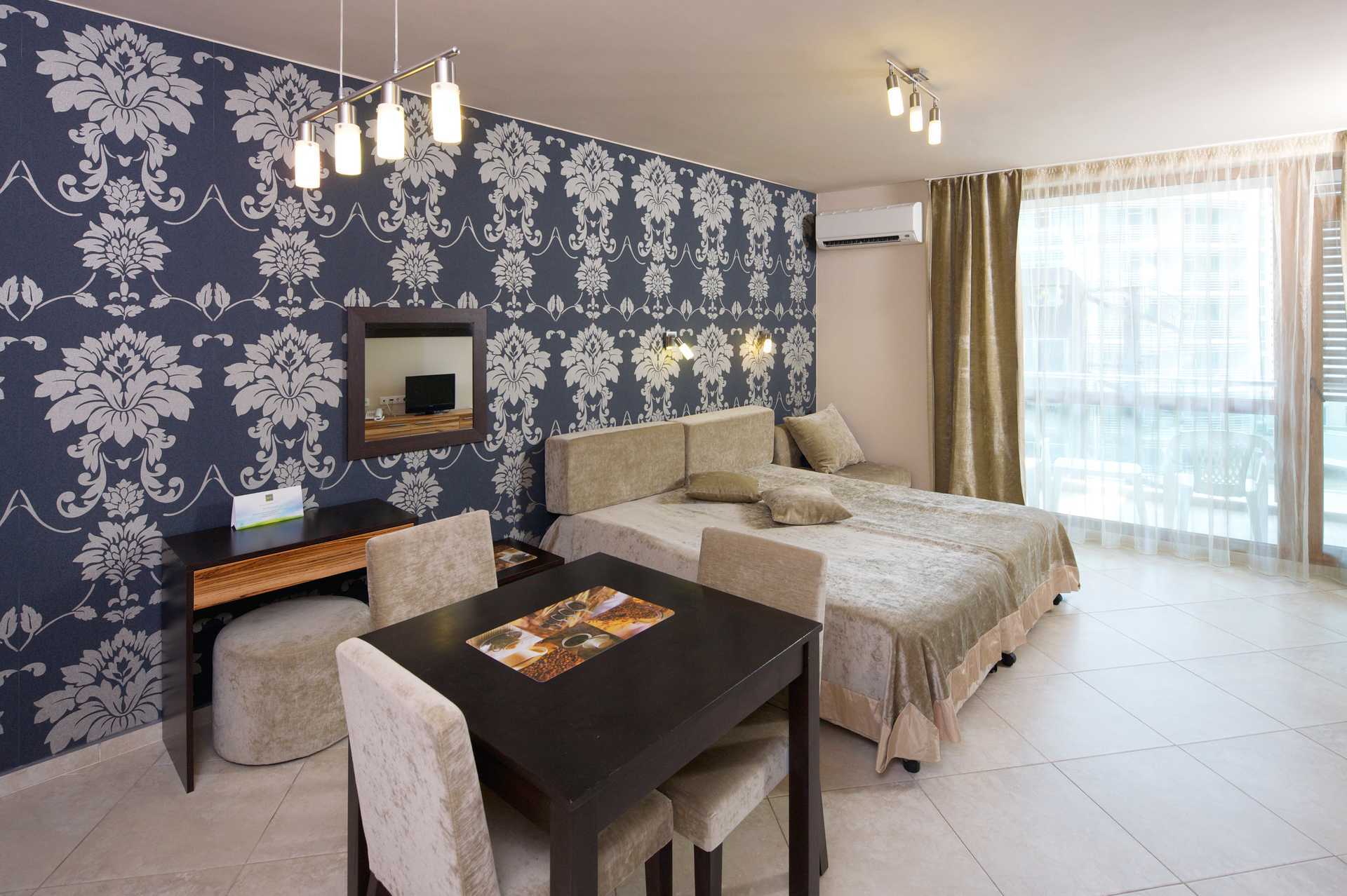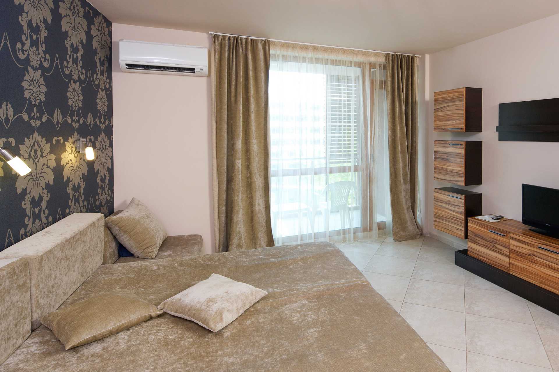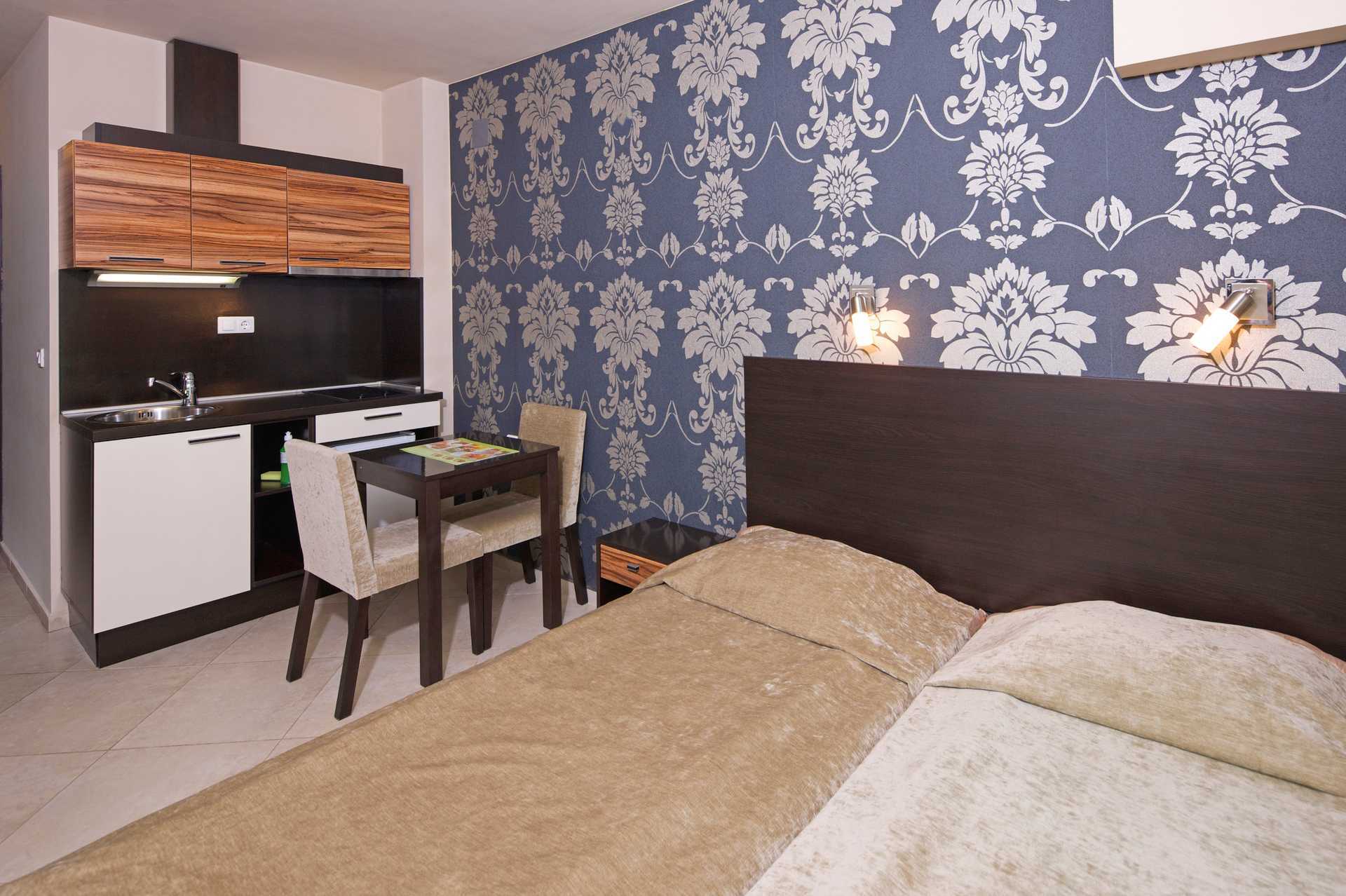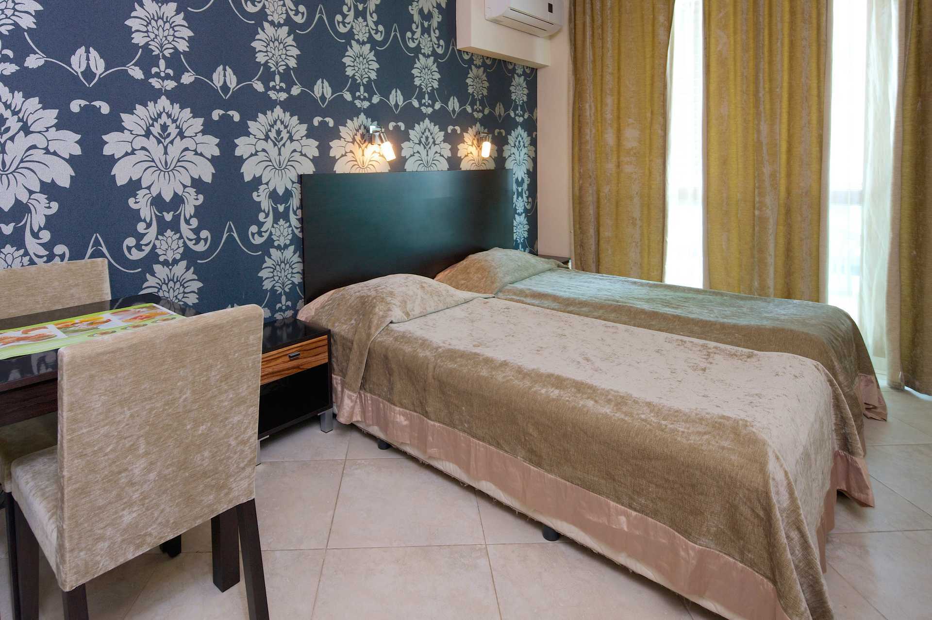 Suuri yhden hengen huone parvekkeella. Yhdistetty makuuhuone ja minikeittiö. Parivuode tai kaksi yhden hengen sänkyä. Lisävuodemahdollisuus vuodesohvasta. Minikeittiössä keittolevyt, uuni, jääkaappi, vedenkeitin ja yksinkertainen keittiövarustus. Maksuton wifi, ilmastointi ja tallelokero. Tv kansainvälisillä kanavilla. Hiustenkuivain. Suihku ja wc. Siivous 7 krt/viikko.