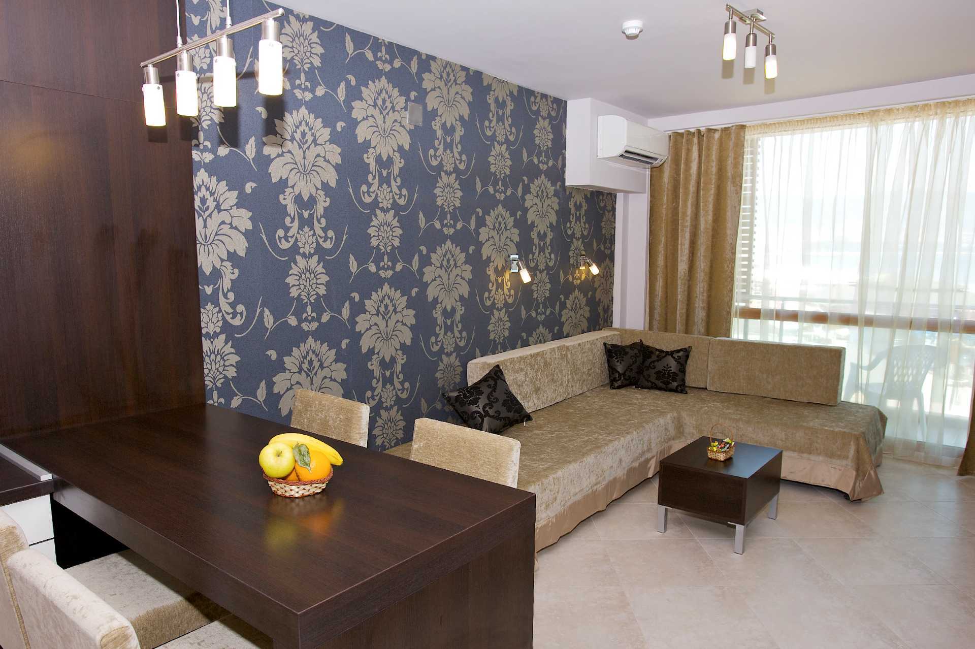 Kaksio parvekkeella, joista osasta on rajoitettu merinäköala. Makuuhuone sekä yhdistetty olohuone ja minikeittiö. Parivuode tai kaksi yhden hengen sänkyä. Lisävuodemahdollisuus kahteen vuodesohvaan. Minikeittiö, jossa on keittolevyt, jääkaappi, mikroaaltouuni, vedenkeitin, leivänpaahdin ja peruskeittiövälineet. Maksuton wifi, ilmastointi ja tallelokero. Tv kansainvälisillä kanavilla. Hiustenkuivain. Suihku ja wc. Siivous 7 krt/viikko.