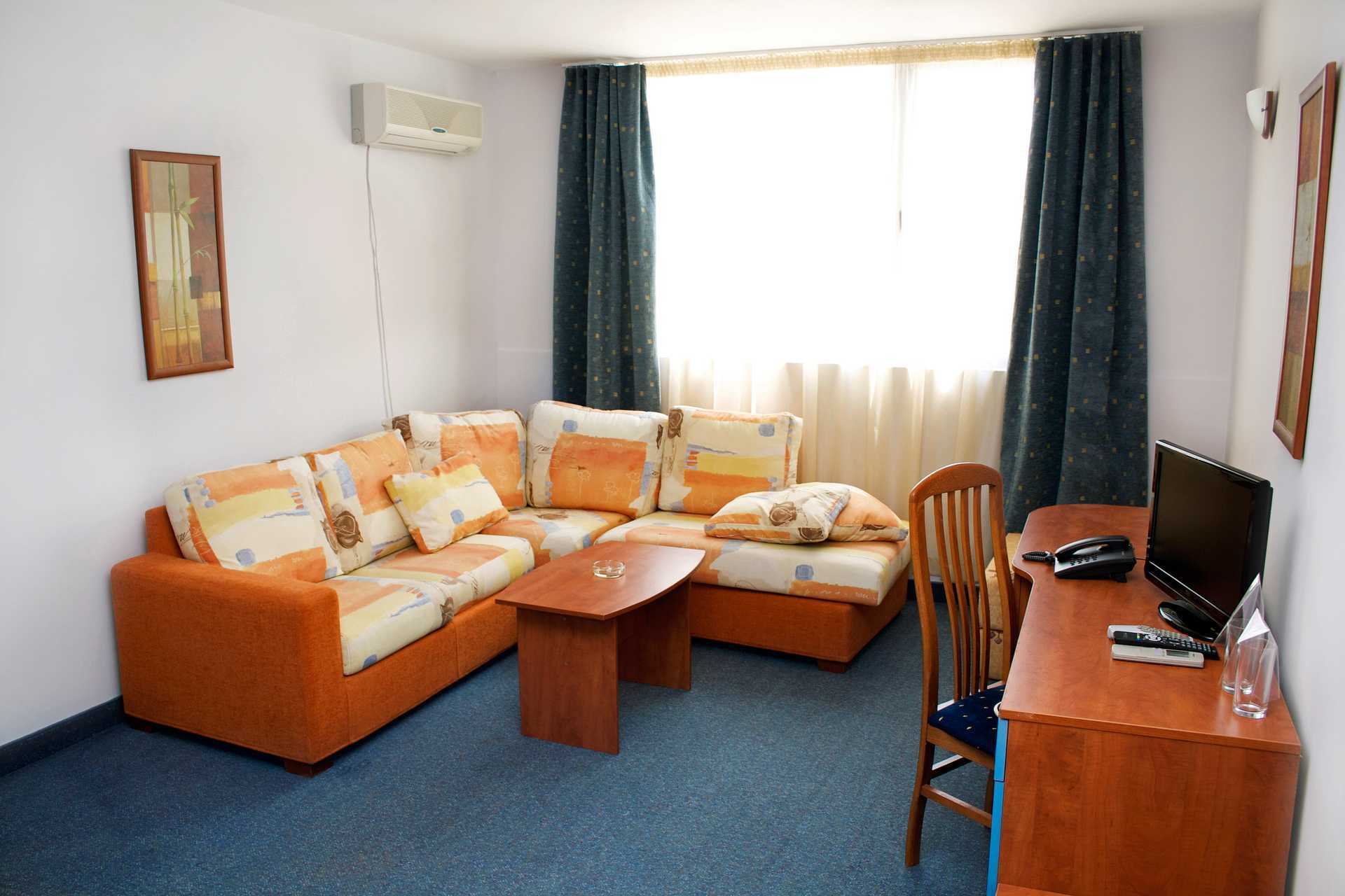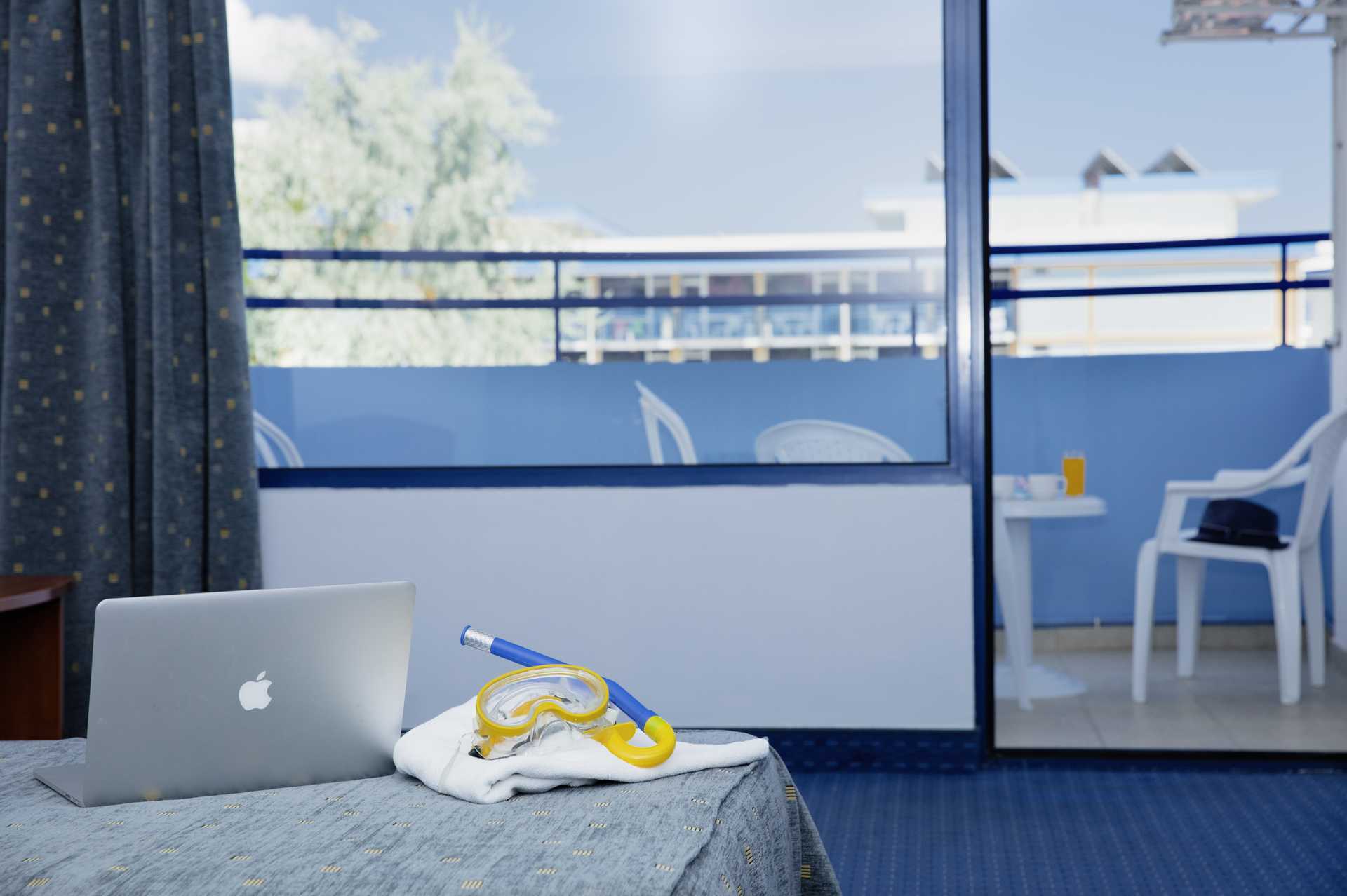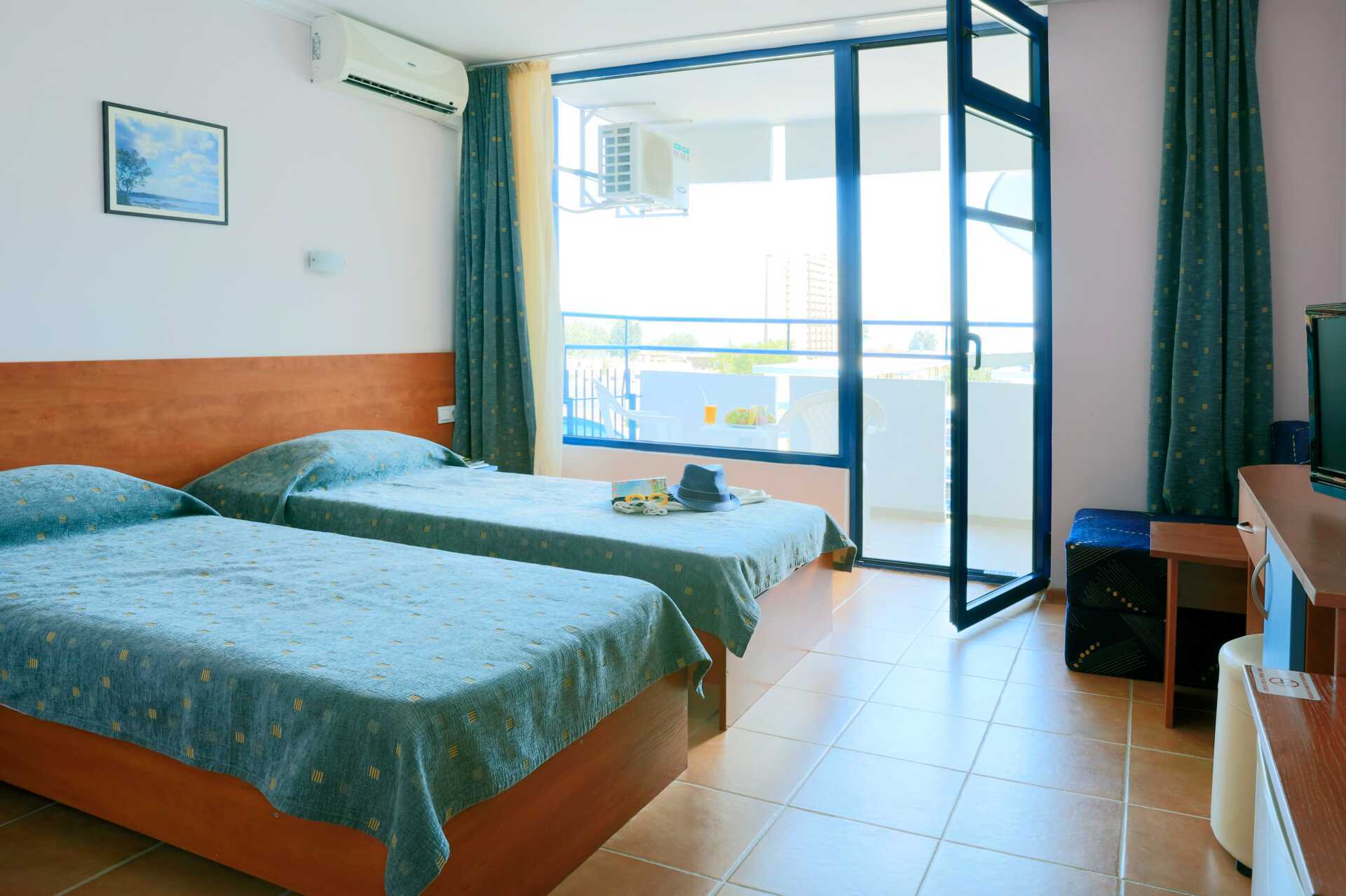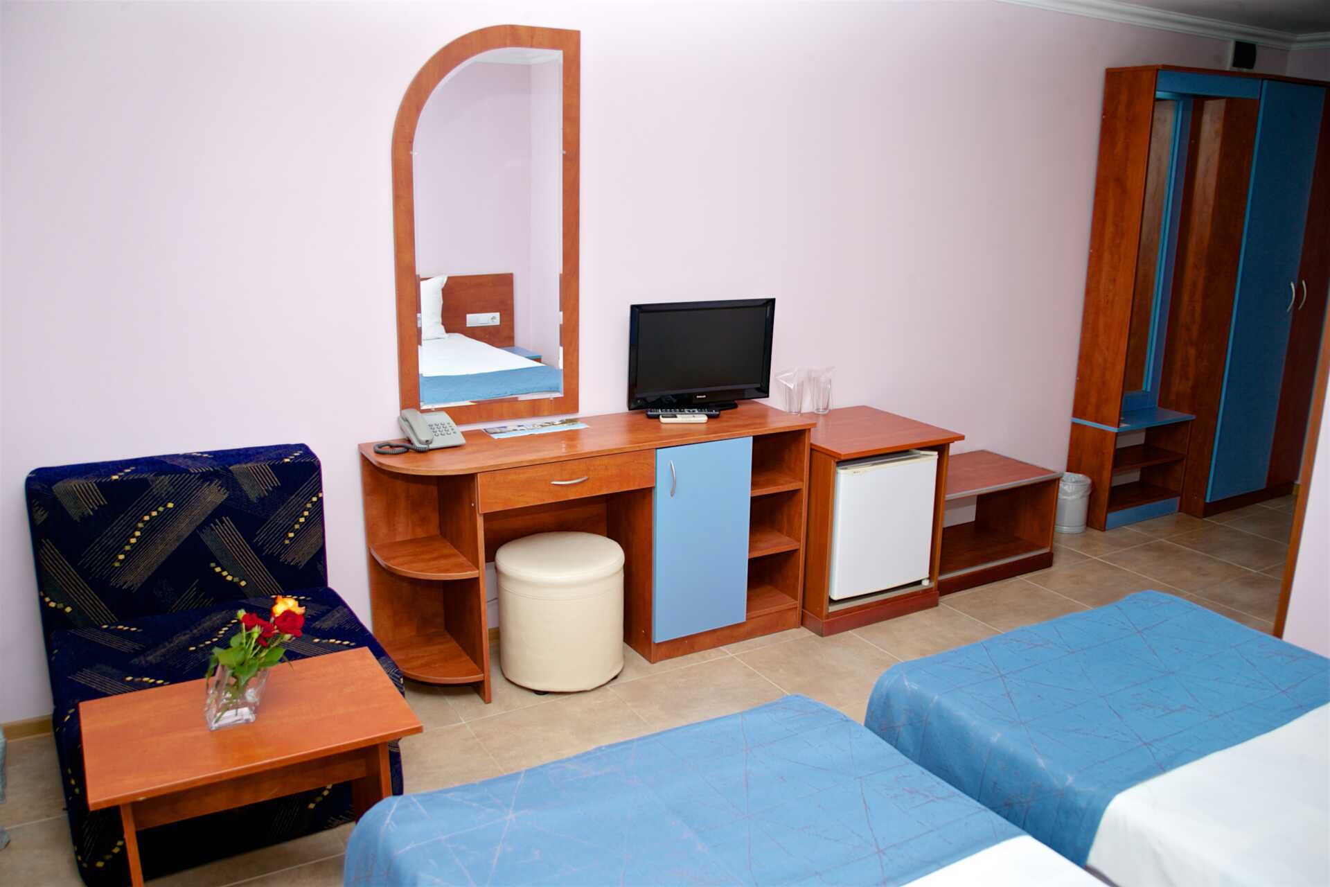 Kahden hengen huone, parvkkeella. Osa huoneista on remontoitu ja hieman suurempia ja joissakin huoneissa on kokolattiamatto. Kaksi yhden hengen sänkyä. Lisävuodemahdollisuus. Jääkaappi. Maksuton ilmastointi ja wifi. Tv paikalliskanavilla. Suihku ja wc. Parveke. Siivous 7 krt/viikko.