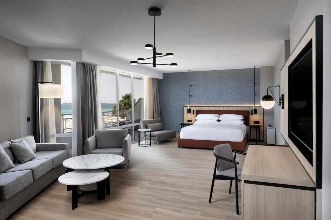 Superior-sviitti, parvekkeella ja merinäköalalla. Superior-sviitissä on makuuhuone parivuoteella, jossa on mahdollisuus saada lisävuode vuodesohvasta ja vuodenojatuolista, sekä olohuone. Maksuton wifi, ilmastointi ja tallelokero. Jääkaappi - vesipullo, joka täytetään päivittäin maksutta. Vedenkeitin, kahvia ja teetä. Tv kansainvälisillä kanavilla. Silitysrauta ja -lauta. Tossut. Hiustenkuivain. Kylpyhuoneessa suihku ja wc. Siivous 6 krt/viikko.