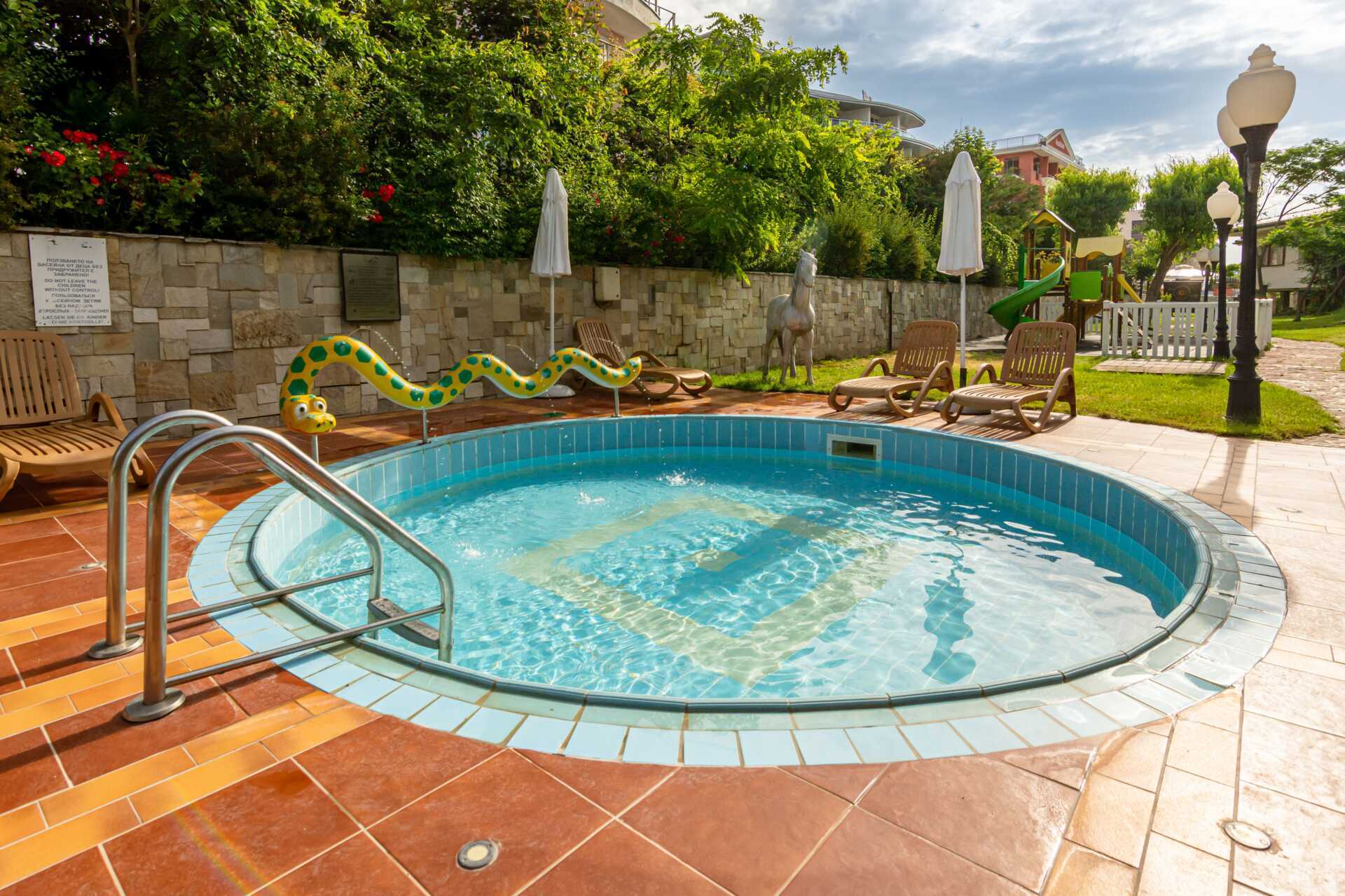 Hotellissa on suuri ja mukava allasalue uima-altaalla, syvempi allas (95 cm), jossa on vesiliukumäki lapsille ja lastenallas. Aurinkotuolit ja -varjot sisältyvät hintaan sekä uima-altaalla että rannalla. Allas- ja rantapyyhkeet sisältyvät hintaan.