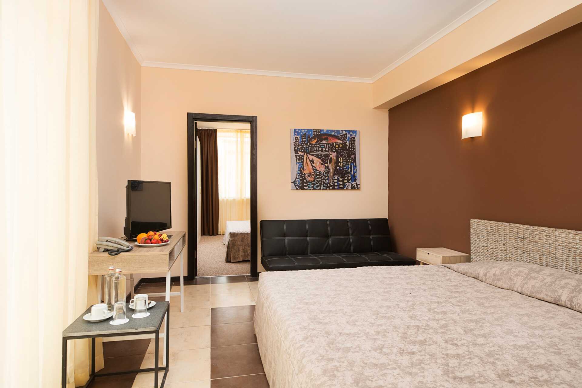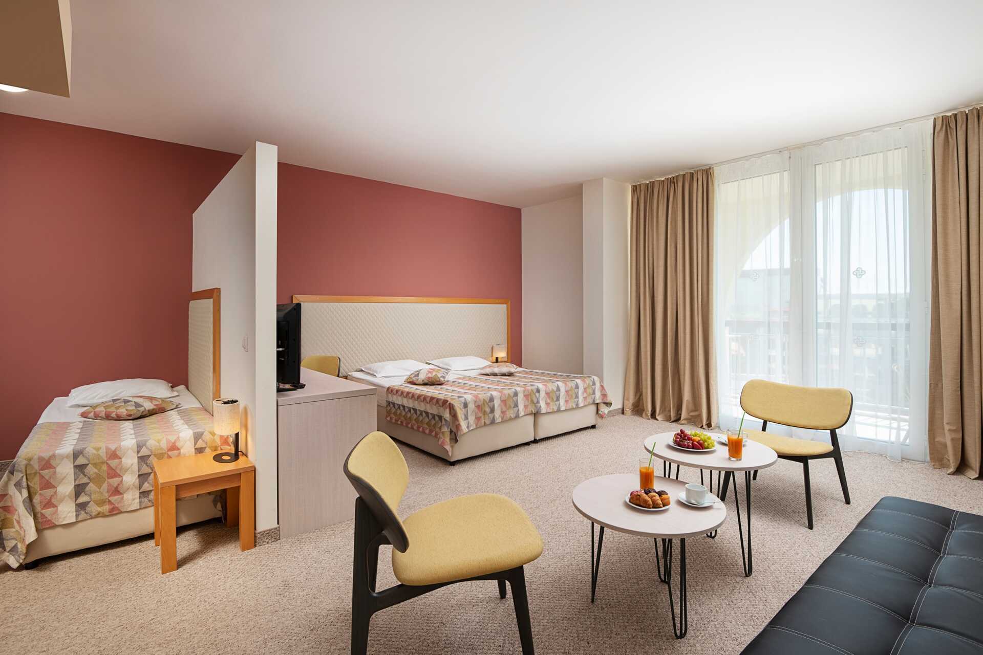 Juniorsviitti parvekkeella. Yksi parisänky ja kaksi erillistä sänkyä sekä mahdollisuus lisävuoteeseen vuodesohvalla. Maksuton wifi, ilmastointi ja tallelokero. Kokolattiamatto. Jääkaappi. Tv kansainvälisillä kanavilla. Hiustenkuivain. Amme ja wc. Siivous 7 krt/viikko. Junior-sviitit sijaitsevat rakennuksessa A tai B.