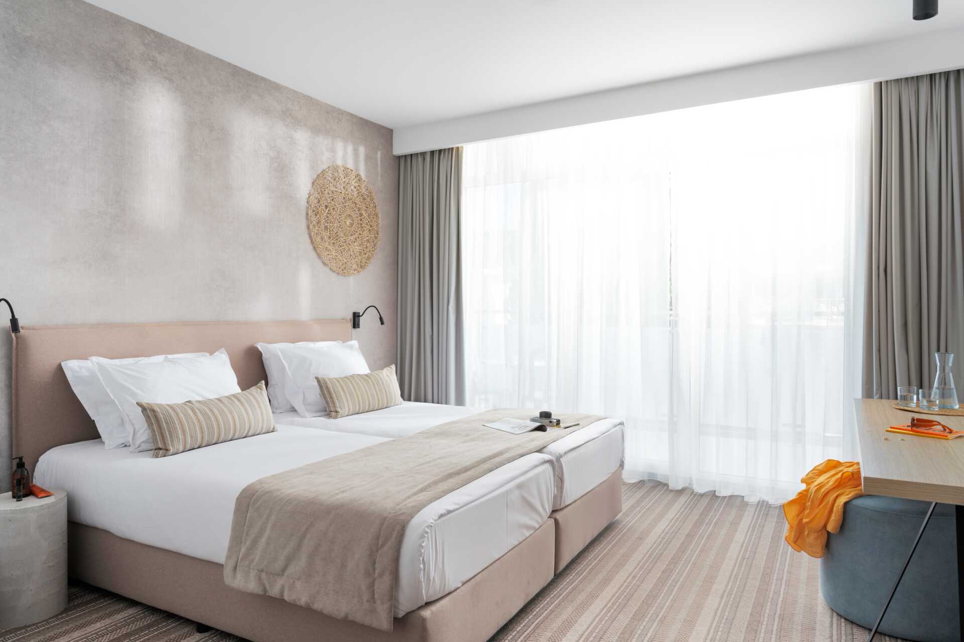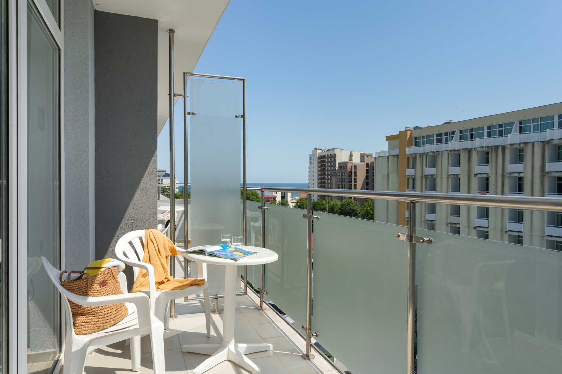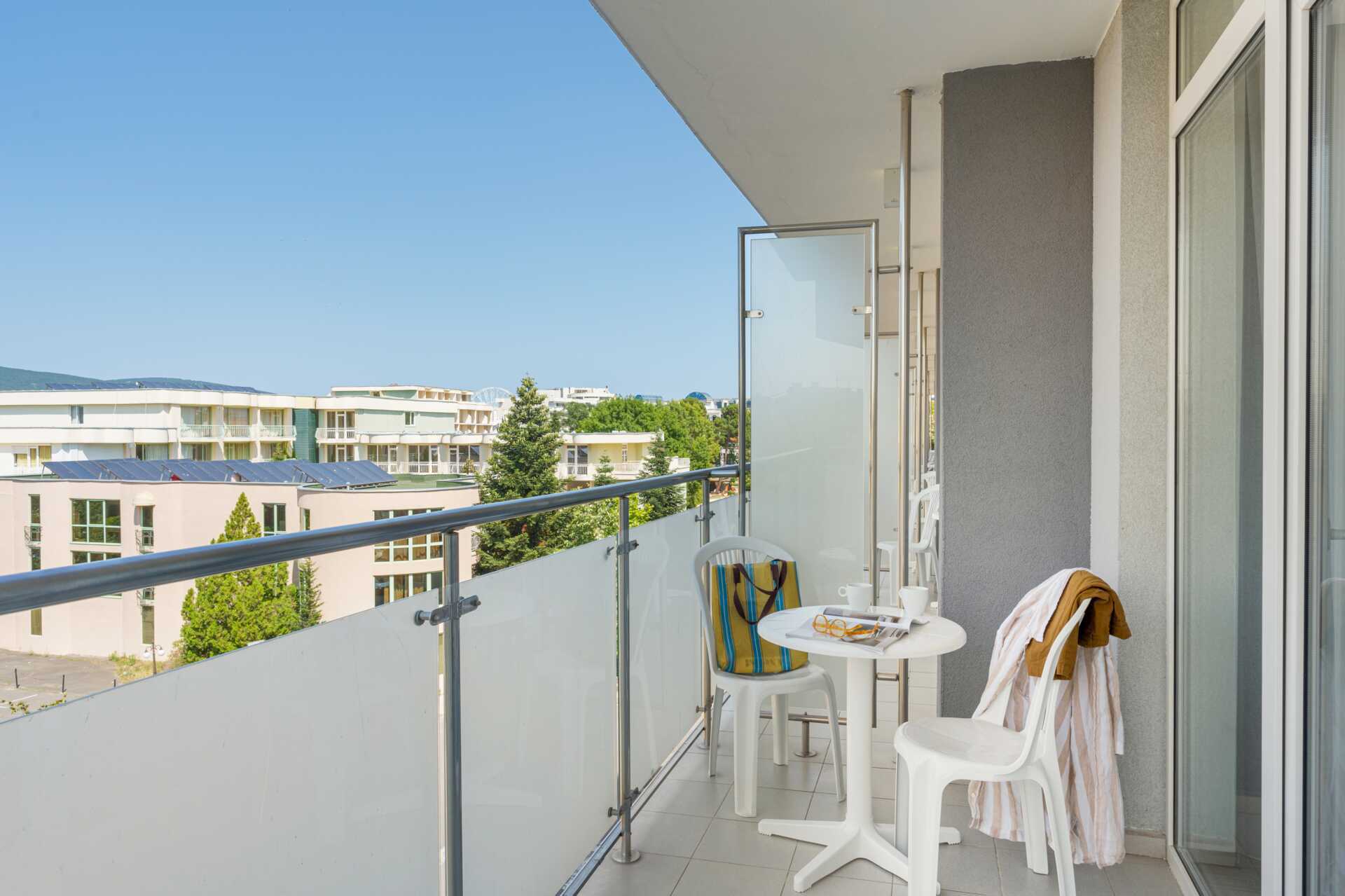Standard-huone parvekkeella. Parivuode tai kaksi yhden hengen vuodetta. Maksuton wifi, ilmastointi ja tallelokero. Jääkaappi. Tv paikallisilla kanavilla. Hiustenkuivain. Suihku ja wc. Siivous 6 krt/viikko.