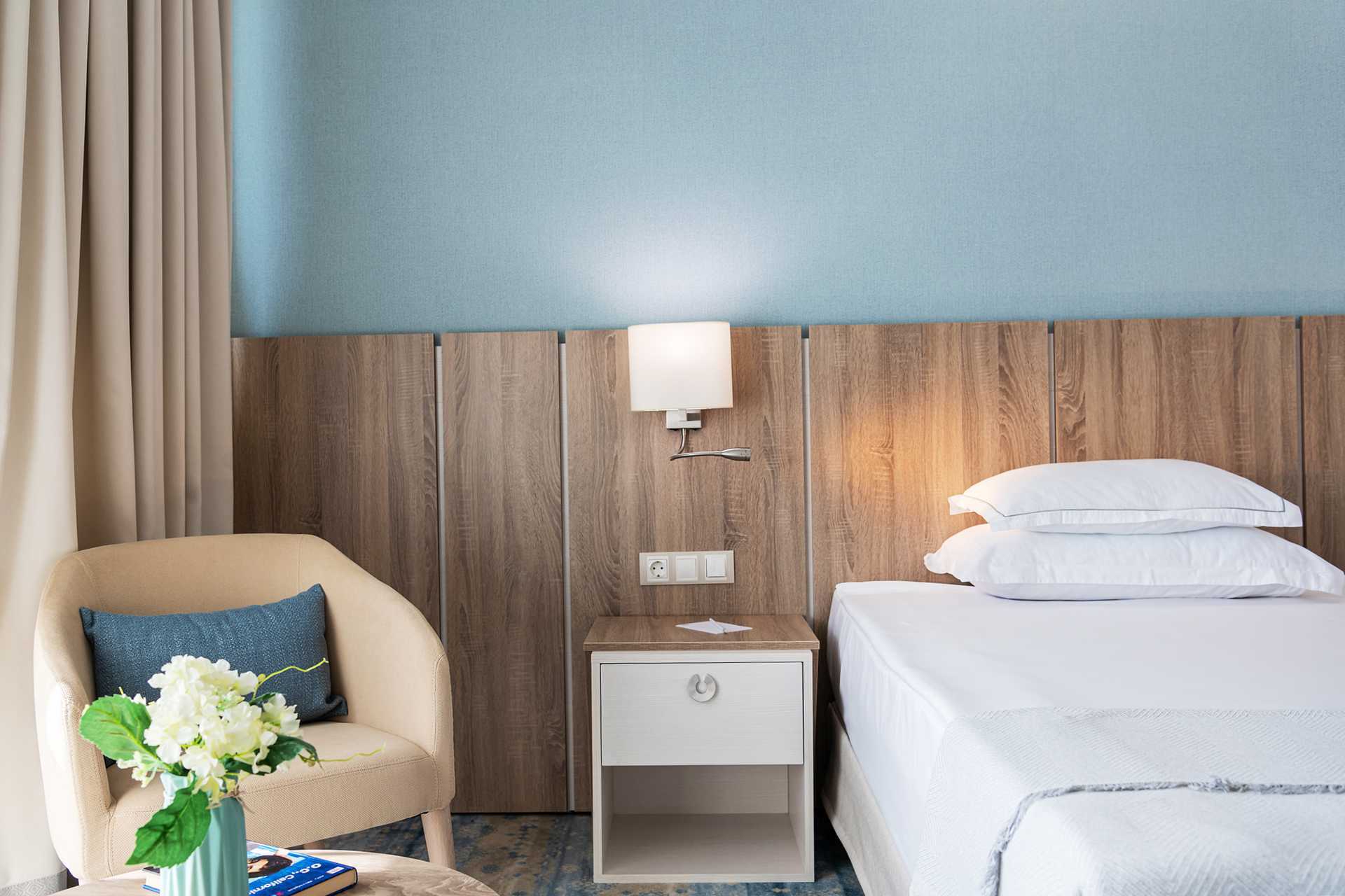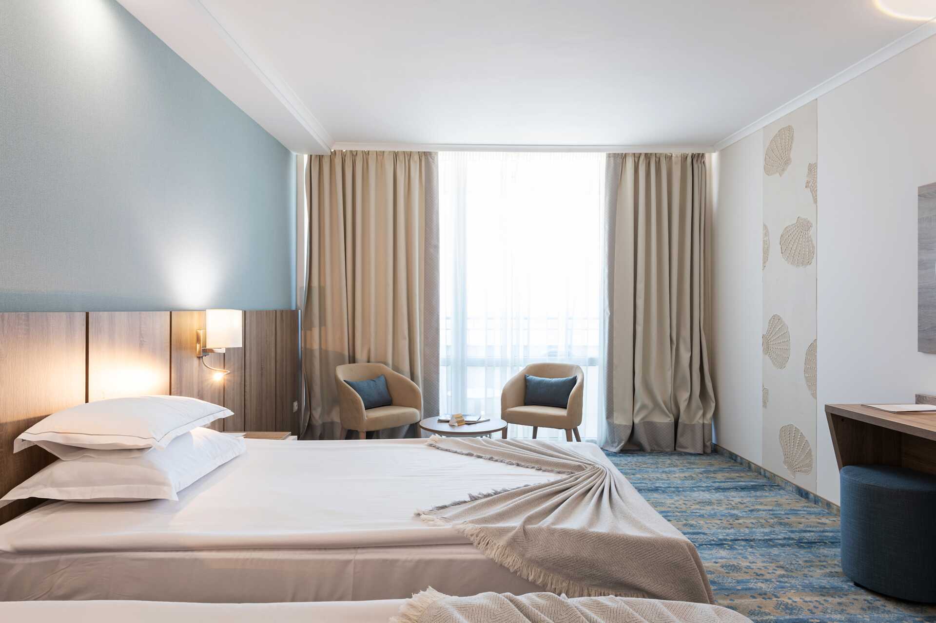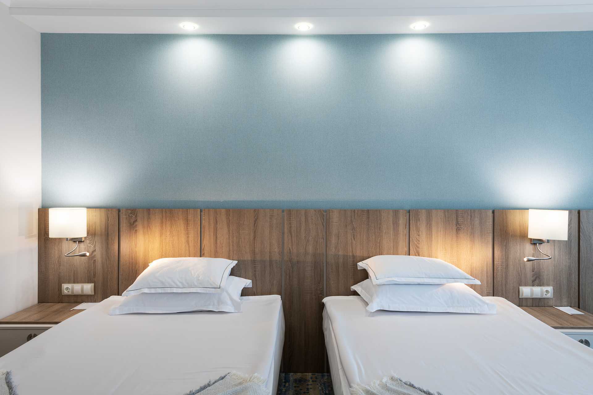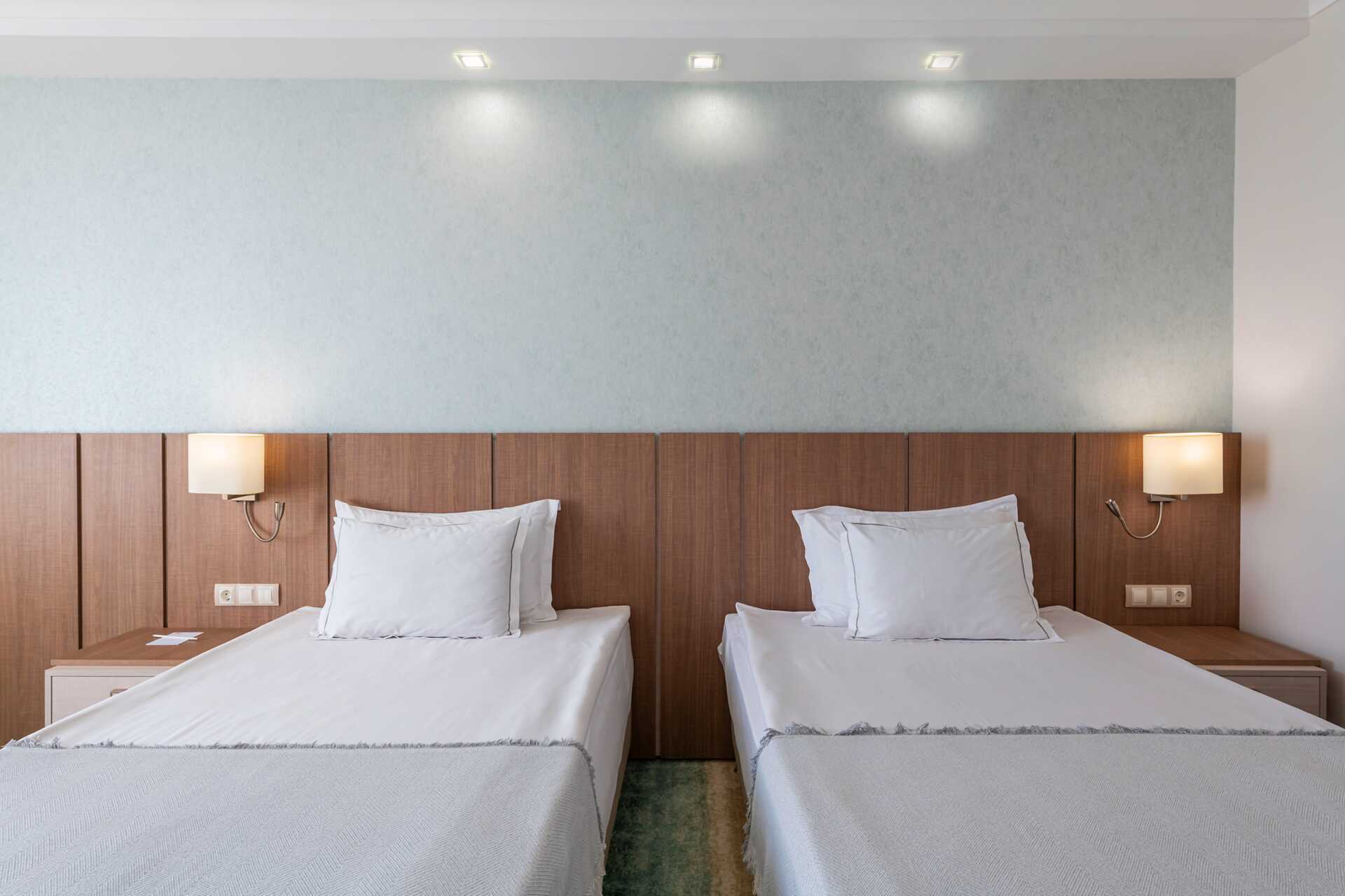 Standard-huone parvekkeella. Huoneet sijaitsevat hotellin lisärakennuksessa. Kaksi yhden hengen sänkyä. Maksuton wifi, ilmastointi ja tallelokero. Kokolattiamatto. Minibaari lisämaksulla. Kahvinkeitin - kapselit sisältyvät hintaan ja täytetään viikon aikana. Tv kansainvälisillä kanavilla. Hiustenkuivain. Kylpyhuoneessa suihku ja wc. Siivous 7 krt/viikko.