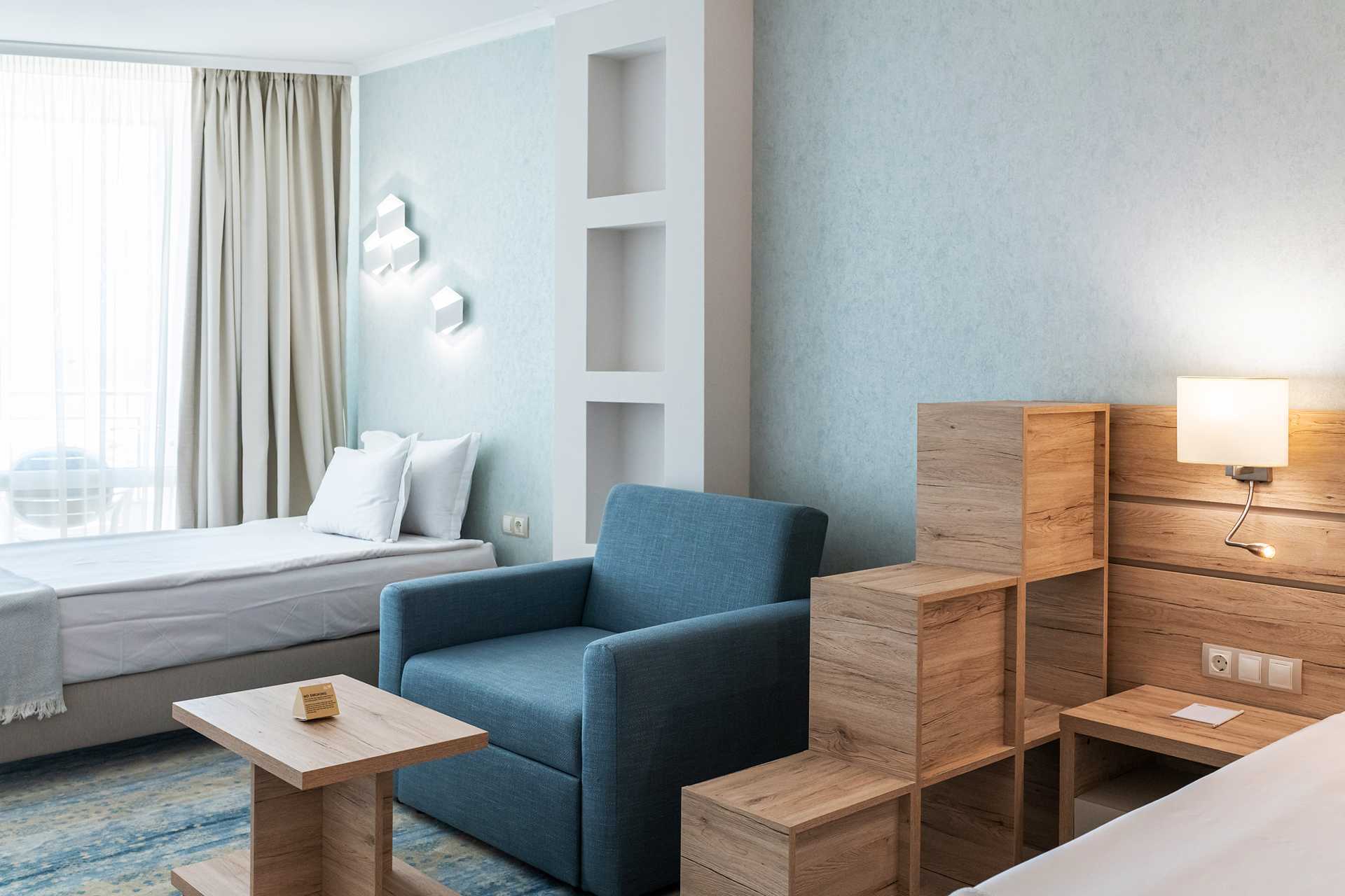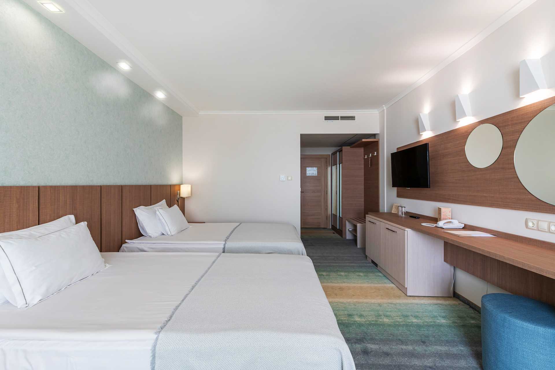 Standard-huone parvekkeella. Huoneet sijaitsevat hotellin lisärakennuksessa. Kaksi yhden hengen sänkyä. Lisävuodemahdollisuus sohvassa/nojatuolissa. Maksuton wifi, ilmastointi ja tallelokero. Kokolattiamatto. Minibaari lisämaksulla. Kahvinkeitin - kapselit sisältyvät hintaan ja täytetään viikon aikana. Tv kansainvälisillä kanavilla. Hiustenkuivain. Suihku ja wc. Siivous 7 krt/viikko.