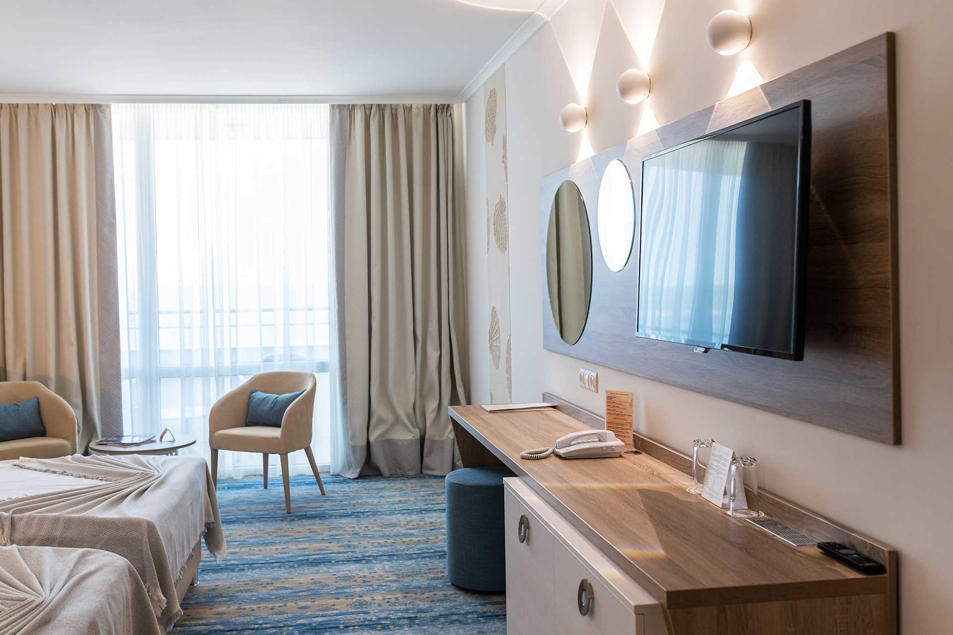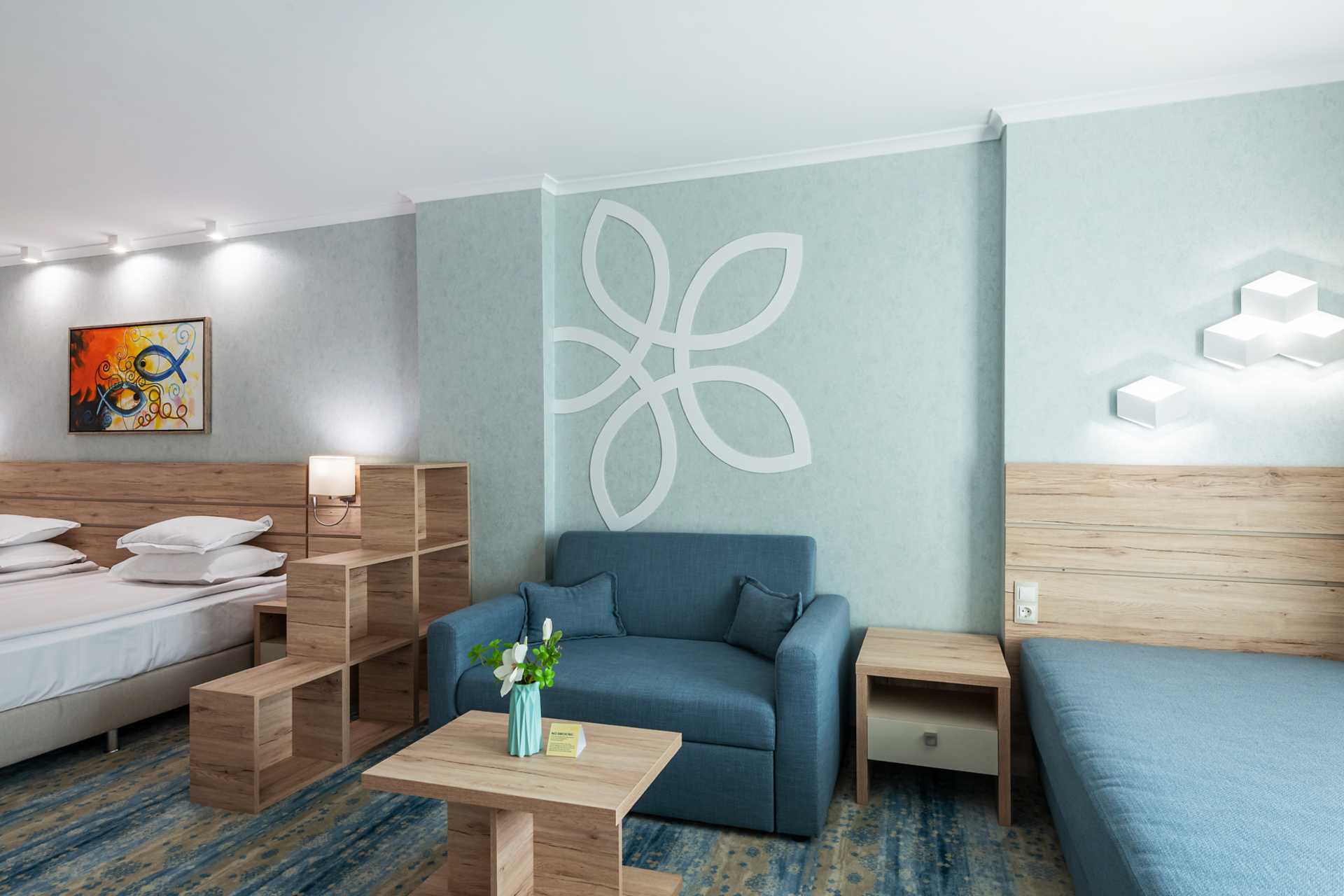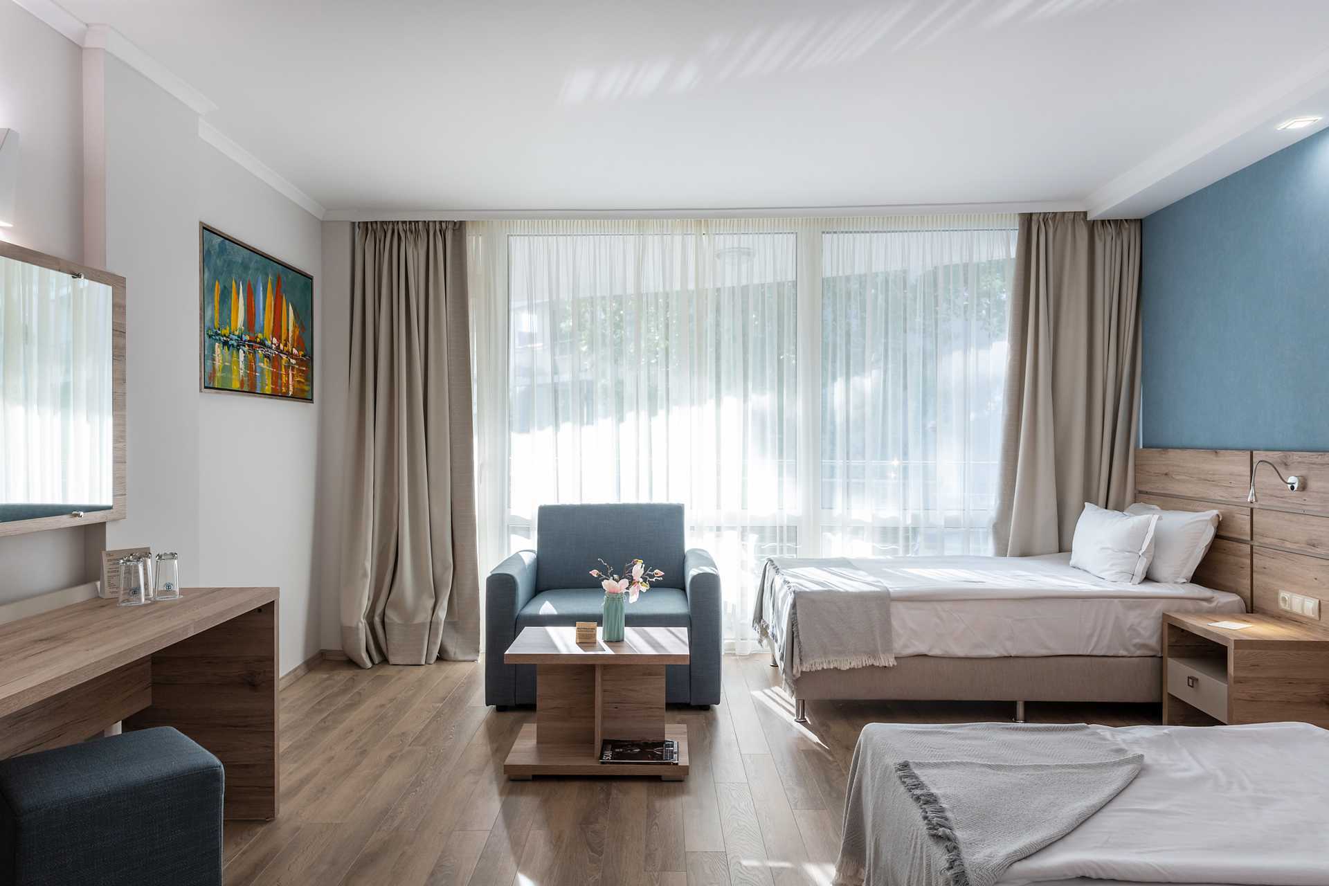 Perhehuone parvekkeella, osa merinäköalalla. Huoneet sijaitsevat hotellin päärakennuksessa. Kolme erillistä sänkyä tai yksi parisänky ja yksi yhden hengen sänky. Lisävuodemahdollisuus olemassa olevissa vuoteissa ja vuodesohvassa. Kokolattiamatto. Maksuton wifi, ilmastointi ja tallelokero. Minibaari, lisämaksusta. Kahvinkeitin - kapselit sisältyvät hintaan ja täytetään viikon aikana. Tv kansainvälisillä kanavilla. Hiustenkuivain. Suihku ja wc. Siivous 7 krt/viikko.