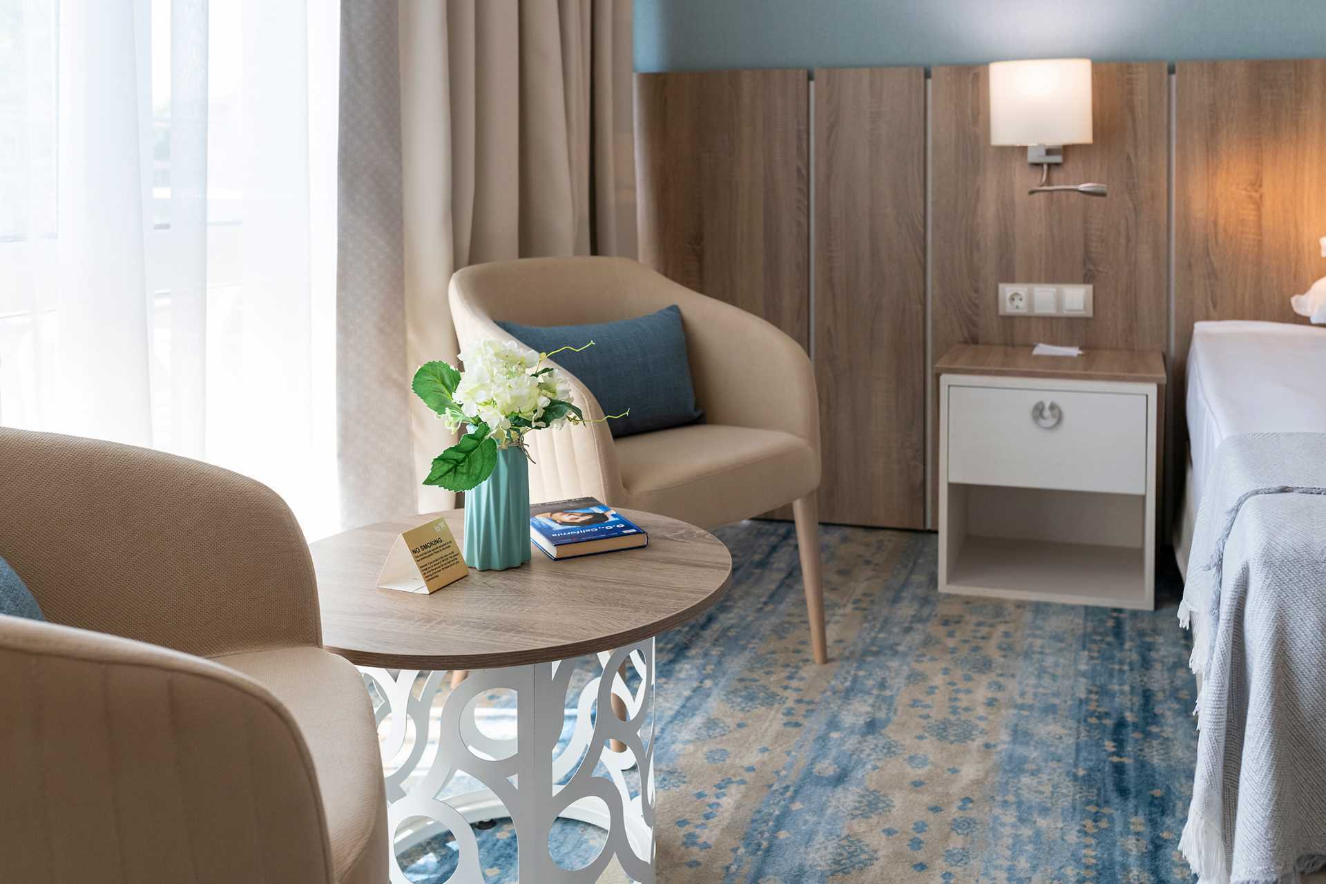 Superior-huoneissa on parveke, joista osasta on merinäköala. Huoneet sijaitsevat hotellin päärakennuksessa. Kaksi yhden hengen sänkyä. Lisävuodemahdollisuus yhden hengen vuoteessa tai vuodesohvassa/nojatuolissa. Maksuton wifi, ilmastointi ja tallelokero. Kokolattiamatto. Minibaari lisämaksulla. Kahvinkeitin - kapselit sisältyvät hintaan ja täytetään viikon aikana. Tv kansainvälisillä kanavilla. Hiustenkuivain. Suihku ja wc. Siivous 7 krt/viikko.