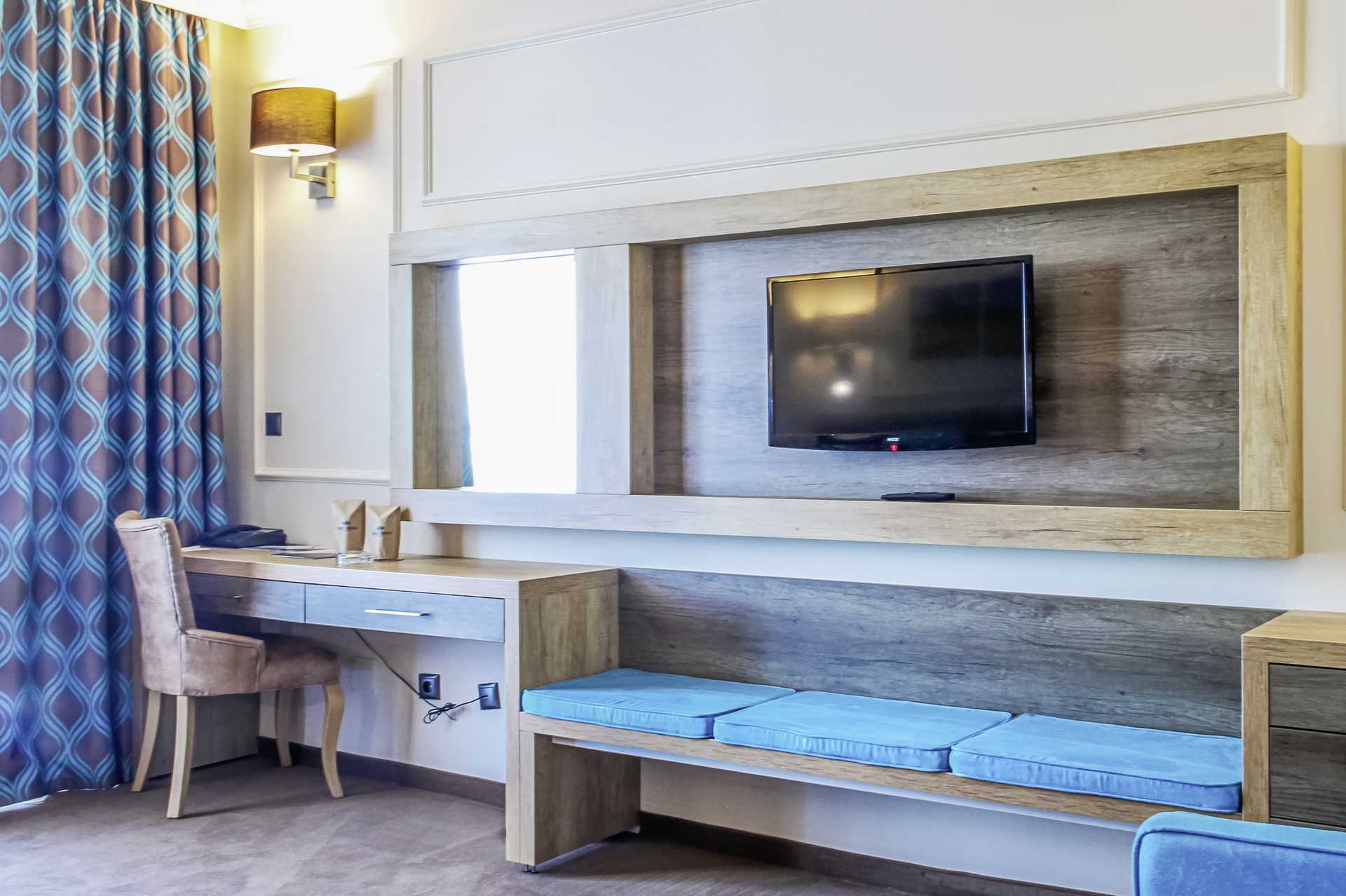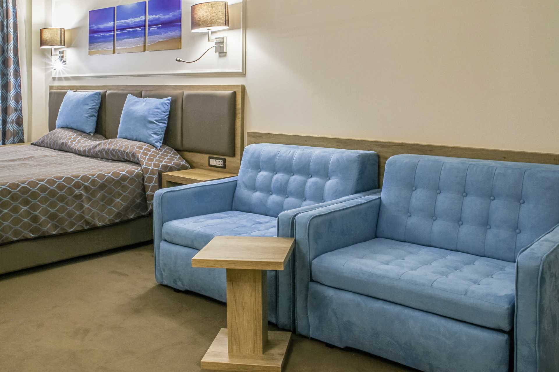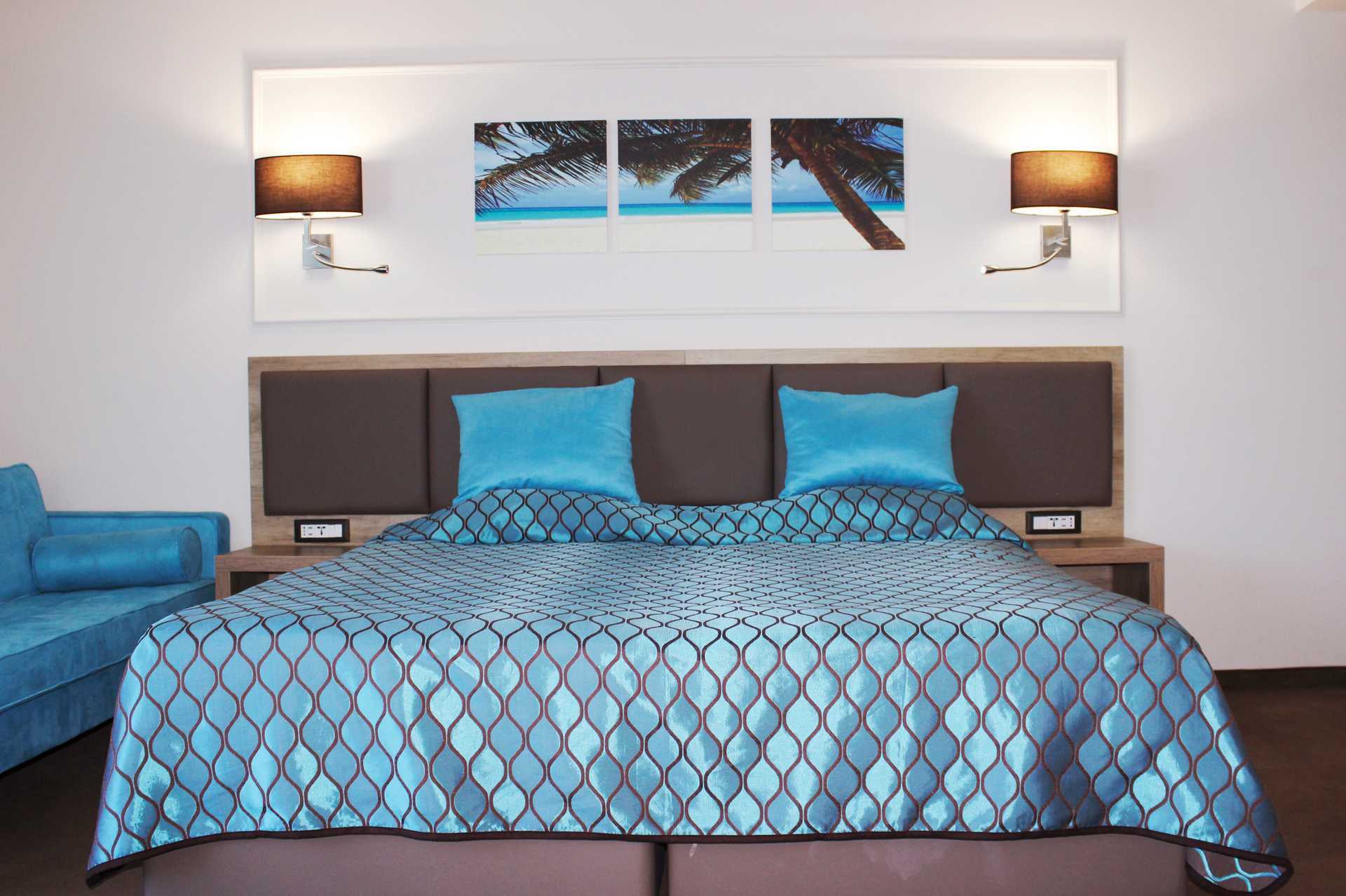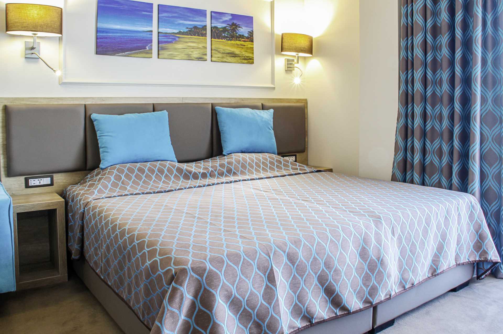 Kahden hengen huoneita, joissa on parveke, osassa rajoitettu merinäköala. Parivuode tai kaksi yhden hengen sänkyä. Lisävuodemahdollisuus sohvassa/nojatuolissa. Kokolattiamatto. Maksuton ilmastointi ja wifi. Tallelokero lisämaksusta. Jääkaappi. Vedenkeitin. Kahvinkeitin – kapselit sisältyvät hintaan ja täytetään päivittäin, lisää voi noutaa vastaanotosta. Tv kansainvälisillä kanavilla. Hiustenkuivain. Suihku ja wc. Siivous 7 krt/viikko.