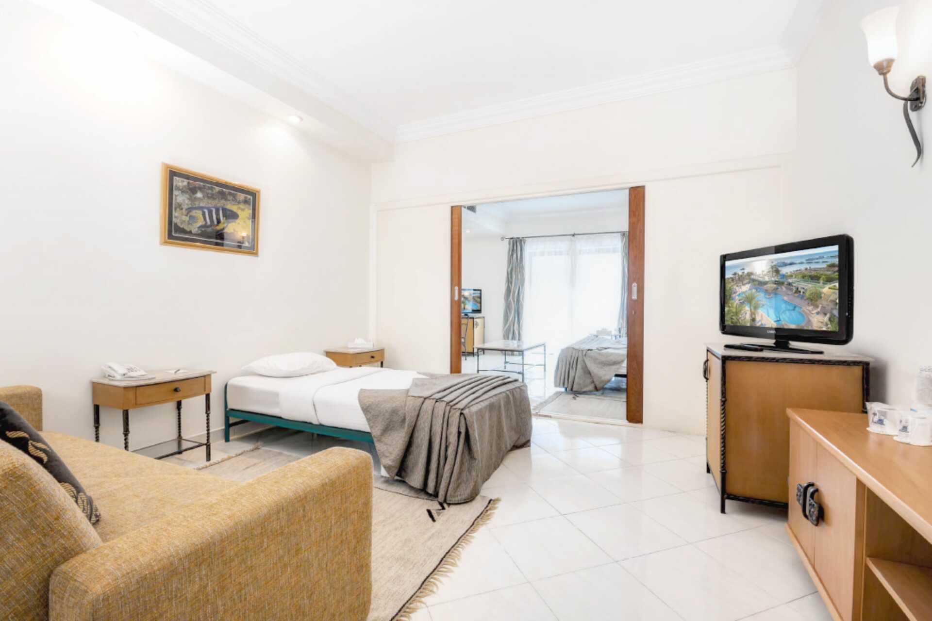 Perhehuone parvekkeella tai terassilla. All Inclusive sisältyy hintaan. Perhehuoneessa on kaksi makuuhuonetta. Yksi makuuhuone, jossa parivuode tai kaksi erillistä vuodetta. Lisävuodemahdollisuus yhden hengen sänkyyn ja vuodesohva tai kaksi erillistä sänkyä toisessa makuuhuoneessa. Maksuton ilmastointi. Tallelokero ja wifi lisämaksulla. Minibaari - pieni vesipullo maksutta - täytetään päivittäin, muut juomat ja välipalat lisämaksusta. Vedenkeitin, kahvia ja teetä. Tv kansainvälisillä kanavilla. Hiustenkuivain. Kylpyamme tai suihku ja wc. Siivous 7 krt/viikko.