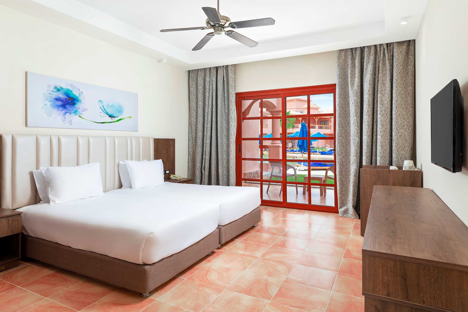 Perhehuone, jossa on parveke tai terassi ja allasnäköala. Perhehuoneet koostuvat kahdesta erillisestä makuuhuoneesta. Toisessa makuuhuoneessa parisänky ja toisessa kerrossänky tai parisänky. Maksuton wifi, ilmastointi ja tallelokero. Jääkaappi ja alkoholiton juoma saavuttaessa. Vedenkeitin, kahvia ja teetä. Tv kansainvälisillä kanavilla. Hiustenkuivain. Kylpyhuoneessa suihku ja wc. Siivous 7 krt/viikko.