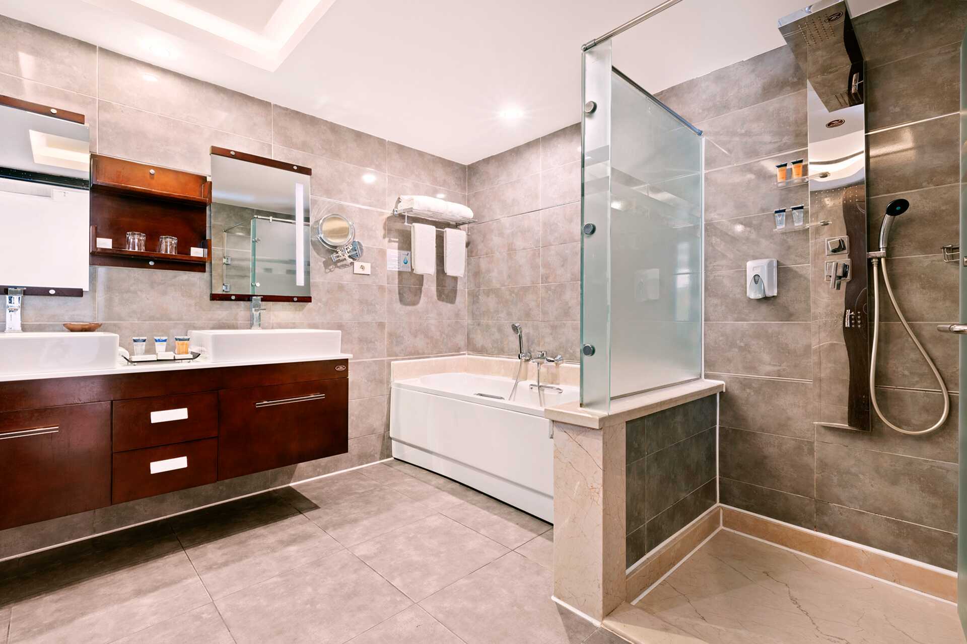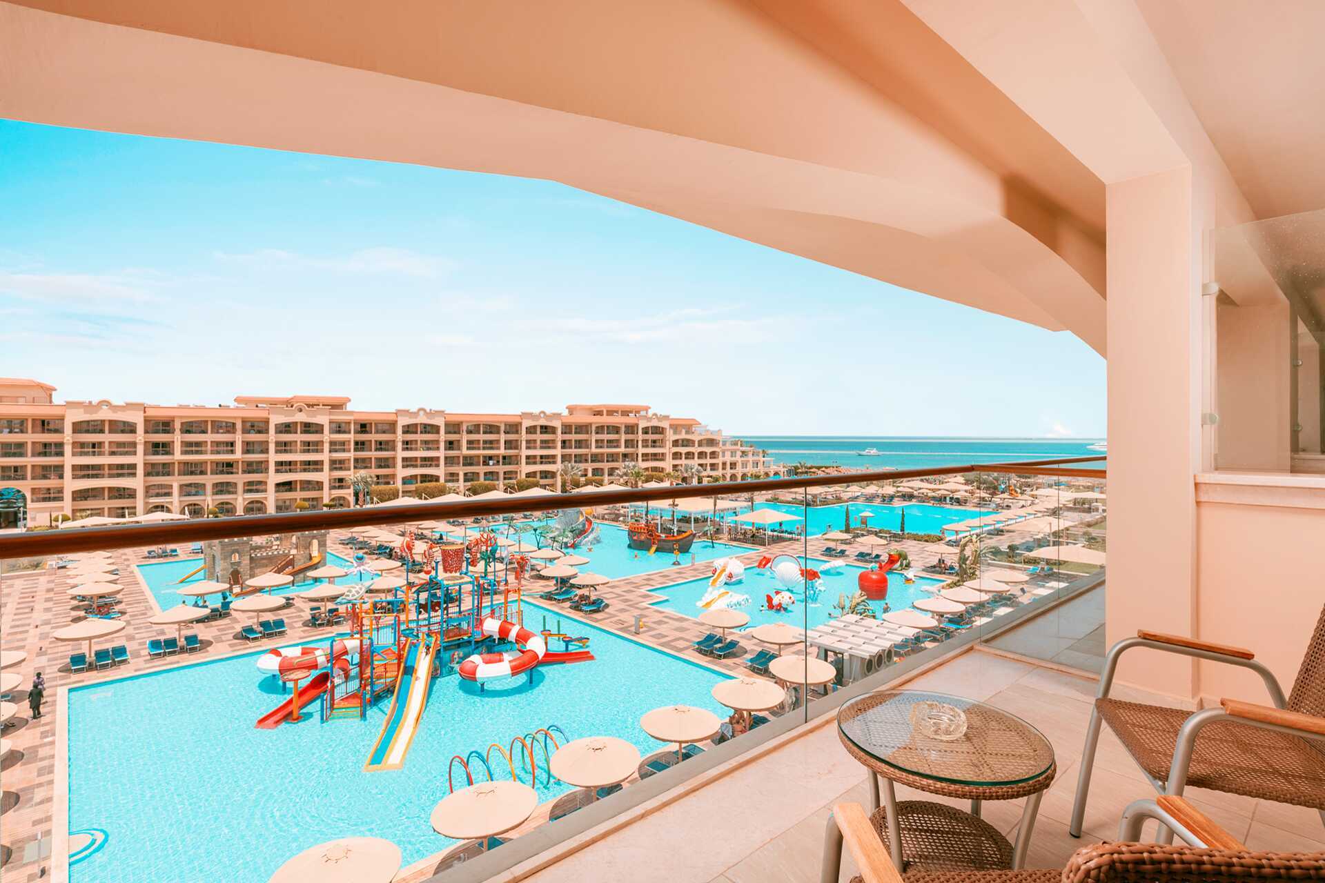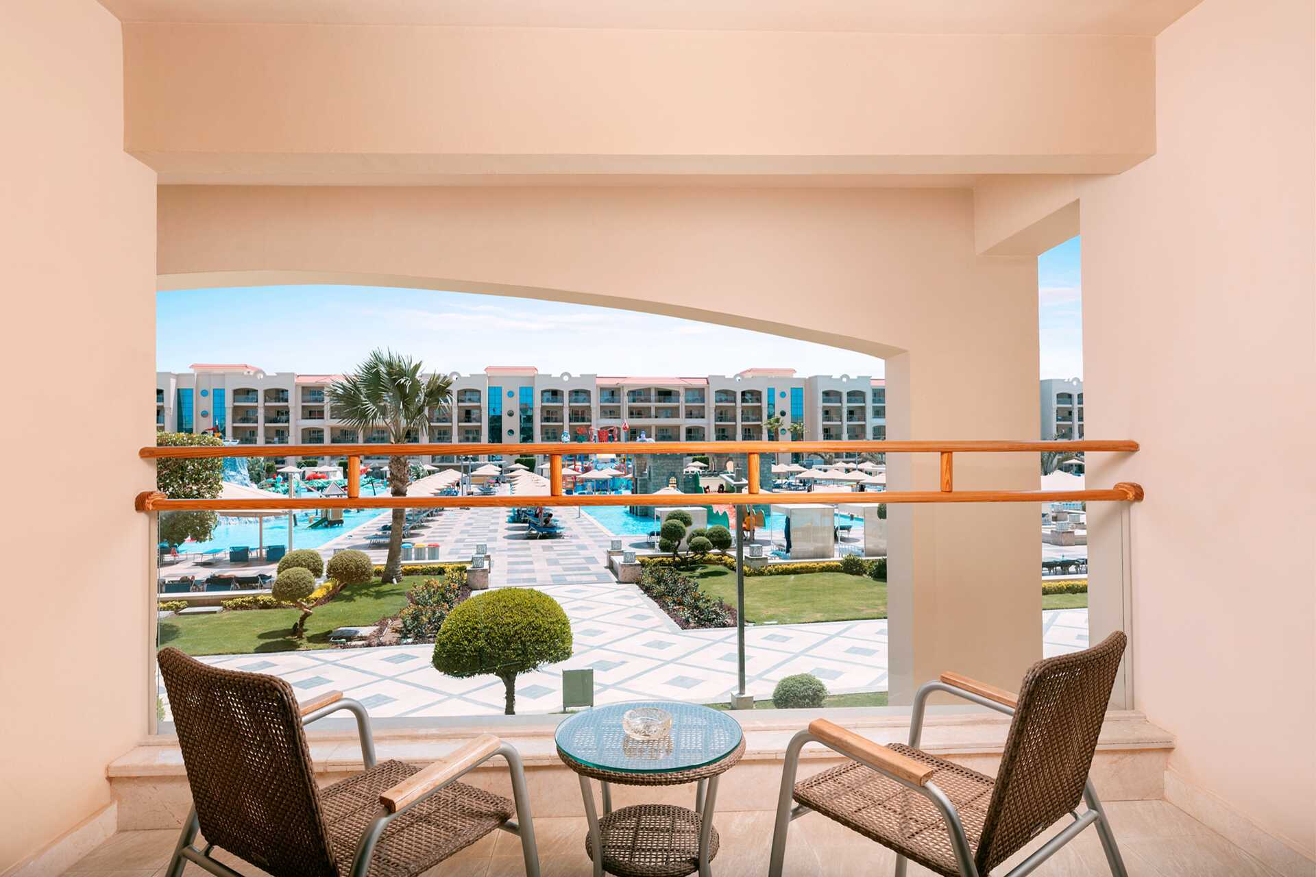Deluxe-huone parvekkeella ja meri- tai allasnäköalalla. Joissakin parvekkeissa on vain matala väliseinä viereiselle parvekkeelle. Parivuode tai kaksi yhden hengen sänkyä. Lisävuodemahdollisuus kokoontaitettavaan sänkyyn tai vuodesohvaan. Maksuton wifi, ilmastointi ja tallelokero. Minibaari lisämaksulla. Vesi täytetään ilmaiseksi. Vedenkeitin, kahvia ja teetä. Tv kansainvälisillä kanavilla. Hiustenkuivain. Kylpyamme tai suihku ja wc. Siivous 7 krt/viikko.