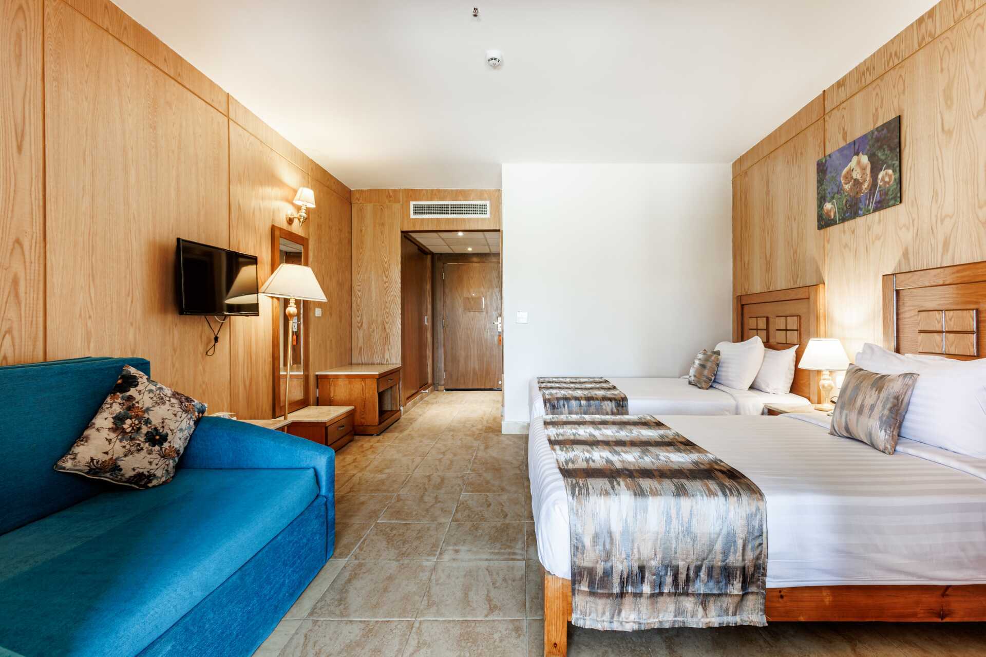 Perhehuoneita parvekkeella tai terassilla. Yhdessä makuuhuoneessa on parivuode ja toisessa makuuhuoneessa kaksi erillistä vuodetta. Maksuton wifi, ilmastointi ja tallelokero. Minibaari täytettynä virvoitusjuomilla ja vedellä saapuessa. Vedenkeitin, kahvia ja teetä. Tv kansainvälisillä kanavilla. Kylpytakit ja tossut. Hiustenkuivain. Kylpyhuoneessa suihku ja wc. Siivous 7 krt/viikko.