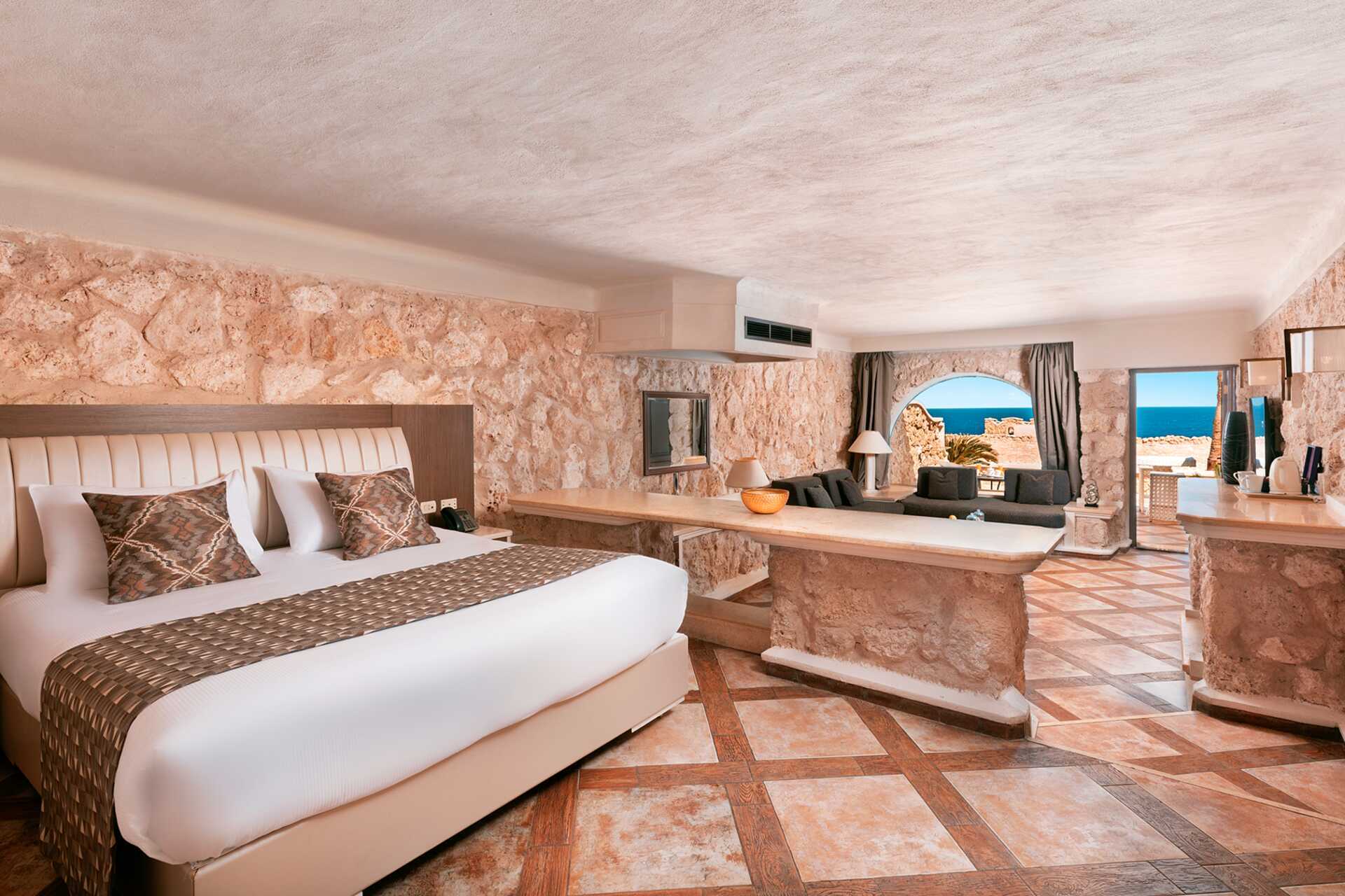 Kahden hengen huone, jossa on parveke tai terassi merinäköalalla. Huoneet näyttävät hieman erilaisilta riippuen siitä, missä rakennuksessa majoitut. Parivuode tai kaksi yhden hengen sänkyä. Lisävuodemahdollisuus vuodesohvasta. Maksuton wifi, ilmastointi ja tallelokero. Minibaari lisämaksulla. Vedenkeitin, kahvia ja teetä. Hiustenkuivain. Suihku ja wc. Siivous 7 krt/viikko.