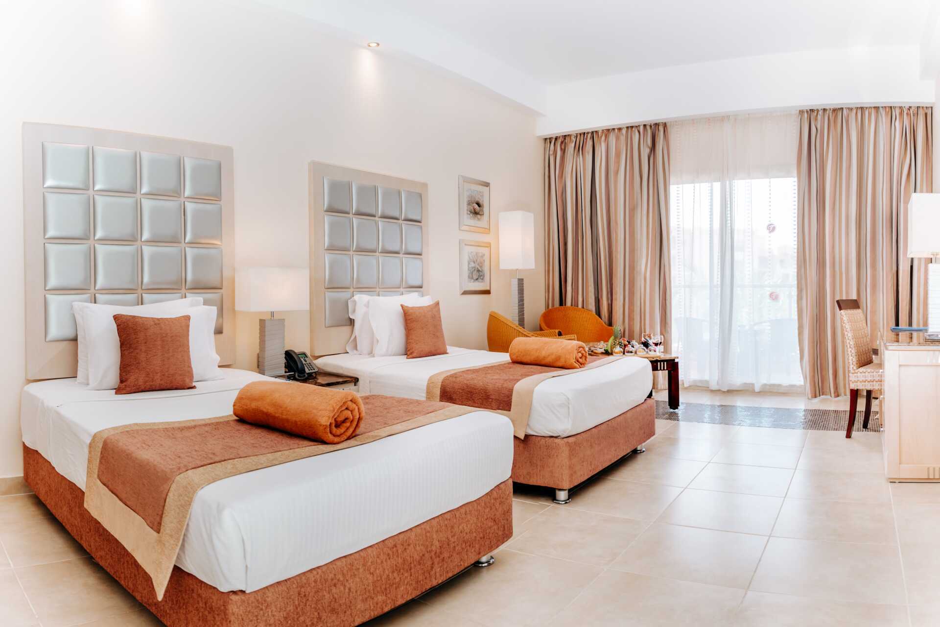 Raikkaita deluxe-huoneita, joissa parivuode tai kaksi erillistä vuodetta. Tv satelliittikanavilla. Maksuton wifi. Maksuton ilmastointi ja tallelokero. Kylpyhuone, jossa erillinen kylpyamme, suihku ja wc. Hiustenkuivain. Suuri vesipullo päivässä per henkilö. Kahvin ja teen keittomahdollisuus. Parveke, osassa merinäköala. Siivous 7 krt/vk. Alle 2-vuotiaat lasketaan lisävuoteella yöpyväksi henkilöksi.