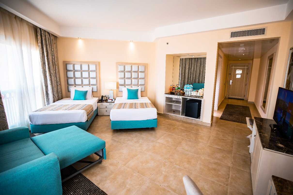 Perhehuone parvekkeella. Perhehuoneessa on kaksi kahden hengenvuodetta, joiden välissä on väliovi. Parivuode. Mahdollisuus lisävuoteisiin, kaksi erillistä sänkyä ja vuodesohva. Maksuton wifi, ilmastointi ja tallelokero. Vedenkeitin, kahvia ja teetä. Suuri vesipullo per henkilö/päivä sisältyy hintaan. Jokaisessa huoneessa on televisio kansainvälisillä kanavilla. Hiustenkuivain. Kaksi kylpyhuonetta, toisessa kylpyamme ja suihku ja toisessa vain suihku ja wc. Siivous 7 krt/viikko. Alle 2-vuotiaat lapset lasketaan lisävuoteella majoittuviksi henkilöiksi.