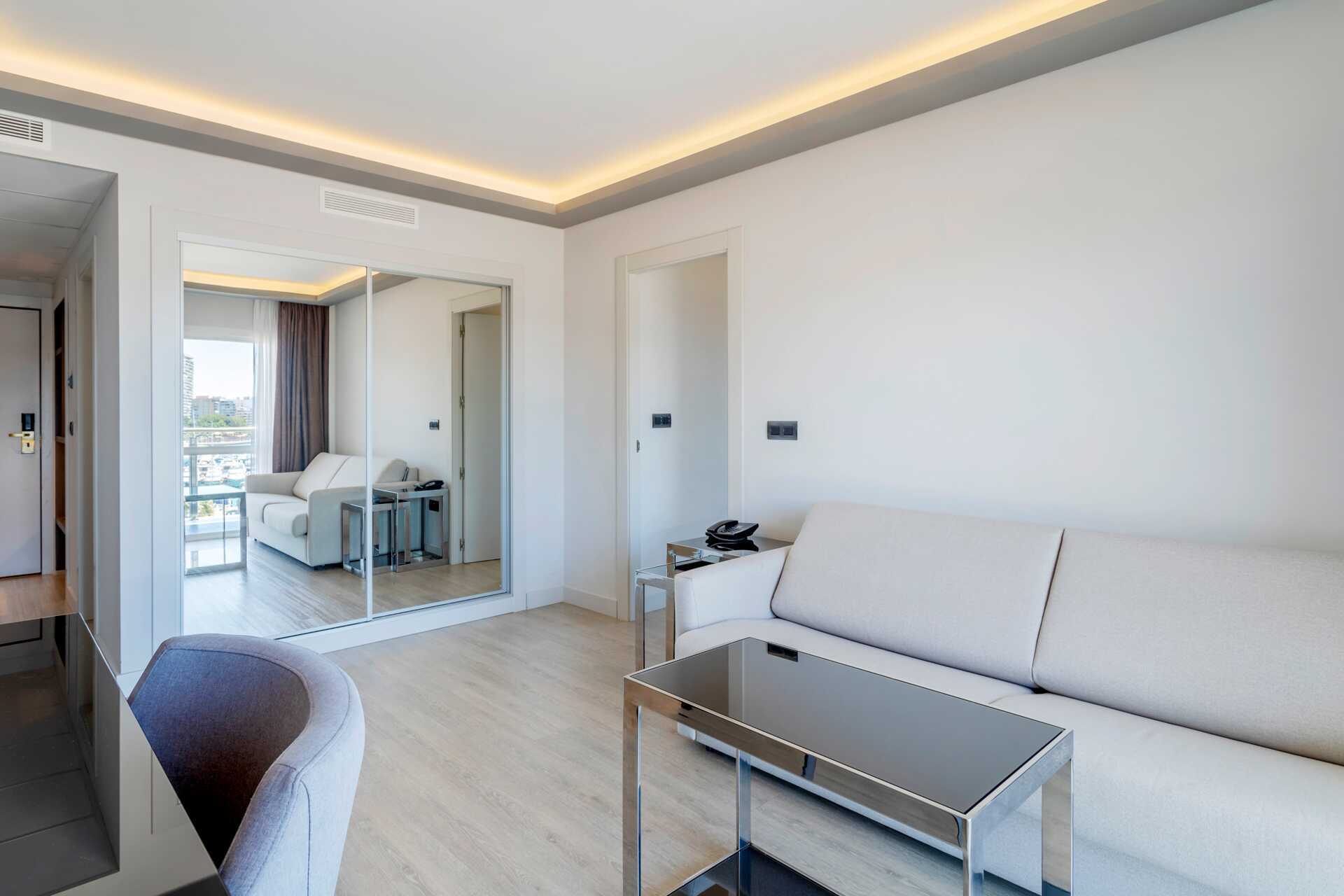 Juniorsviitti parvekkeella. Juniorsviitit koostuvat makuuhuoneesta ja olohuoneesta. Yksi parivuode tai kaksi erillistä vuodetta. Lisävuodemahdollisuus vuodesohvasta. Maksuton wifi ja ilmastointi. Tallelokero lisämaksusta. Jääkaappi. Tv kansainvälisillä kanavilla. Hiustenkuivain. Kylpyhuoneessa kylpyamme tai suihku ja wc. Siivous 5 krt/viikko.