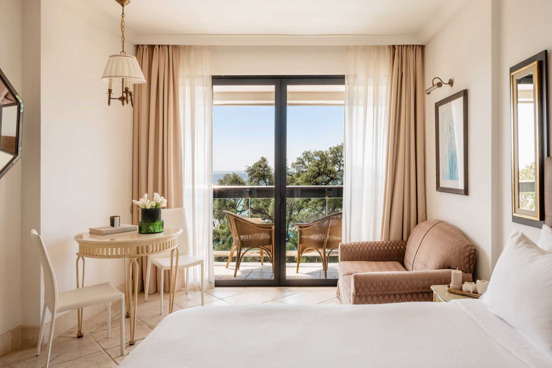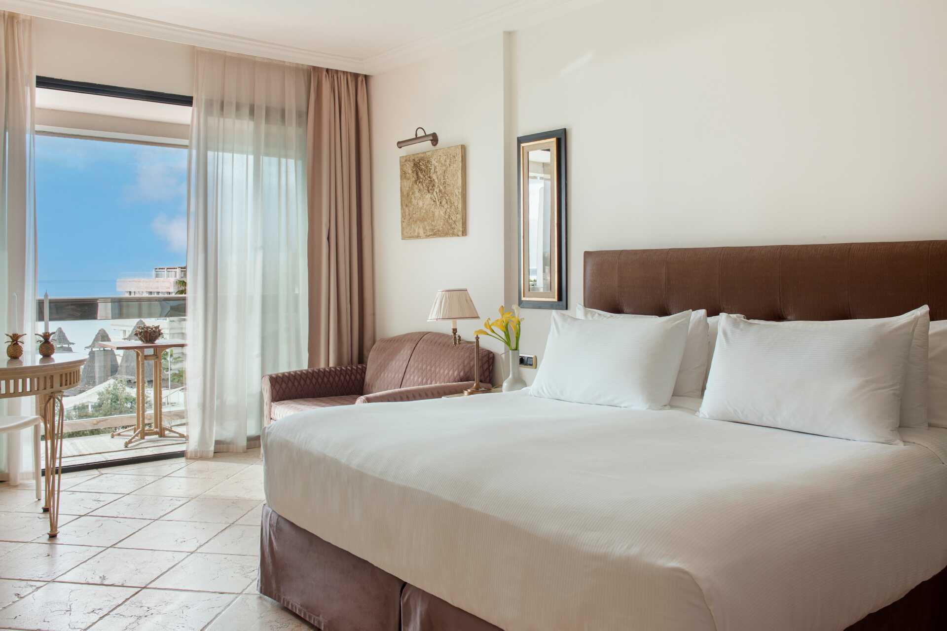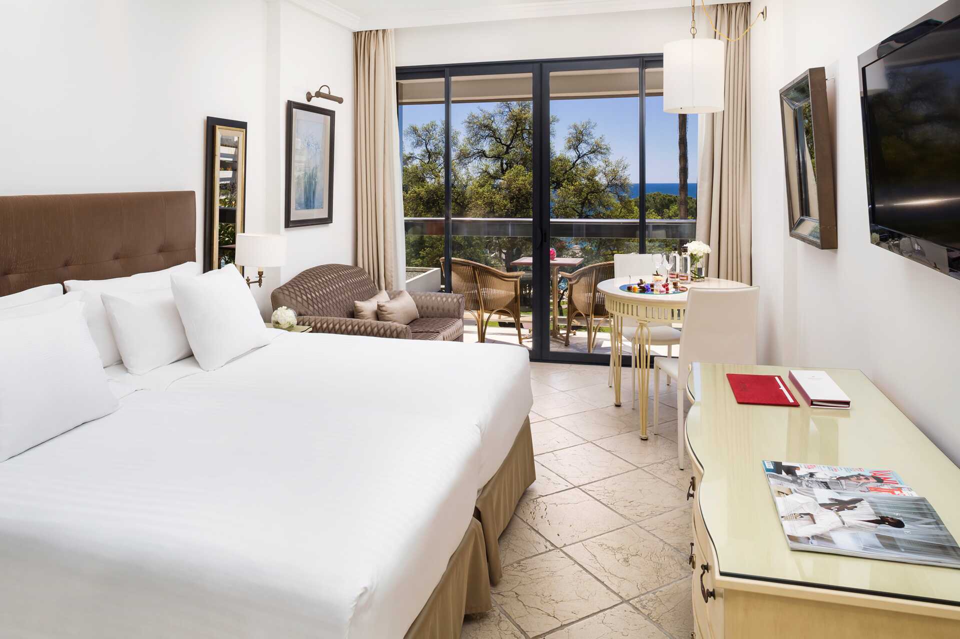 Deluxe-huone parvekkeella ja merinäköalalla. Huoneet sijaitsevat kerroksissa 5, 6 tai 7. Parivuode tai kaksi erillistä sänkyä. Lisävuodemahdollisuus vuodesohvasta. Maksuton wifi, ilmastointi ja tallelokero. Minibaari. Vedenkeitin, kahvia ja teetä. Nespresso-kahvinkeitin - kapselit sisältyvät hintaan. Tv kansainvälisillä kanavilla. Kylpytakit ja tohvelit. Kylpyhuoneessa suihku ja wc. Siivous 7 krt/viikko. Alle 2-vuotiaat lapset lasketaan lisävuoteella majoittuviksi henkilöiksi.