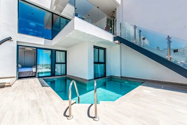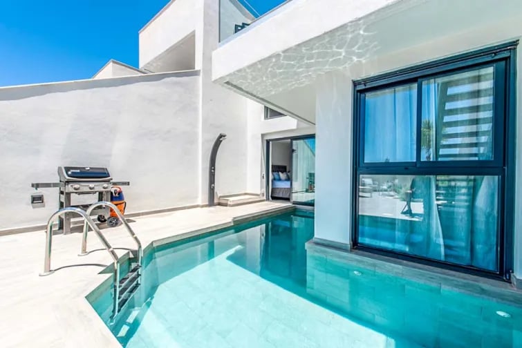 Kuten huvilan kuvista näkyy, yhden kahden hengen makuuhuoneen ulko-ovet sijaitsevat suoraan uima-altaan vieressä, joten tässä huoneessa tulisi olla vain aikuisia. Tässä huvilassa on L-muotoinen uima-allas, ja verkkosivuillamme olevat mitat ovat pisimmän ja leveimmän sivun mitat.