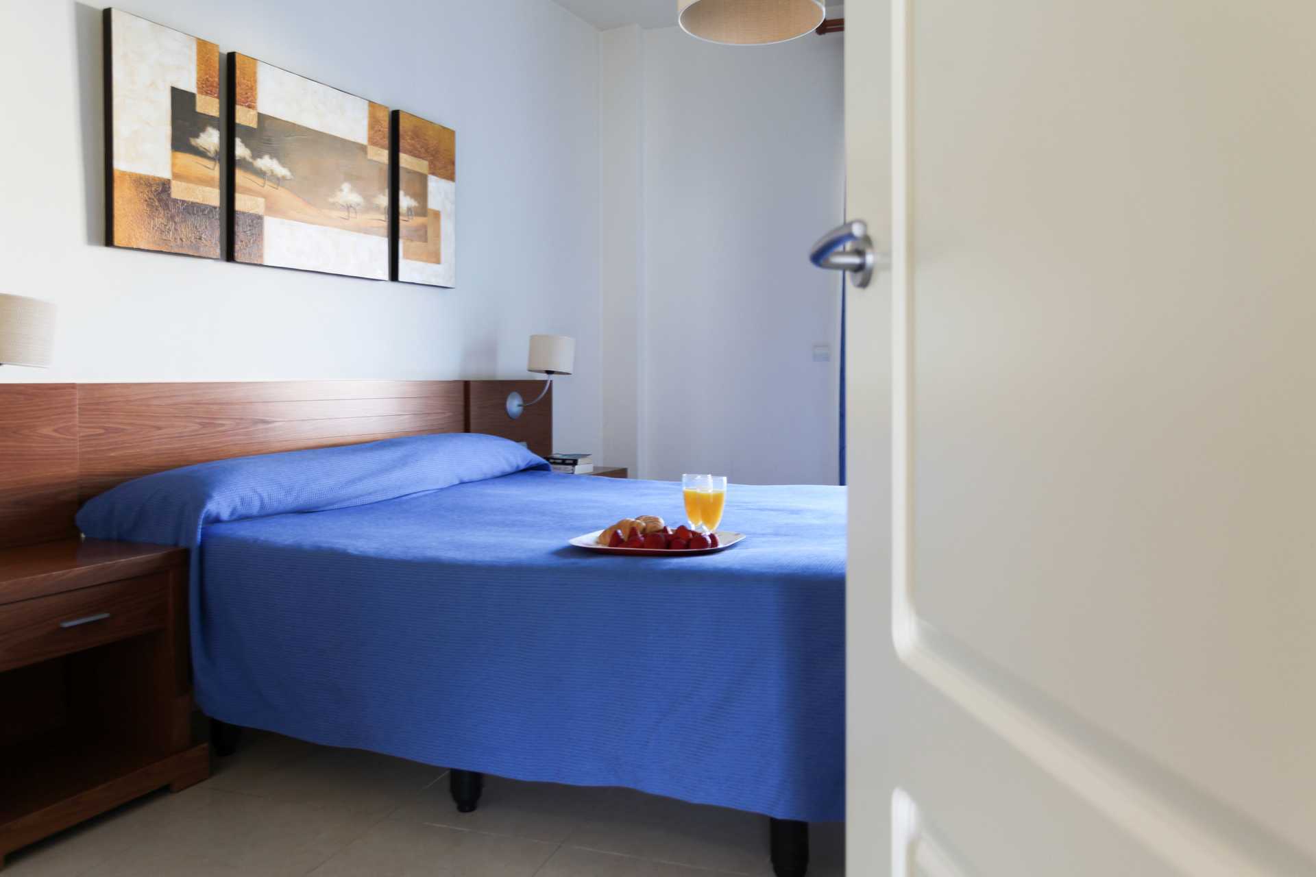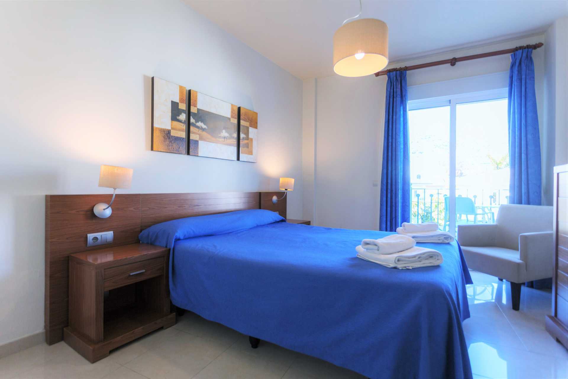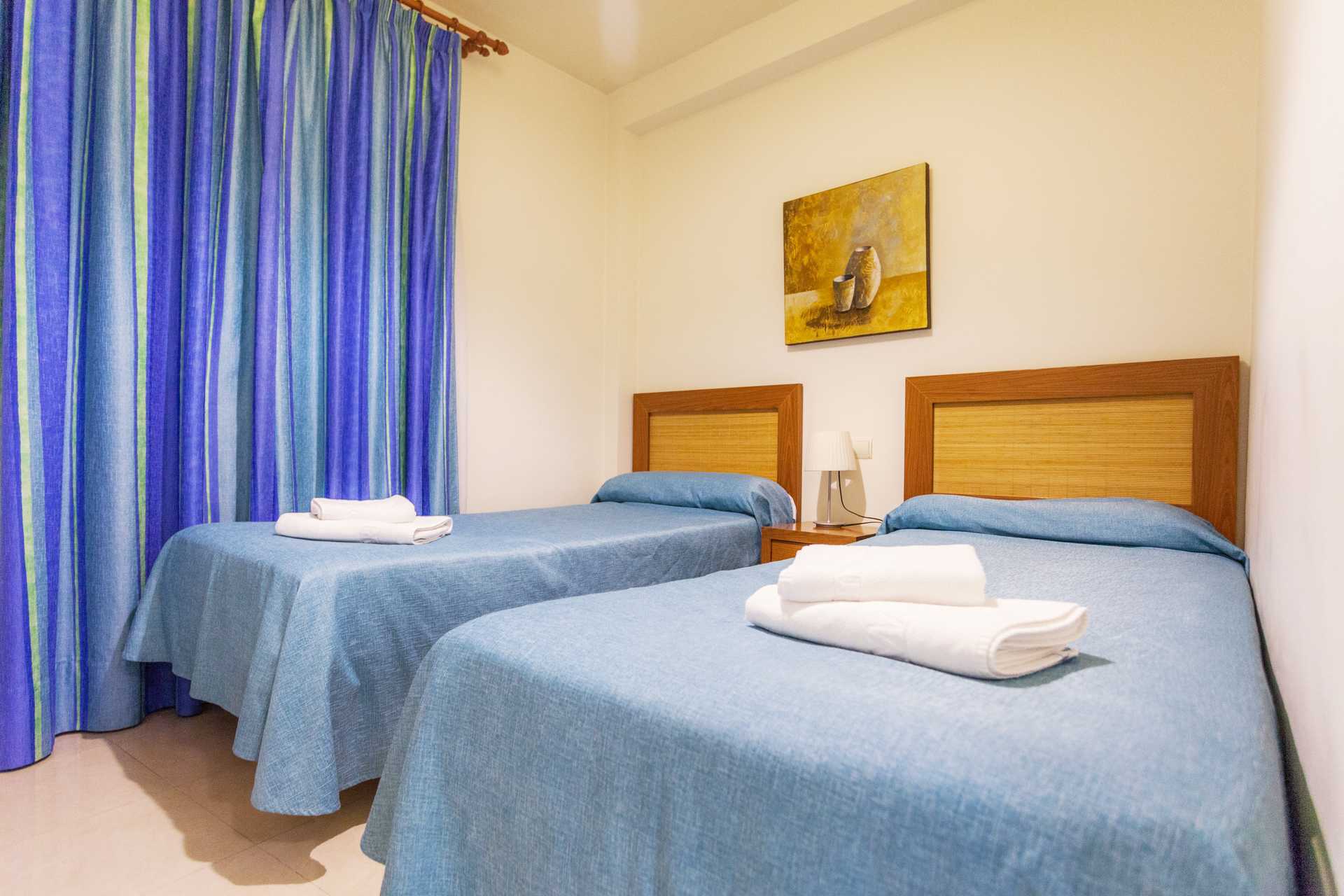 Kolmio parvekkeella tai terassilla. Kaksi makuuhuonetta sekä yhdistetty olohuone ja minikeittiö. Toisessa makuuhuoneessa kaksi erillistä sänkyä ja toisessa parisänky. Lisävuodemahdollisuus vuodesohvasta. Minikeittiö, jossa keittolevyt, jääkaappi, mikroaaltouuni, vedenkeitin, kahvinkeitin, jääkaappipakastin, astianpesukone ja peruskeittiövälineet. Maksuton wifi ja ilmastointi. Tallelokero lisämaksusta. Tv kansainvälisillä kanavilla. Silitysrauta ja -lauta. Pesukone. Hiustenkuivain. Kylpyamme suihkulla ja wc:llä. Siivous 7 krt/viikko.