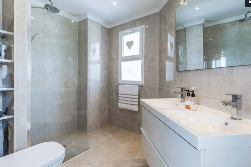Alakerran suihkuhuoneessa on ovet, jotka yhdistävät molempiin makuuhuoneisiin.