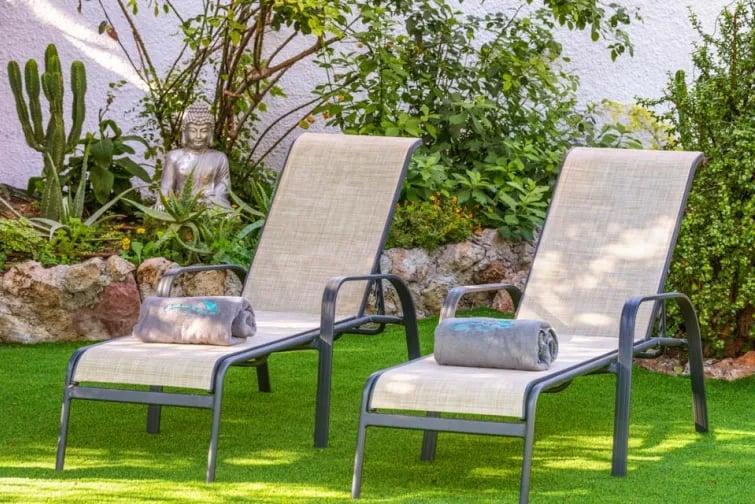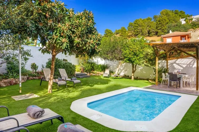 Ulkona on reilun kokoinen puutarha, joka sopii täydellisesti pienille lapsille energian purkamiseen, ja oma uima-allas on täydellinen paikka pulahtaa vilvoittelemaan kuumaa eteläespanjalaista aurinkoa vasten. Ulkoilmaelämä on avainasemassa Espanjassa, ja huvilan tiiligrillin ja kutsuvien ulkoruokailutilojen ansiosta voit tuntea olosi paikalliseksi ulkoilmassa ruokaillessa.
