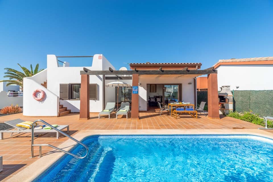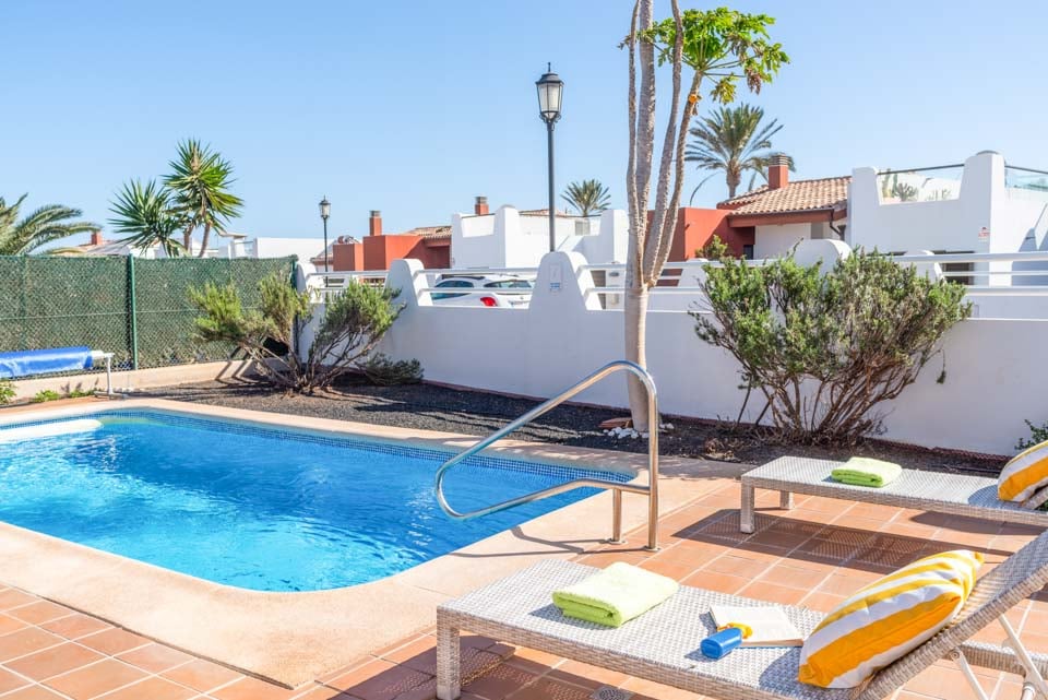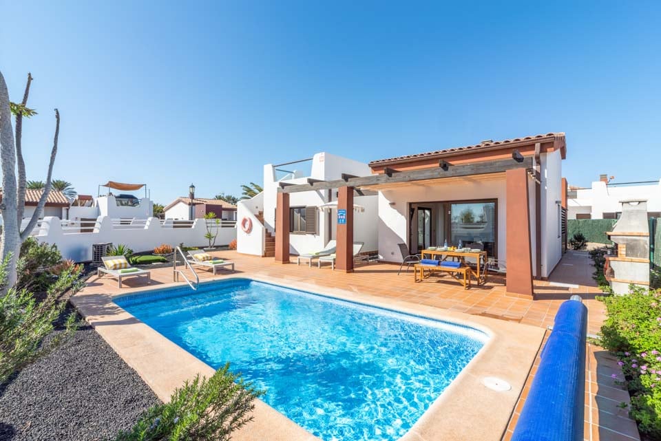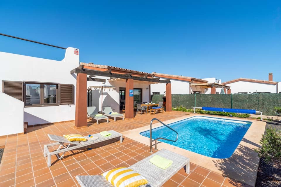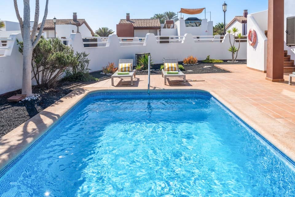 Uppoudu aurinkoiseen paratiisiin unelmoivalla terassilla, jonka keskipisteenä on kimalteleva uima-allas. Vehreän puutarhan ja palmujen ympäröimänä voit rentoutua aurinkotuolissa ja nauttia ympäristöstä. Suurelta kattoterassilta sinua hemmotellaan näkymällä arvostetulle Las Salinasin golfkentälle, maaseudulle ja kaukaisuudessa kimaltelevalle rannikolle. Kun olet valmis tutustumaan ympäristöön, Caleta de Fuste odottaa vain viiden minuutin ajomatkan päässä unelmoivan kultaisen hiekkarannan ja lukuisten ravintoloiden, baarien ja kauppojen parissa. Golfin ystävät ovat kaikki valmiita hiomaan lyöntiään läheisellä Fuerteventura Golf Clubilla.