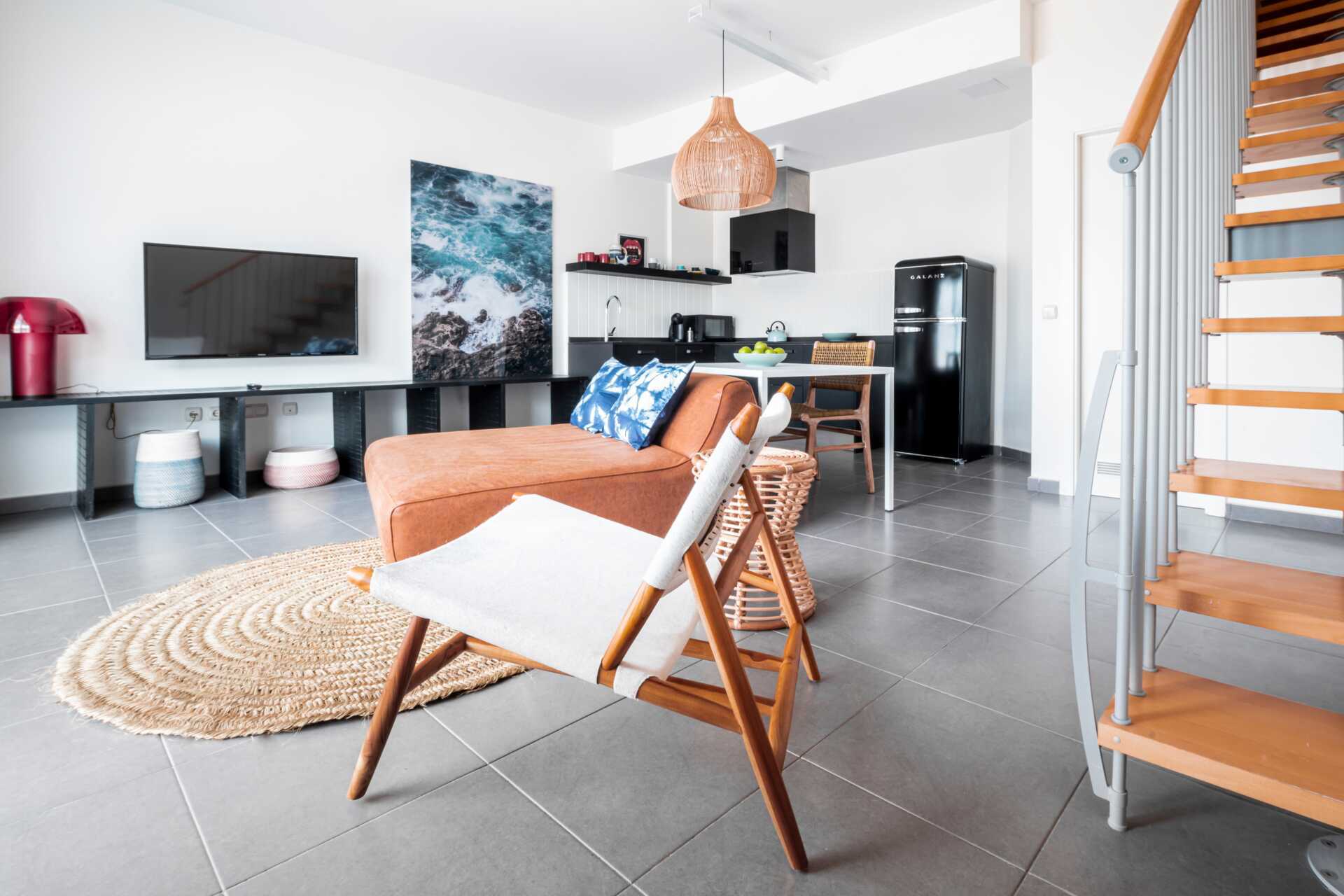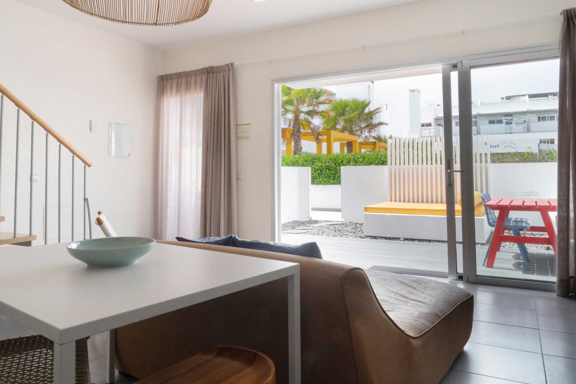 Huoneistot maaterassilla ovat kahdessa kerroksessa. Sisäänkäyntikerroksessa on yhdistetty olohuone, jossa on minikeittiö, sekä terassi, jossa on ruokapöytä tuoleineen ja vuodesohva. Yläkerrassa on kaksi makuuhuonetta, joista toisessa on kaksi erillistä vuodetta ja toisessa kerrossänky, sekä kylpyhuone. Pohjakerroksen terassi on kadulle päin.