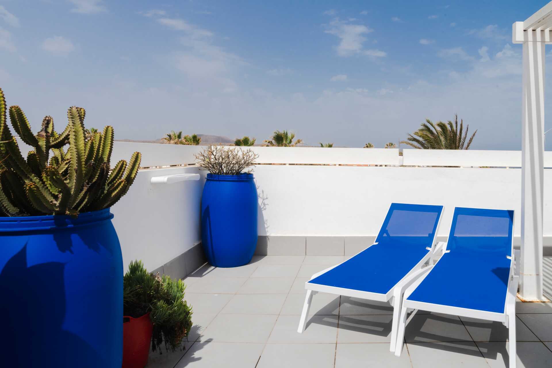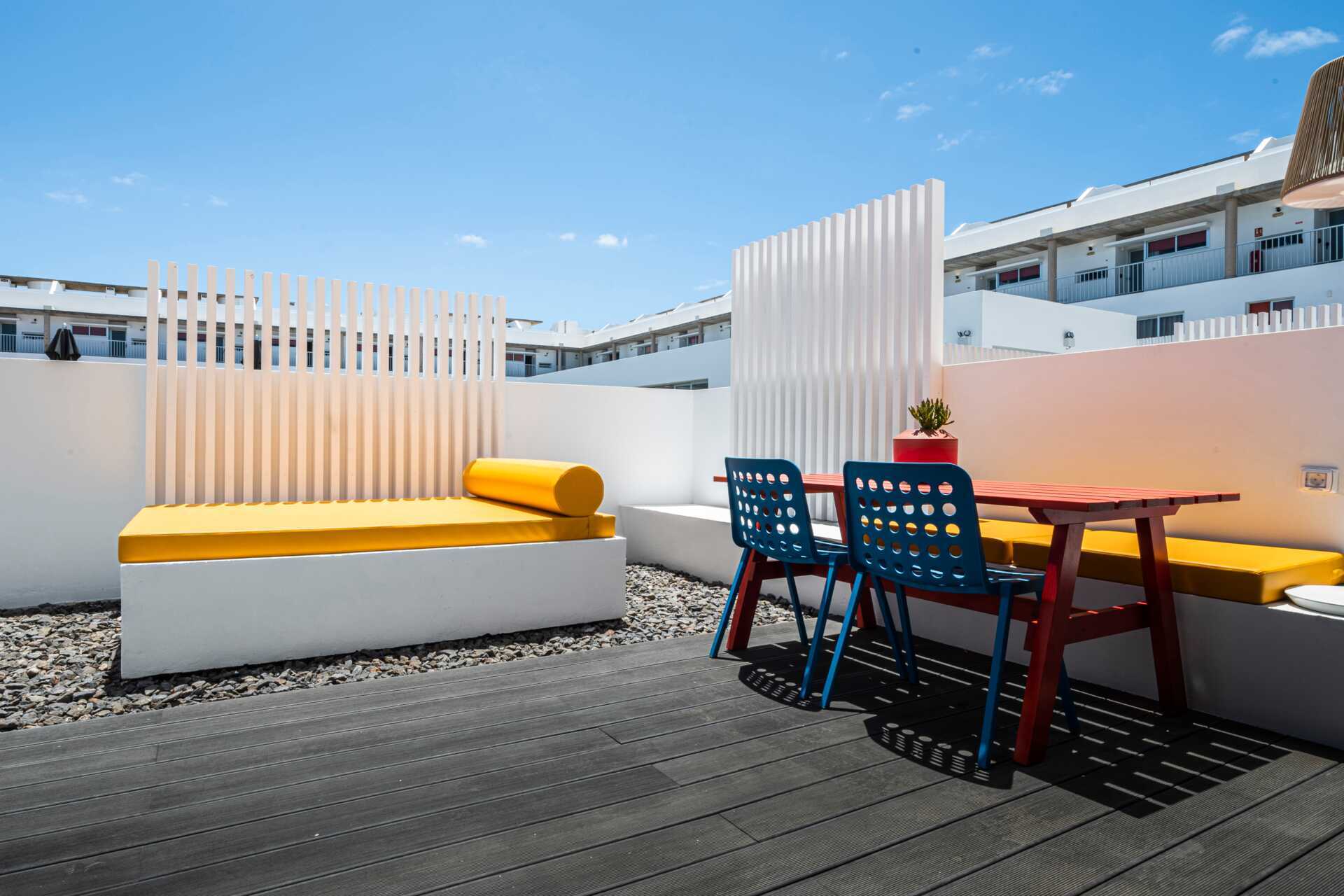 Kattoterassilla varustettujen huoneistojen sisääntulokerroksessa on yhdistetty olohuone keittokomeroineen, kylpyhuone, kaksi makuuhuonetta ja kapeat kierreportaat kattoterassille, jossa on ruokailutila ja aurinkotuoleja - terassin osissa on aurinkokatto .