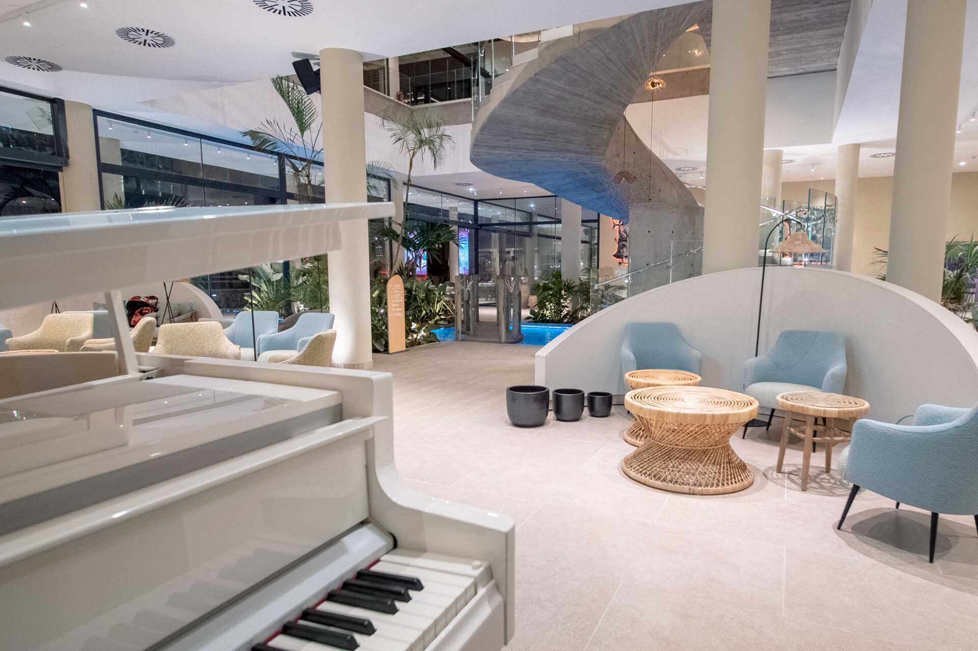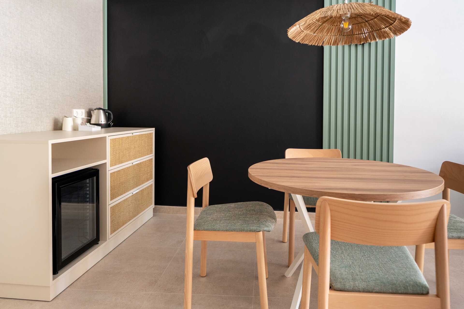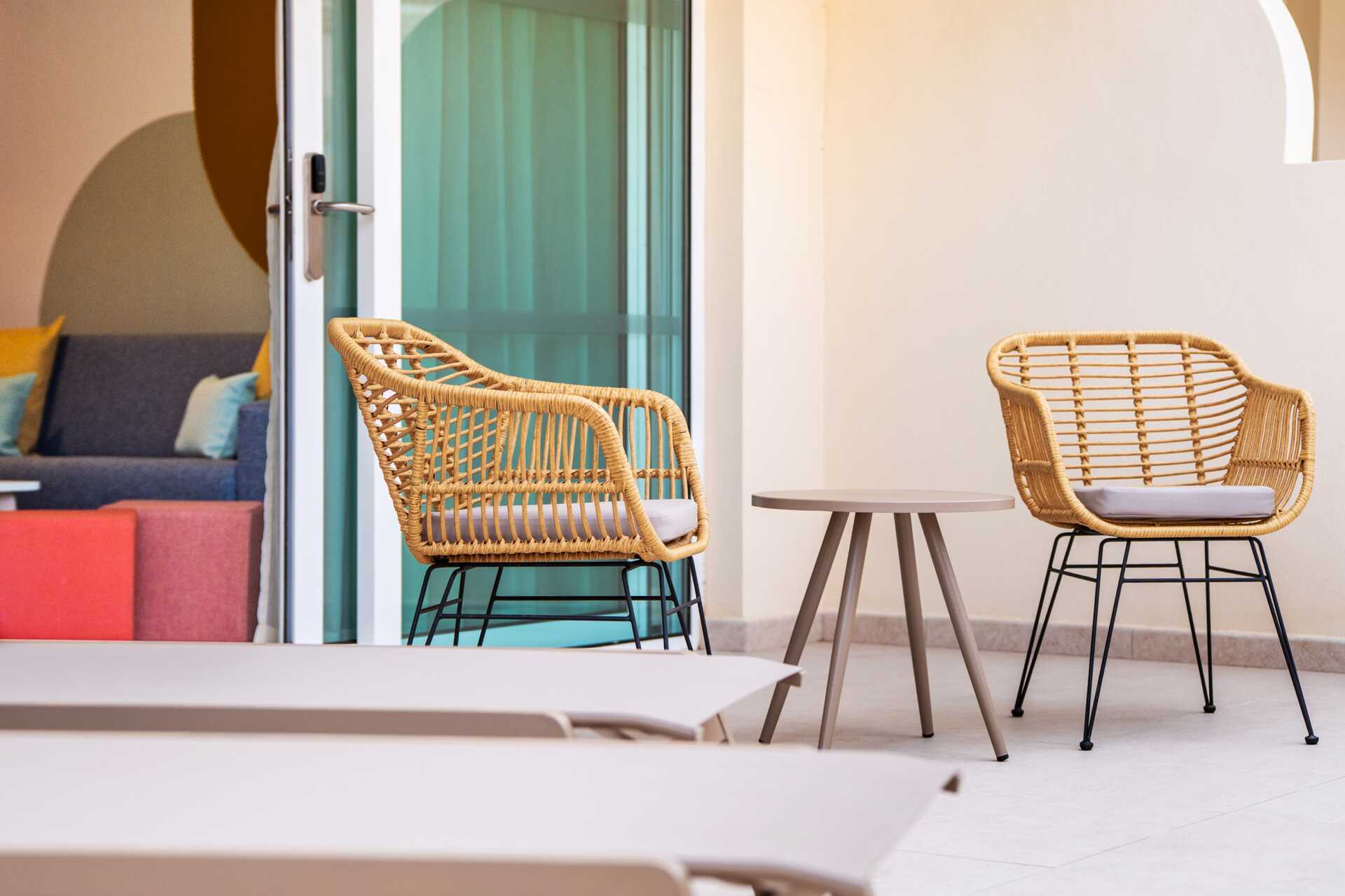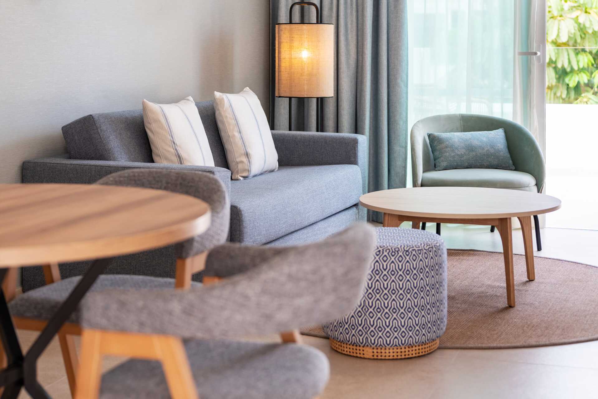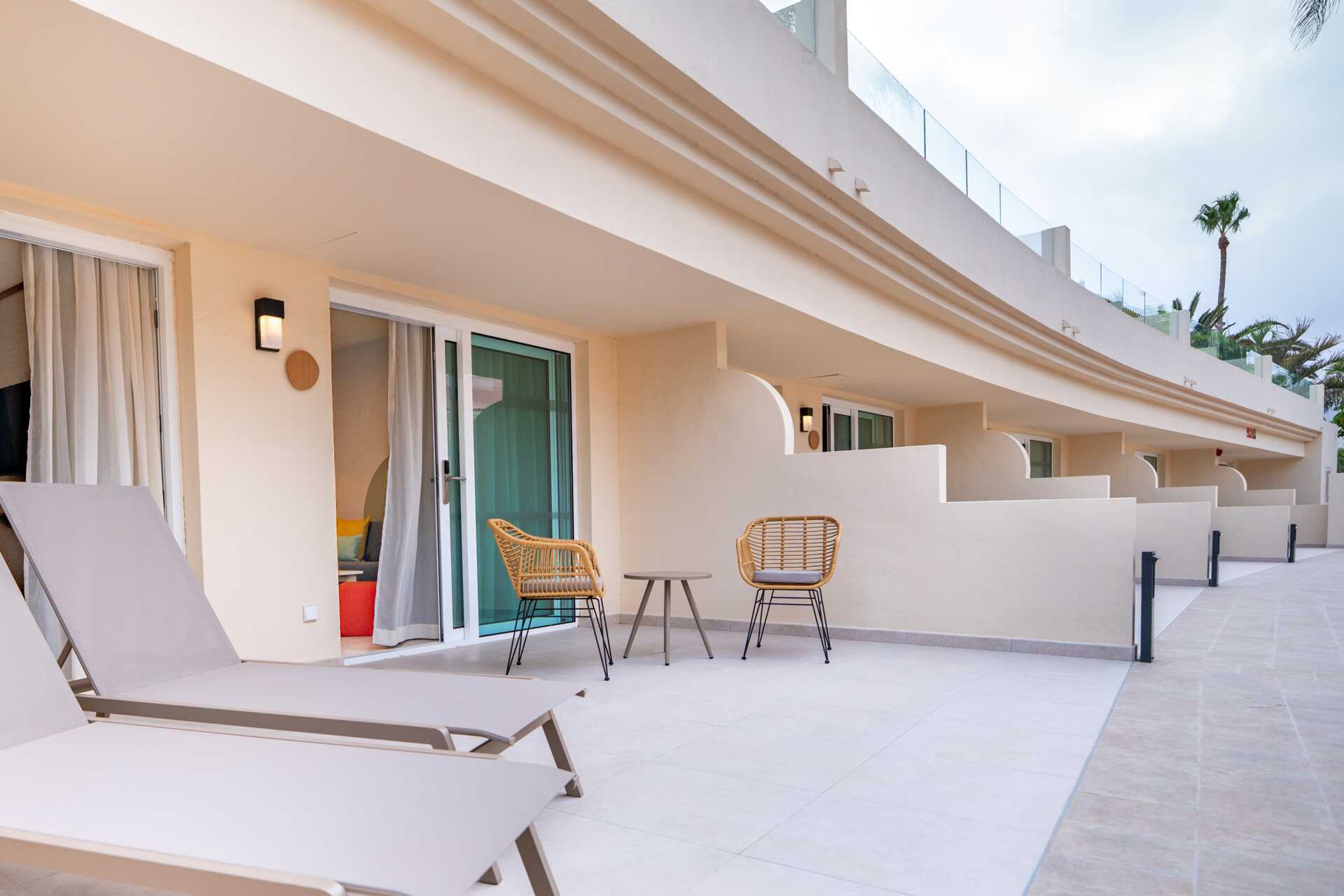 Juniorsviitti, jossa on ulkotila ja jaettu uima-allas. Parivuode. Maksuton wifi, ilmastointi ja tallelokero. Minibaari, päivittäinen täyttö sisältyy hintaan. Tv kansainvälisillä kanavilla. Vedenkeitin, kahvia ja teetä. Nespresso-kahvikone, 6 kapselia sisältyy hintaan ja täytetään päivittäin. Hiustenkuivain. Kylpytakit ja tossut Suihku ja wc. Avoin pohjaratkaisu kylpyhuoneeseen. Siivous 7 krt/viikko.