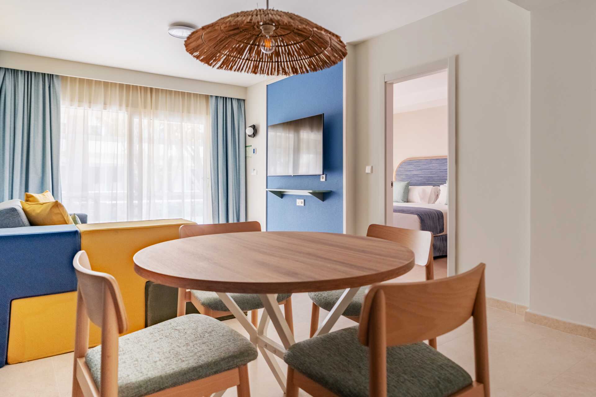 Sviitti parvekkeella, osa näkymä uima-altaalle. Sviitissä on makuuhuone ja olohuone. Parivuode. Lisävuodemahdollisuus vuodesohvasta. Maksuton wifi ja ilmastointi. Tallelokero lisämaksusta. Minibaari lisämaksulla. Tv kansainvälisillä kanavilla. Vedenkeitin, kahvia ja teetä. Videopelikonsoli. Hiustenkuivain. Suihku ja wc. Siivous 7 krt/viikko.