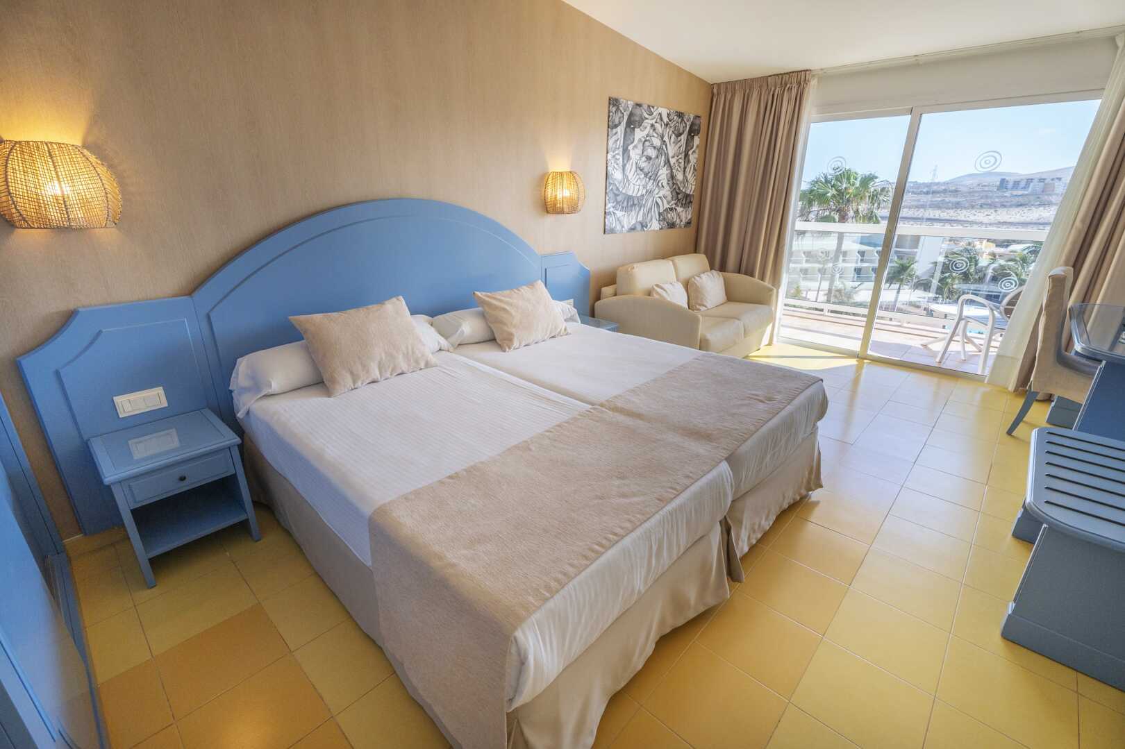 Kahden hengen huone parvekkeella tai terassilla. Kaksi erillistä vuodetta. Lisävuodemahdollisuus vuodesohvalla. Maksuton wifi ja ilmastointi. Tallelokero lisämaksulla. Tv kansainvälisillä kanavilla. Hiustenkuivain. Kylpyhuoneessa suihku ja wc. Siivous 7 krt/viikko. Alle 2-vuotiaat lapset lasketaan lisävuoteella majoittuviksi henkilöiksi.