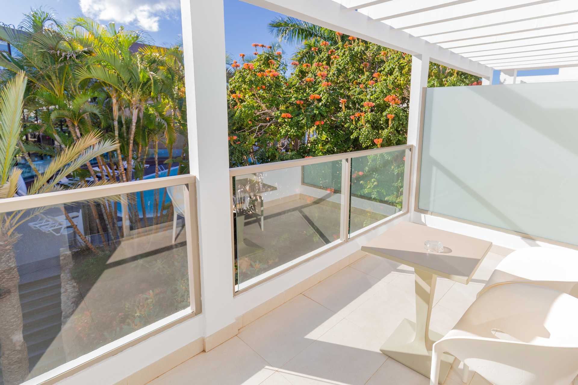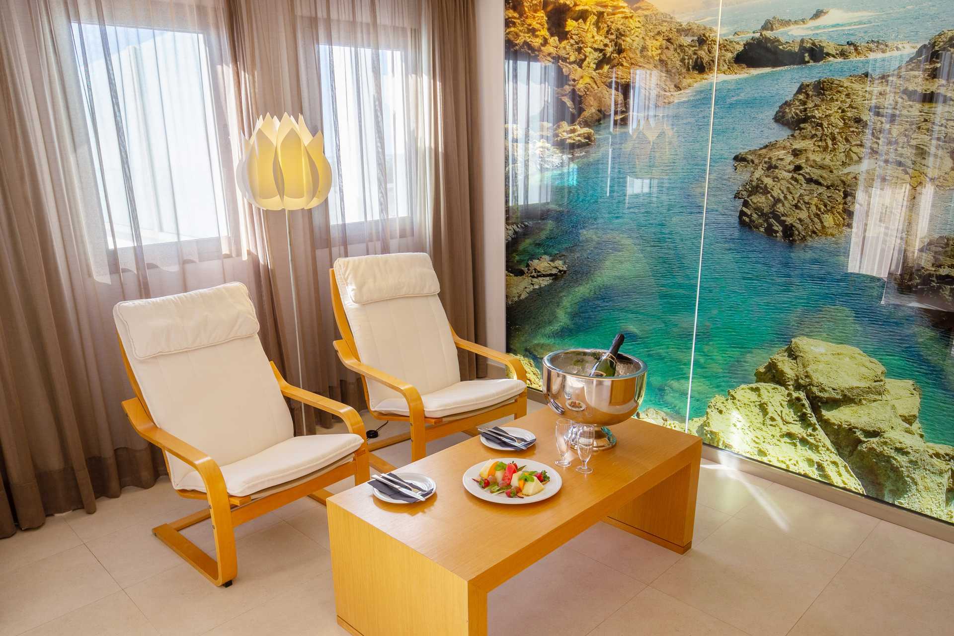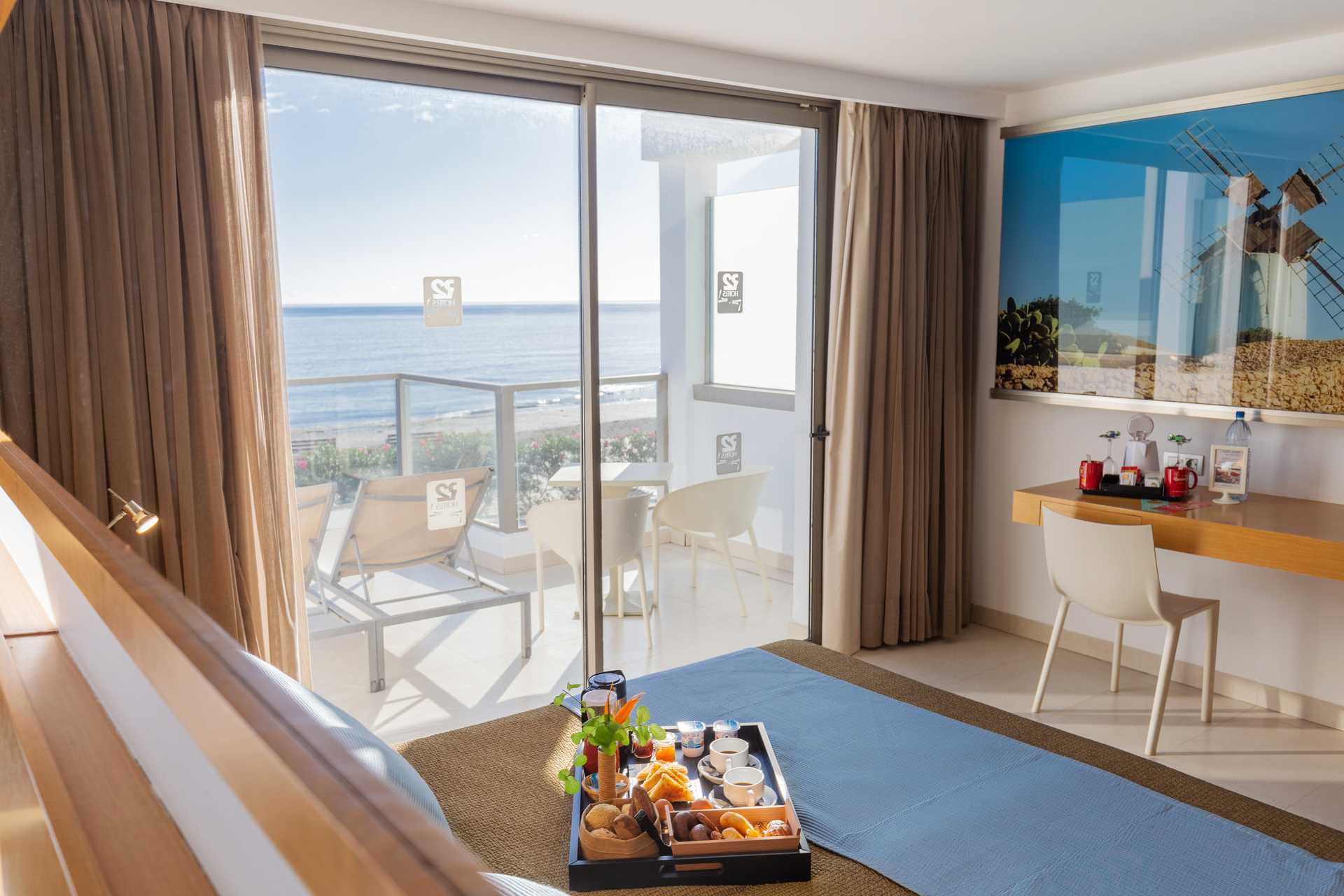 Juniorsviitti parvekkeella tai terassilla ja näkymä uima-altaalle tai merinäköala. Merinäköalalla varustetussa junior-sviitissä on parvekkeella kaksi aurinkotuolia. Istuinryhmä. Wifi ja keskusohjattu ilmastointi sisältyvät hintaan. Tallelokero lisämaksusta. Kaksi yhden hengen sänkyä. Minibaari. Tv kansainvälisillä kanavilla. Hiustenkuivain. Kylpyamme tai suihku ja wc. Huurrelasiseinä kylpyhuoneen ja makuuhuoneen välissä. Siivous 7 krt/viikko.