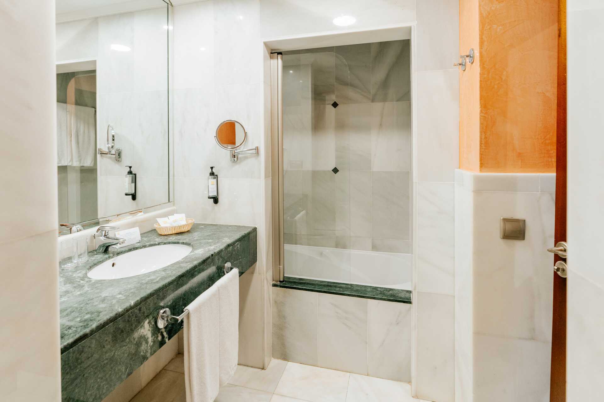 Perhehuone parvekkeella tai terassilla. Perhehuone koostuu kahdesta huoneesta, joilla on yhteinen sisäänkäynti ja käynti huoneisiin käytävän kautta. Yhdessä huoneessa on parivuode ja toisessa kaksi erillistä sänkyä. Maksuton ilmastointi. Wifi ja tallelokero lisämaksusta. Minibaari. Smart-tv kansainvälisillä kanavilla. Hiustenkuivain. Huoneiden kesken jaettu kylpyhuone, jossa on kylpyamme tai suihku ja wc. Siivous 7 krt/viikko.