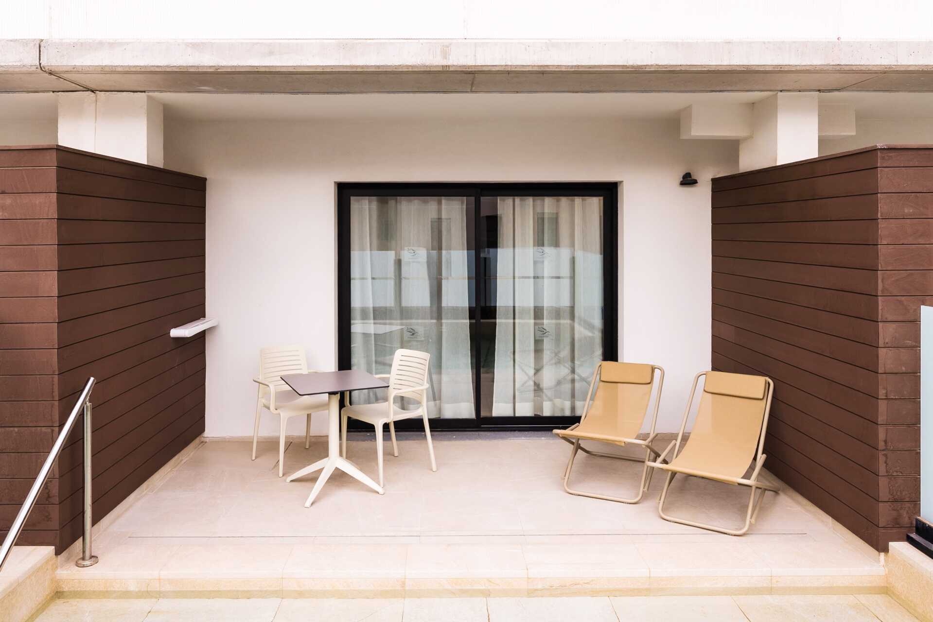 Kolmio parvekkeiella ja terassilla. Kaksi makuuhuonetta sekä yhdistetty olohuone/minikeittiö. Minikeittiössä keittolevyt, jääkaappi, kahvinkeitin, vedenkeitin ja yksinkertainen keittiövarustus. Maksuton wifi, ilmastointi ja tallelokero. Tv kansainvälisillä kanavilla. Hiustenkuivain. Kylpyhuoneessa suihku ja wc. Siivous 7 krt/viikko.
