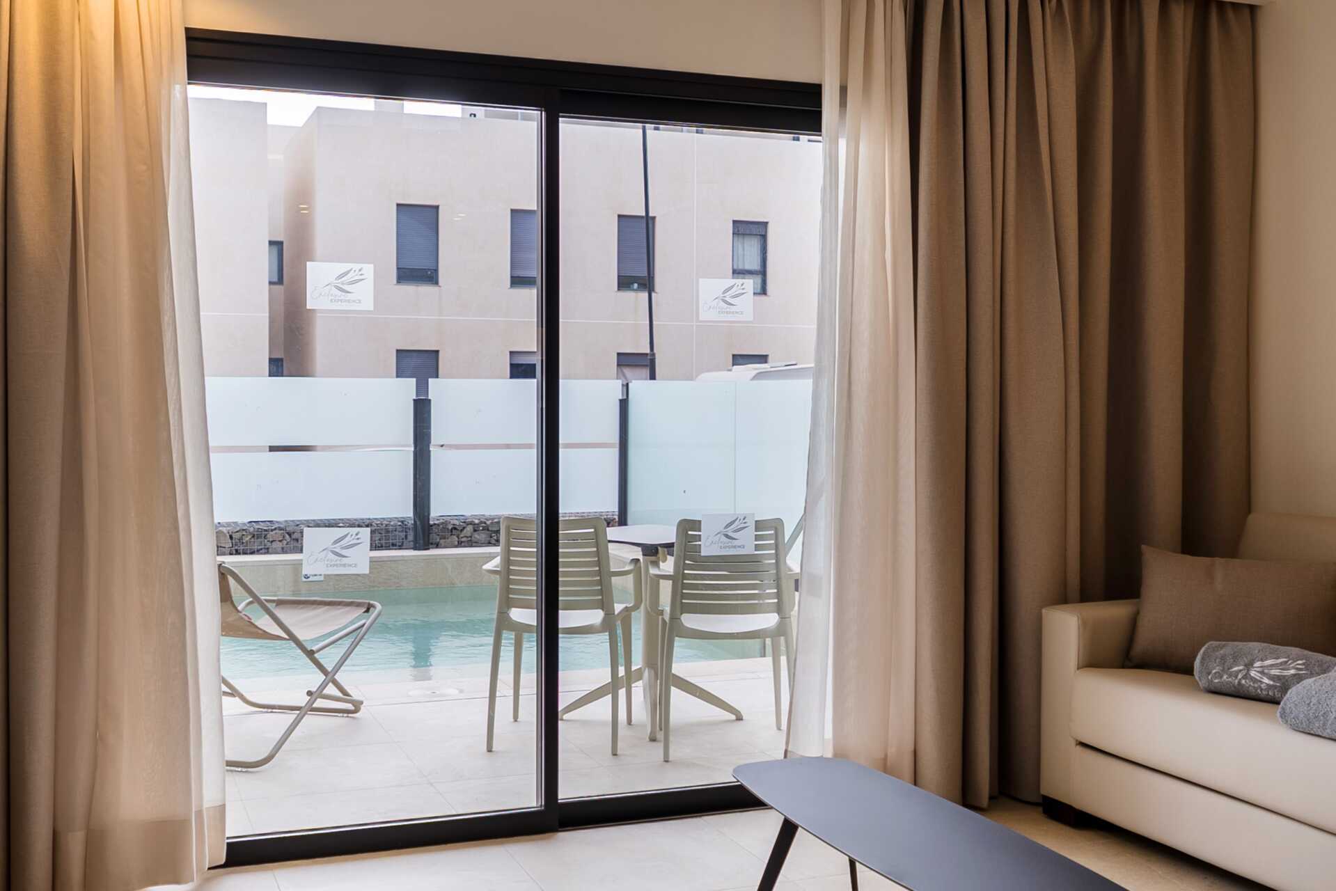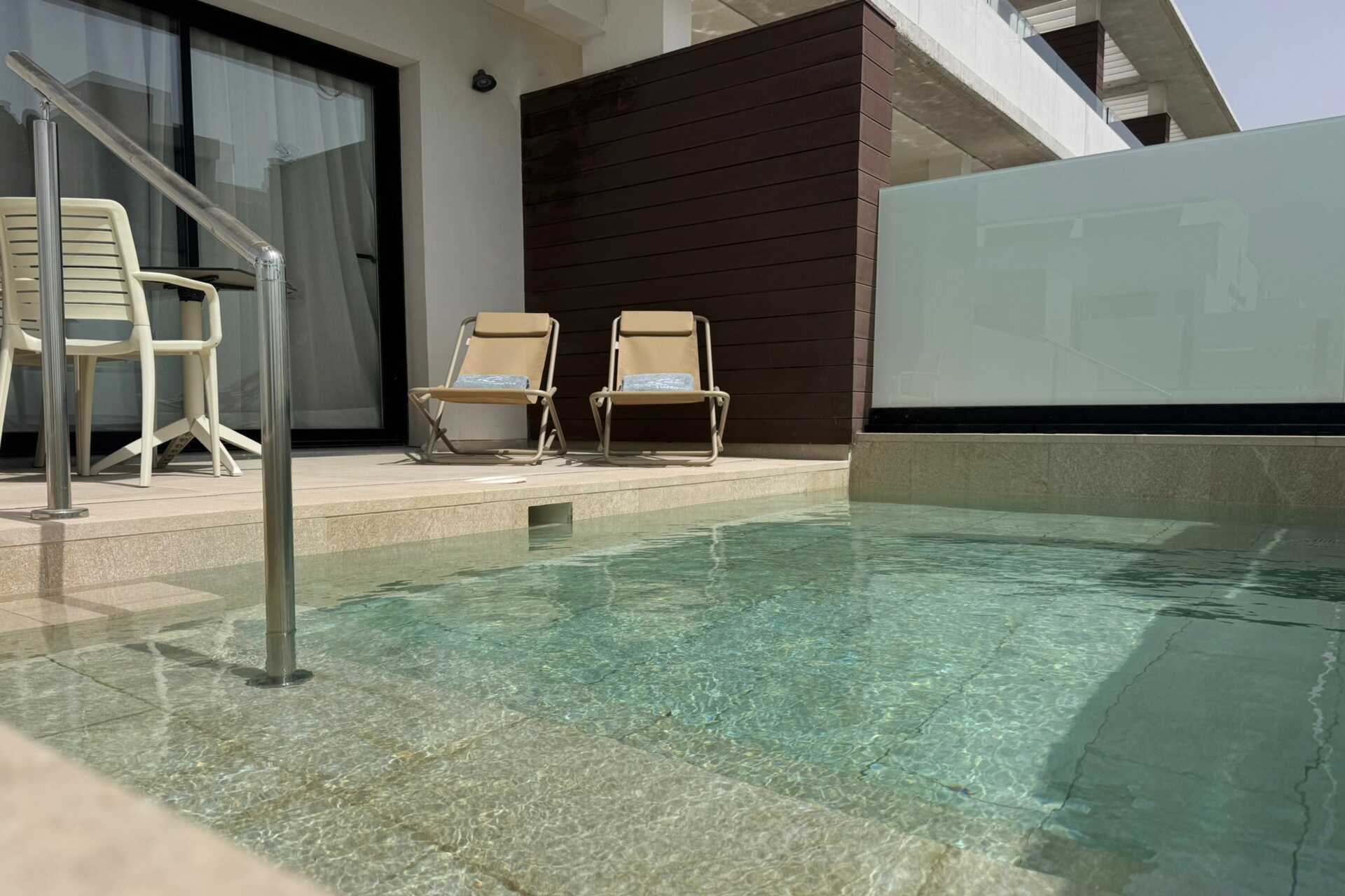 Kolmio omalla uima-altaalla ulkotilassa. Kaksi makuuhuonetta sekä yhdistetty olohuone/minikeittiö. Minikeittiössä keittolevyt, jääkaappi, kahvinkeitin, vedenkeitin, kahvia ja teetä sekä yksinkertainen keittiövarustus. Maksuton wifi, ilmastointi ja tallelokero. Tv kansainvälisillä kanavilla. Hiustenkuivain. Kylpyhuoneessa suihku ja wc. Siivous 7 krt/viikko.